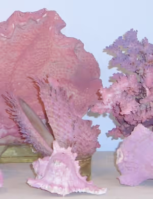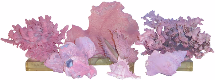 A collection of corals and shells of the most unusual, but natural, lilac-pink colour. Seven elements in total, of which 4 are set on an acrylic base.