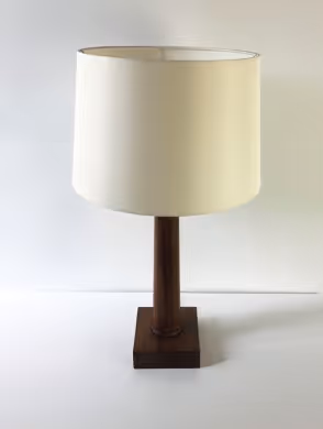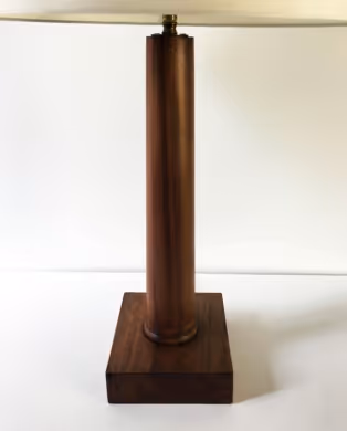 An oak column table lamp in the style of Jean-Michel Frank. Rewired and PAT-certified, new silk shade