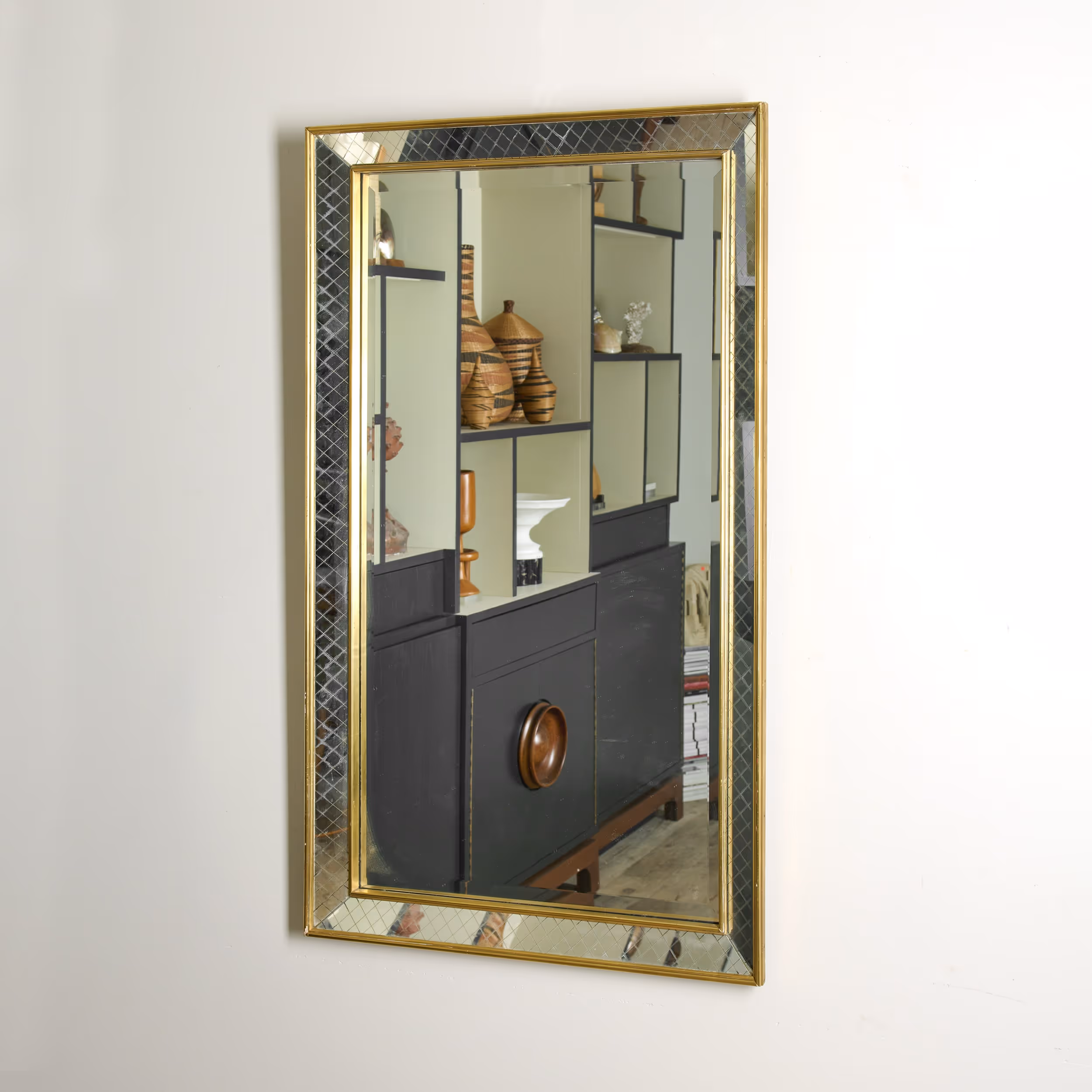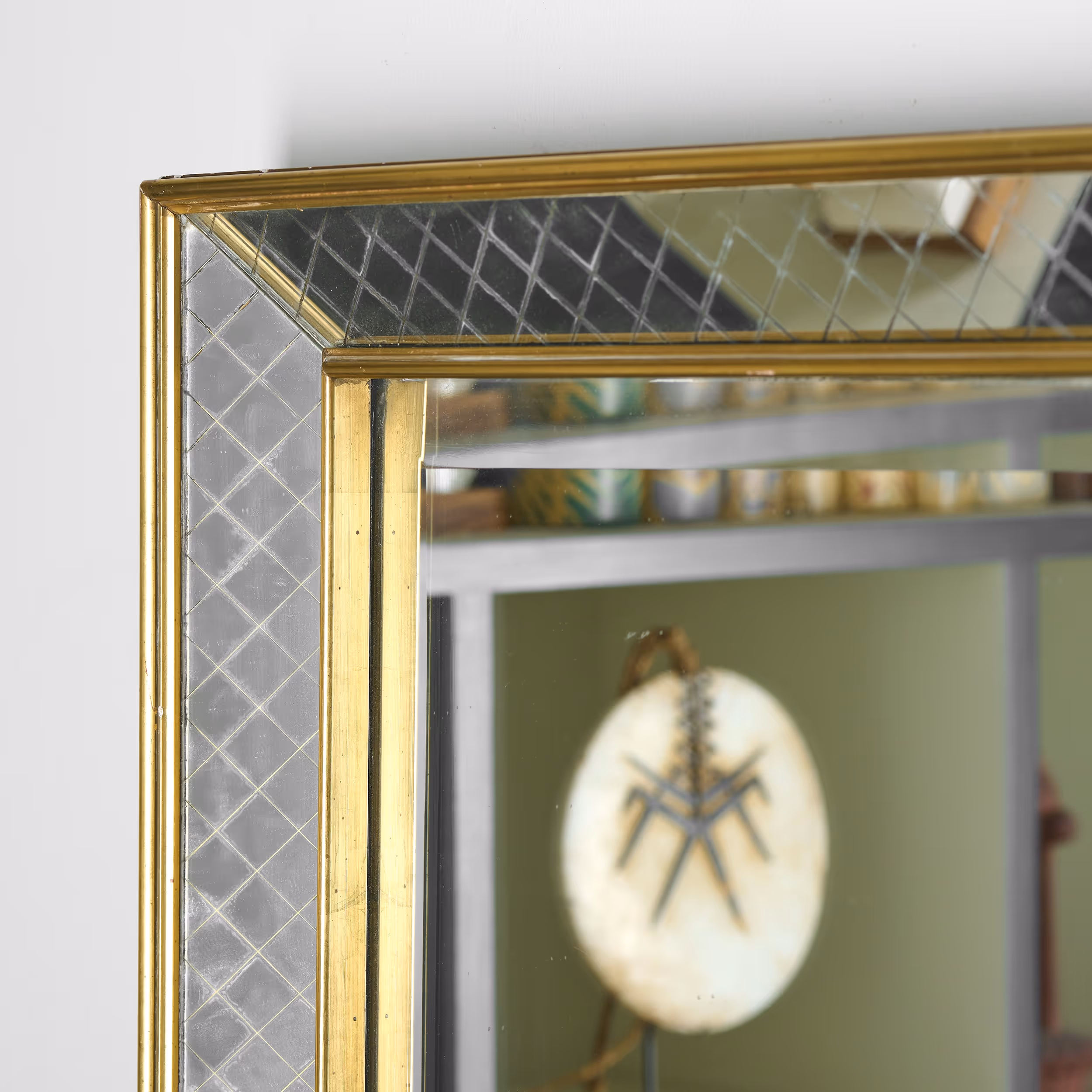 Large with giltwood and crisscross-etched mirror frame, original bevelled plate.