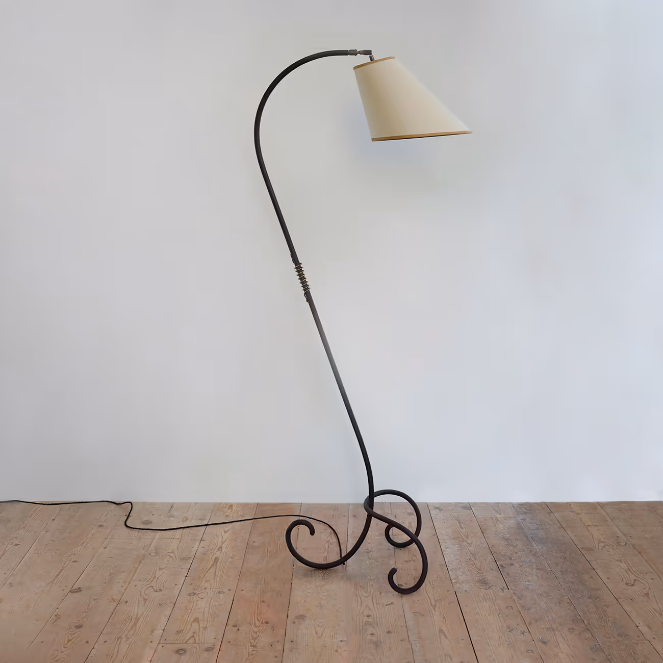 Arched, black steel floor lamp with curved tripod base and brass handle detail.