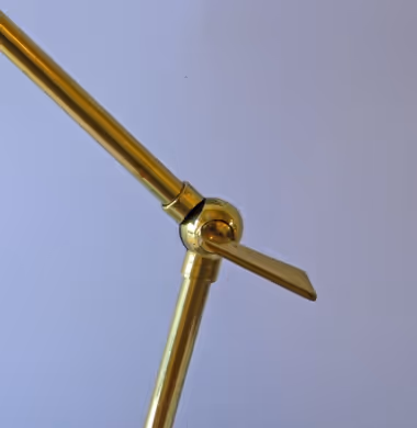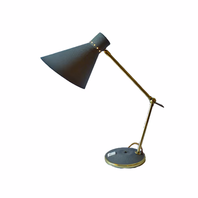 A grey enamel and brass adjustable desk lamp.