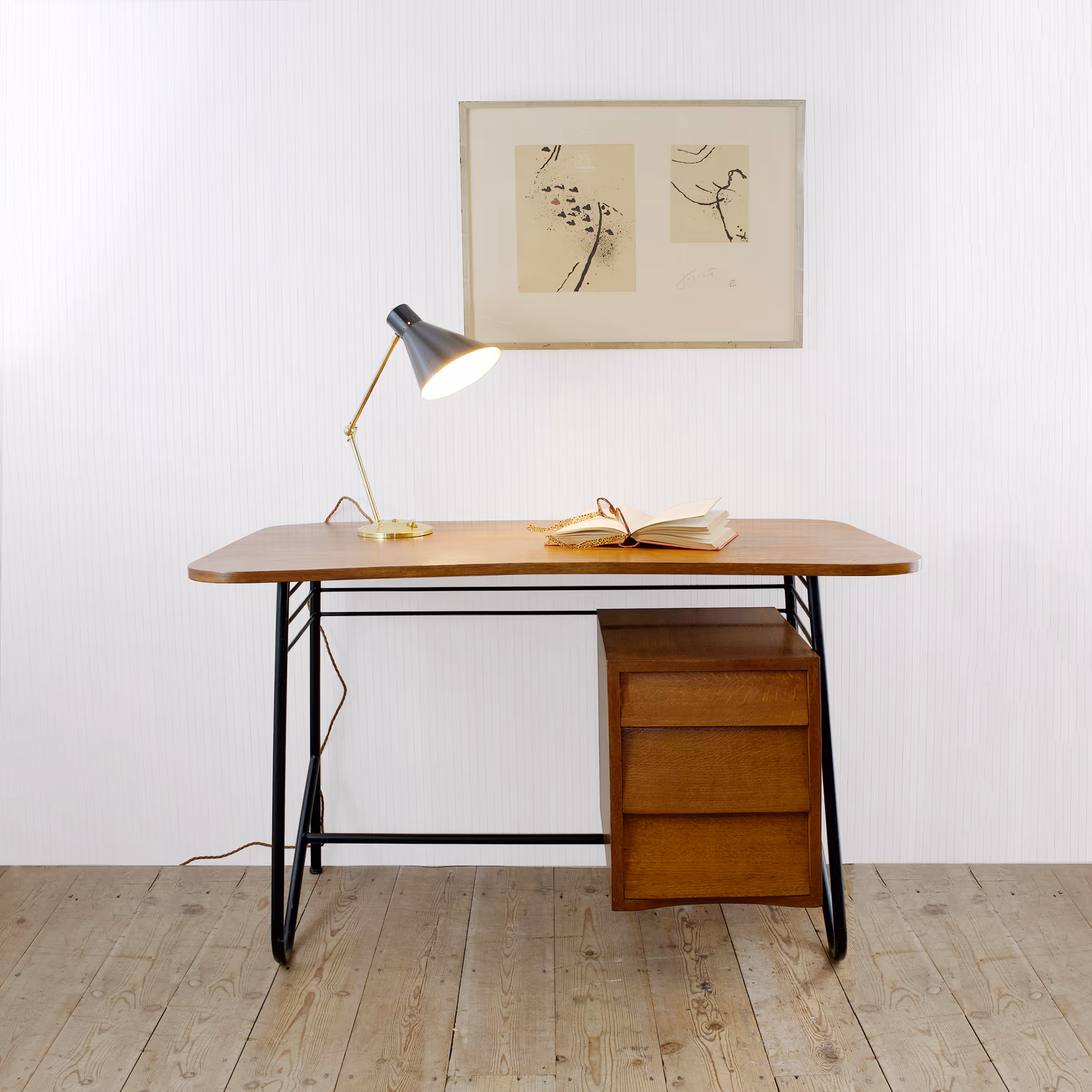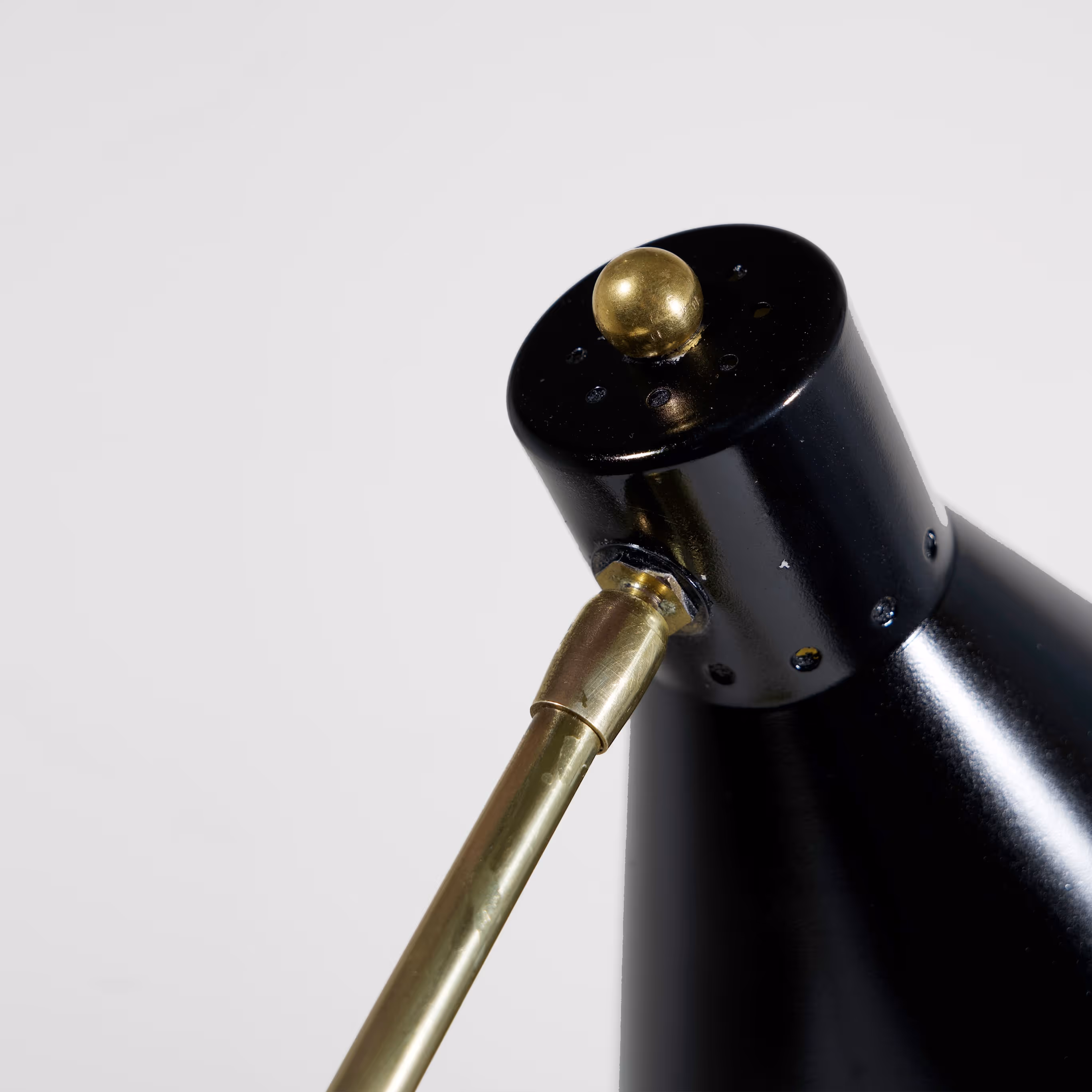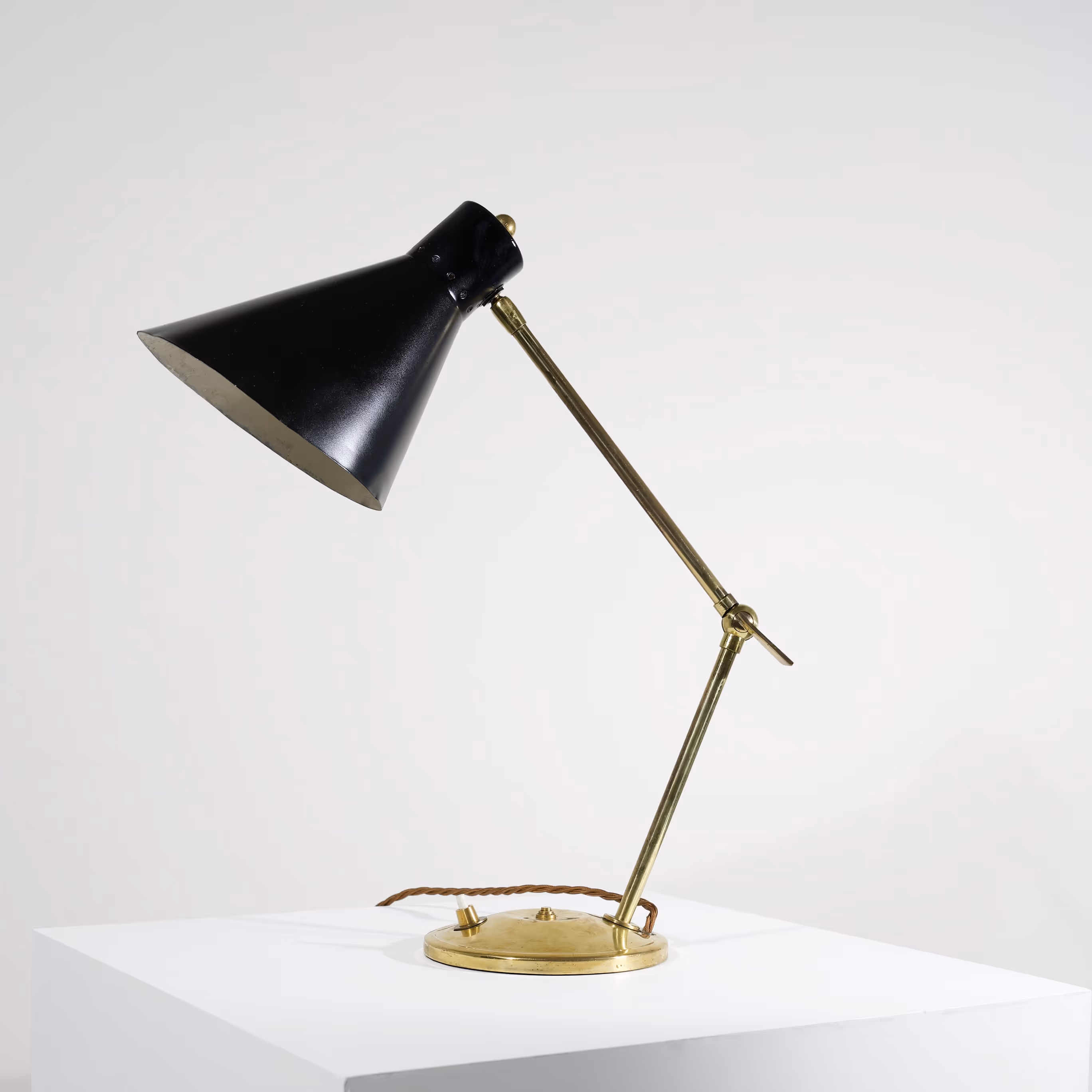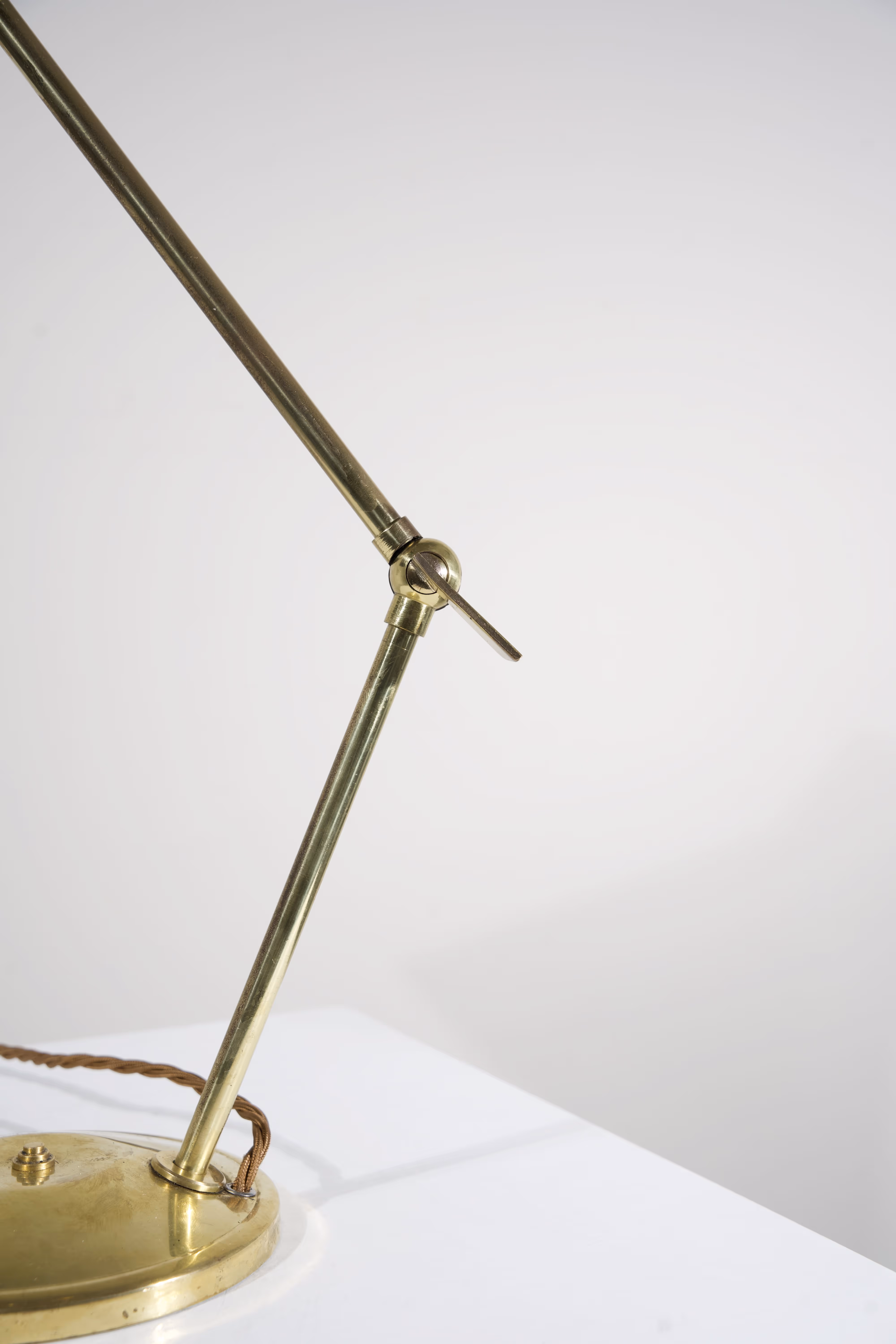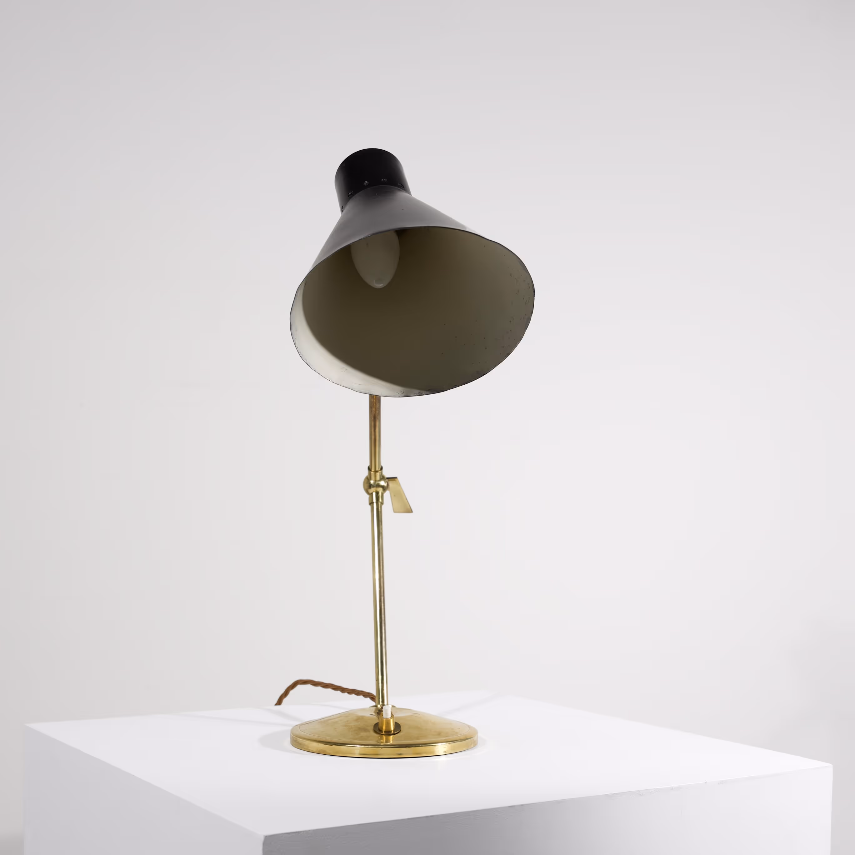 Brass desk lamp with black, conical metal shade. Shade recently resprayed, some bashing.