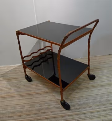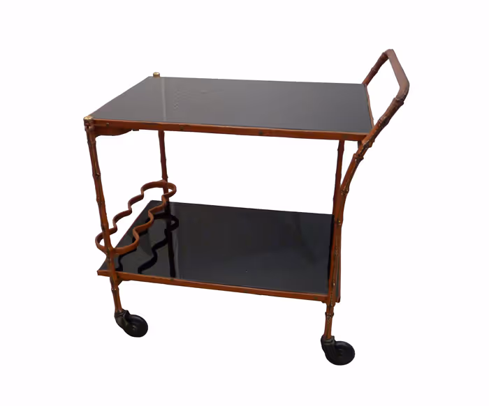 Drinks trolley by Jacques Adnet: clad in contrast-stitched leather, newly replaced black glass top, two-tiered, bottle holder; brass details; original casters