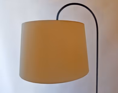 An arched black metal floor lamp with a tripod base and curled feet Rewired & PAT-certified, new silk shade