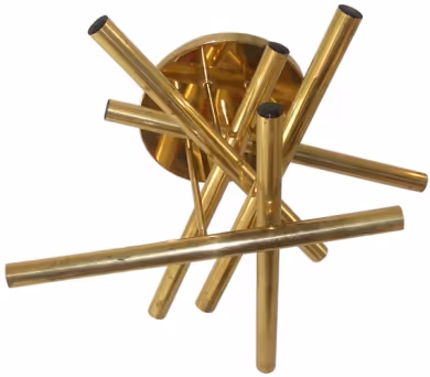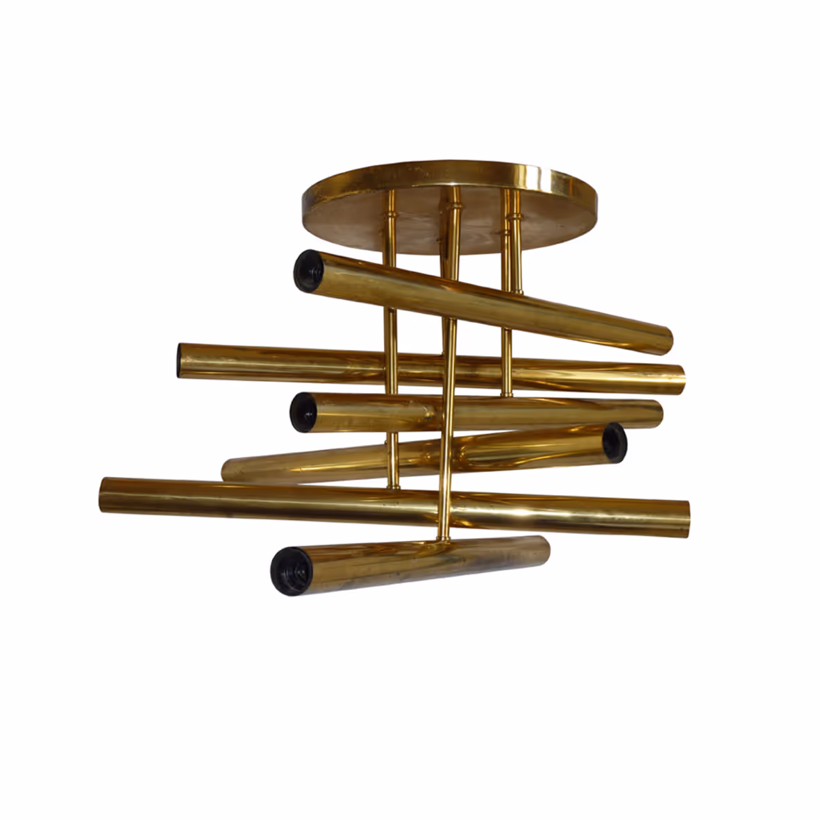 A flush ceiling light made of brass tubes in a chaotic construction. Bulbs to be fitted at either end of each tube. Rewired and PAT-certified
