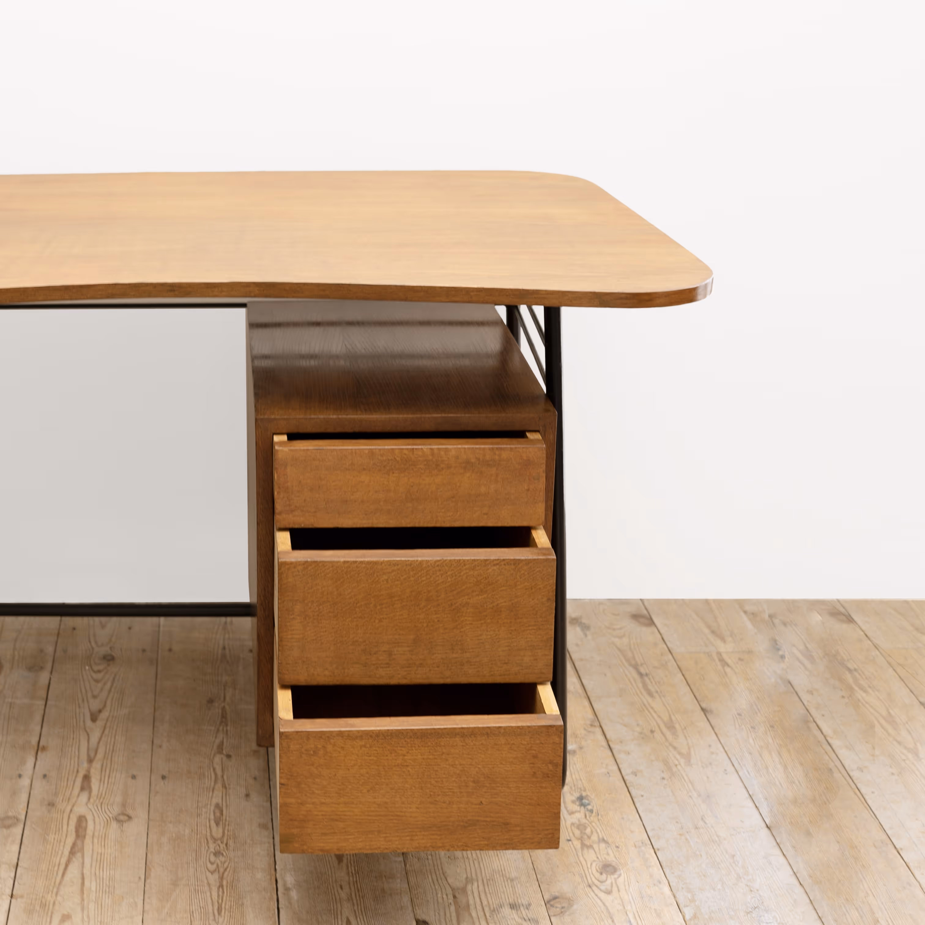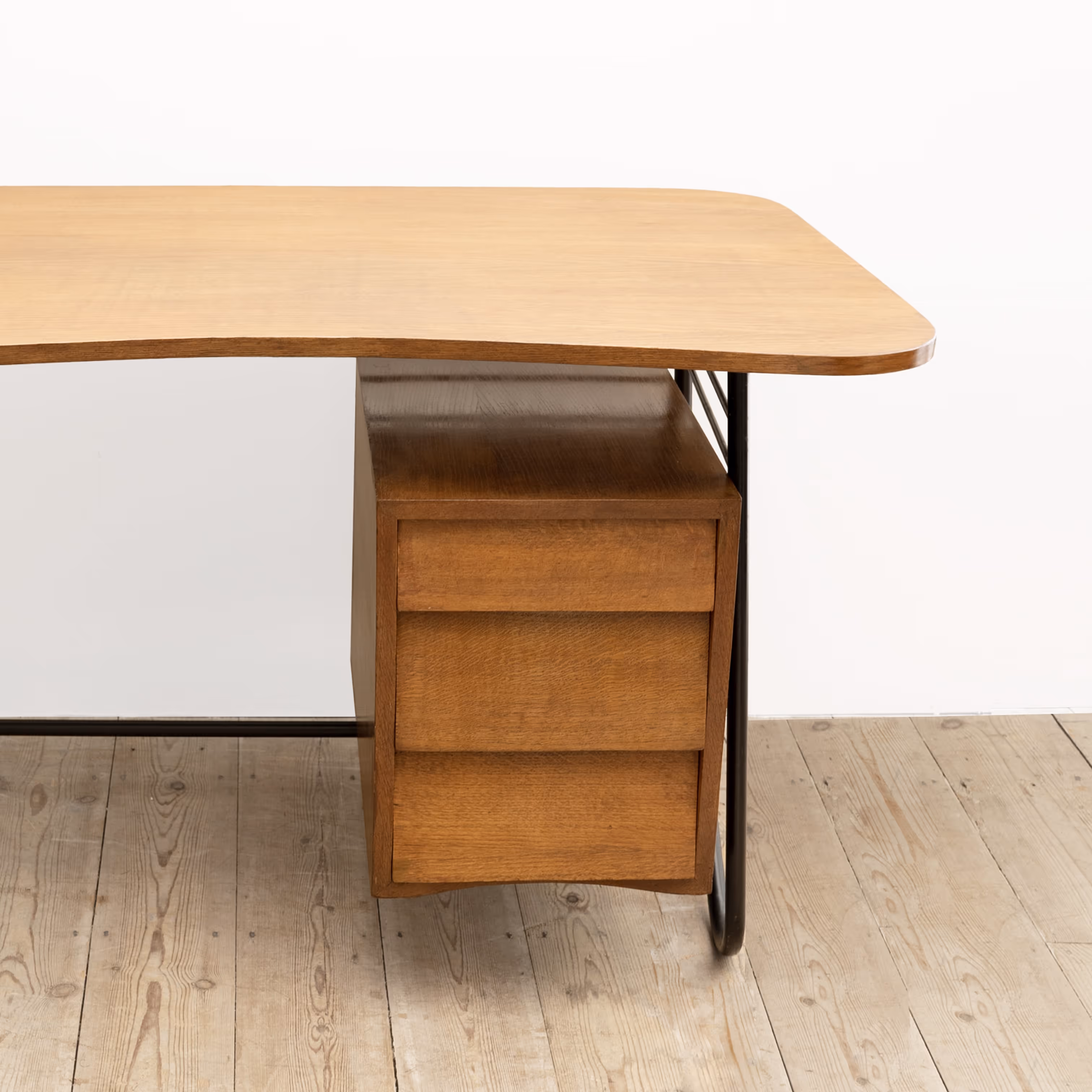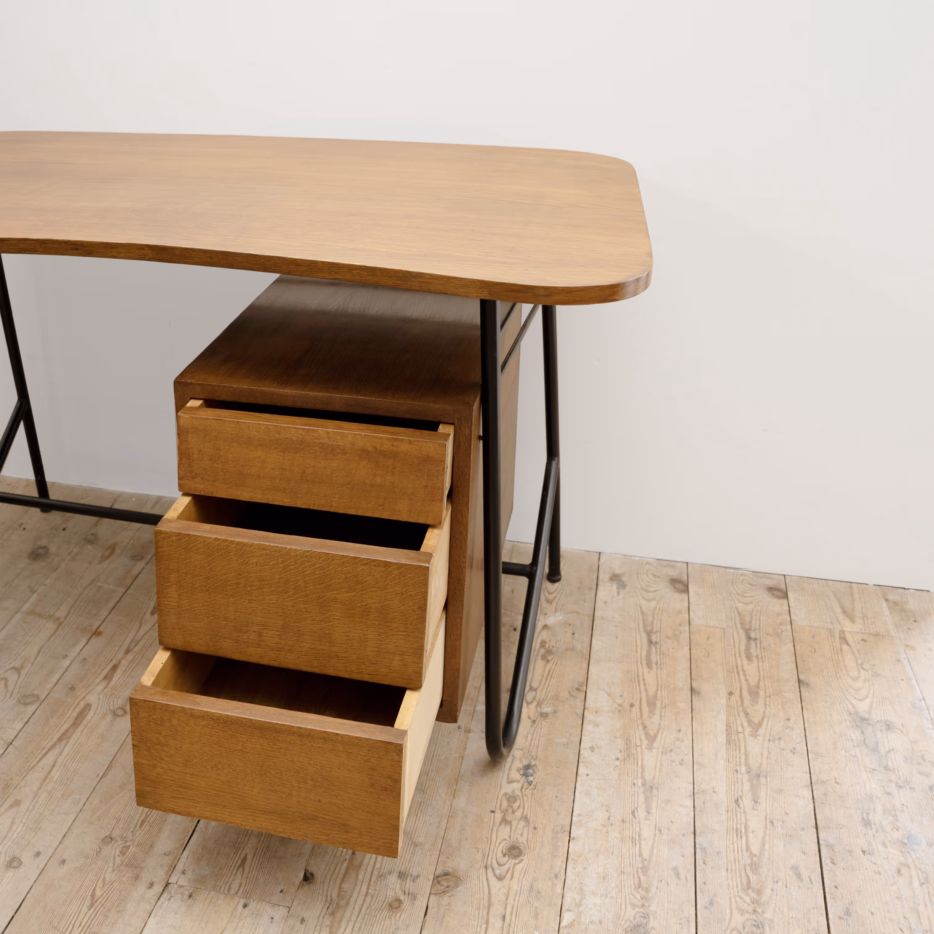 Freeform top, black steel coated base. Oak-veneered top and three drawers with slanted facades.