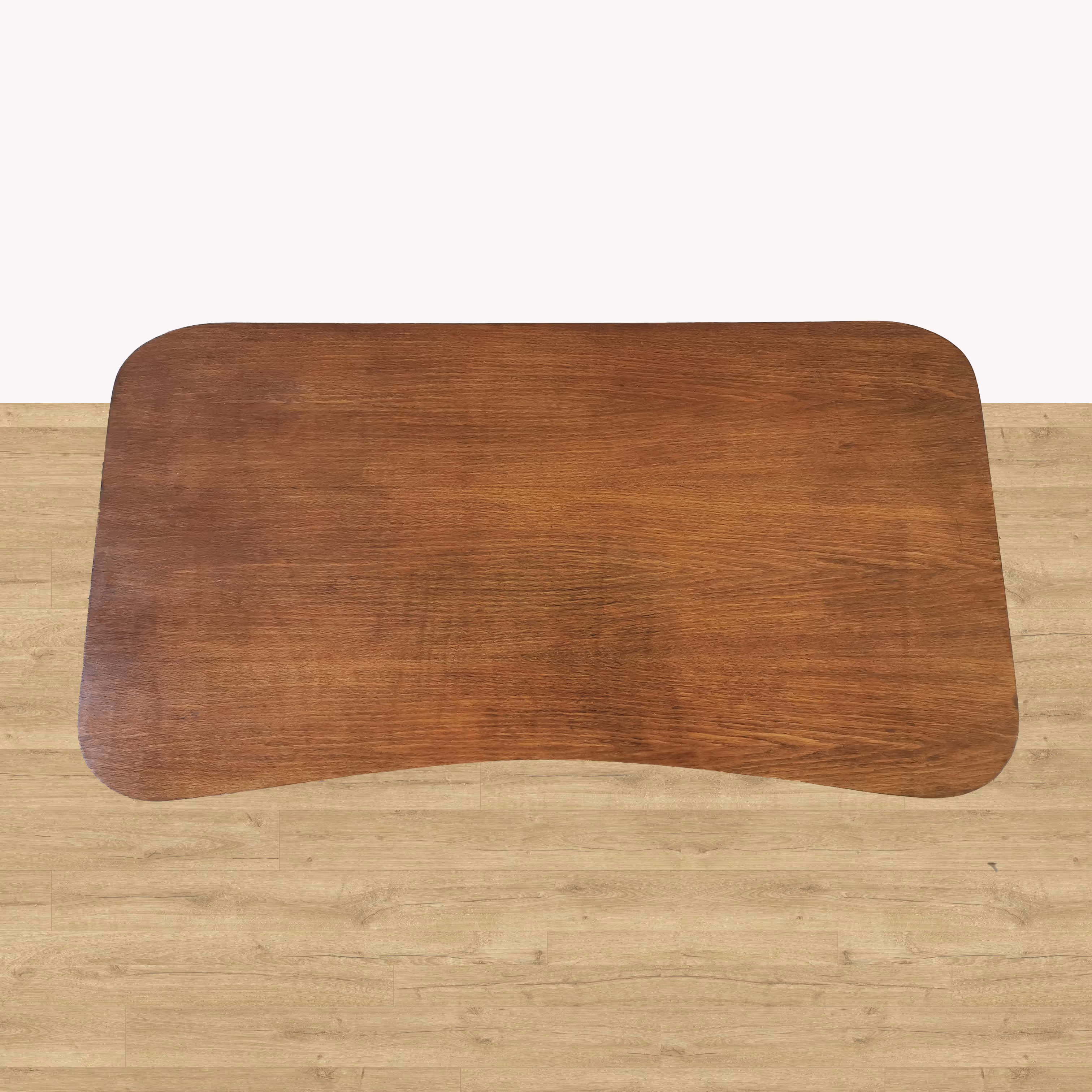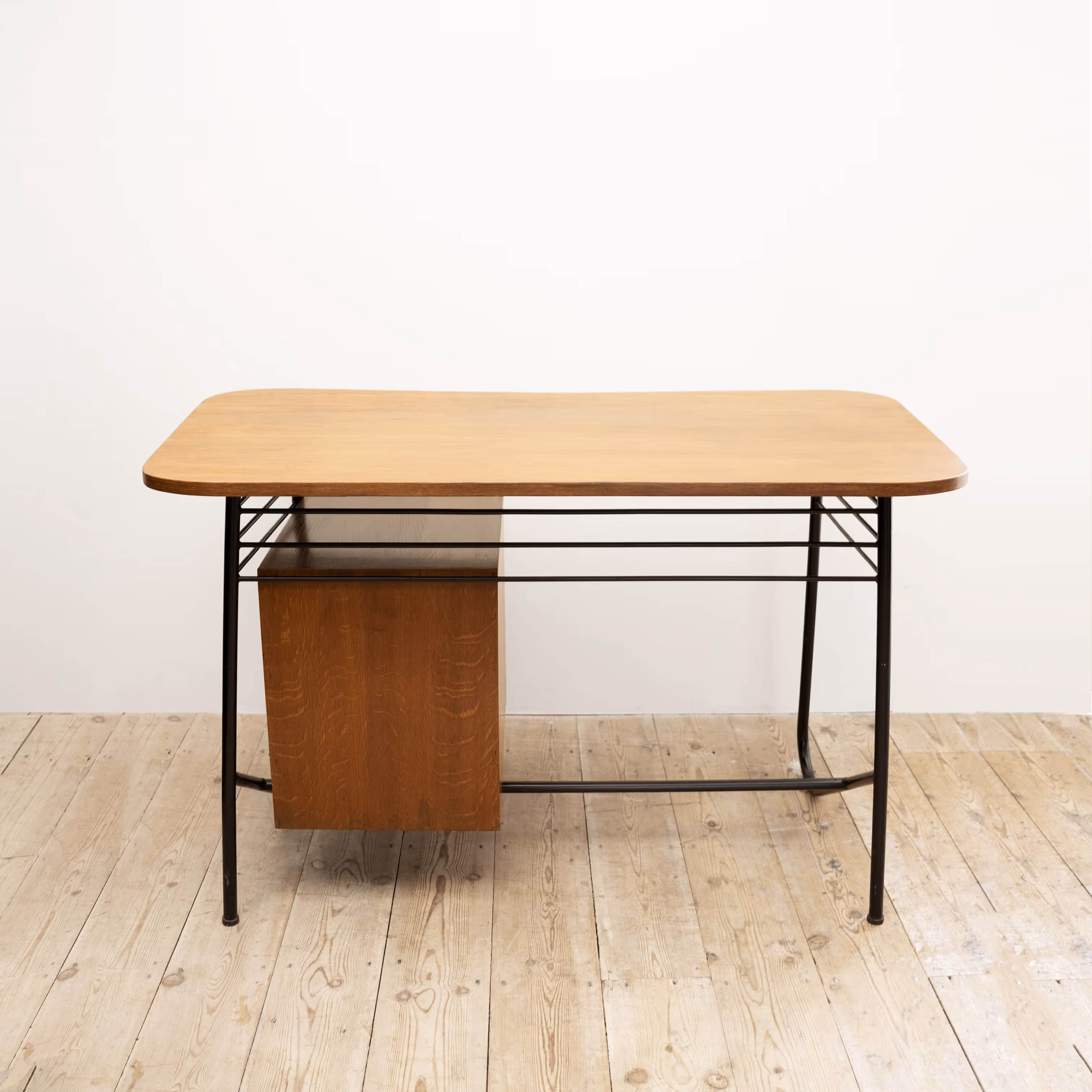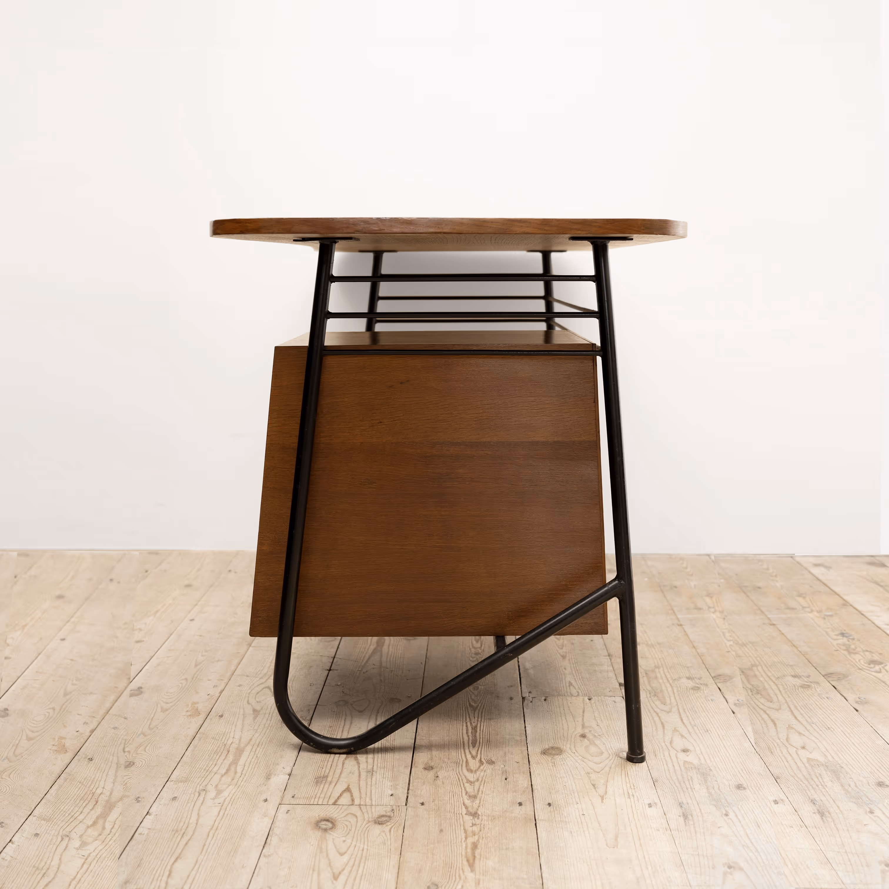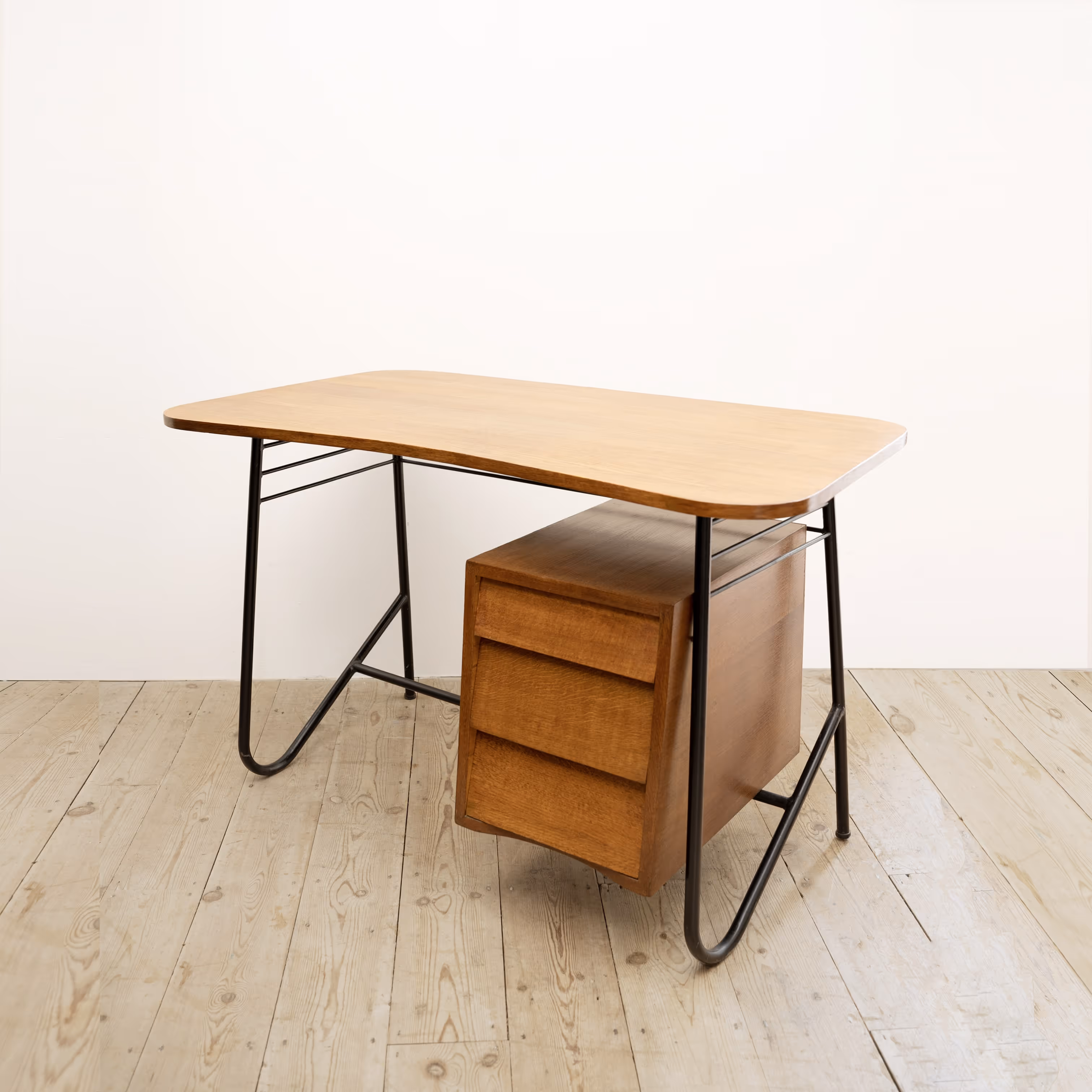 Freeform top, black steel coated base. Oak-veneered top and three drawers with slanted facades.