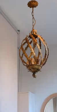 A gilt metal pendant light in the shape of a cage covered in foliage. Rewired and PAT-certified
