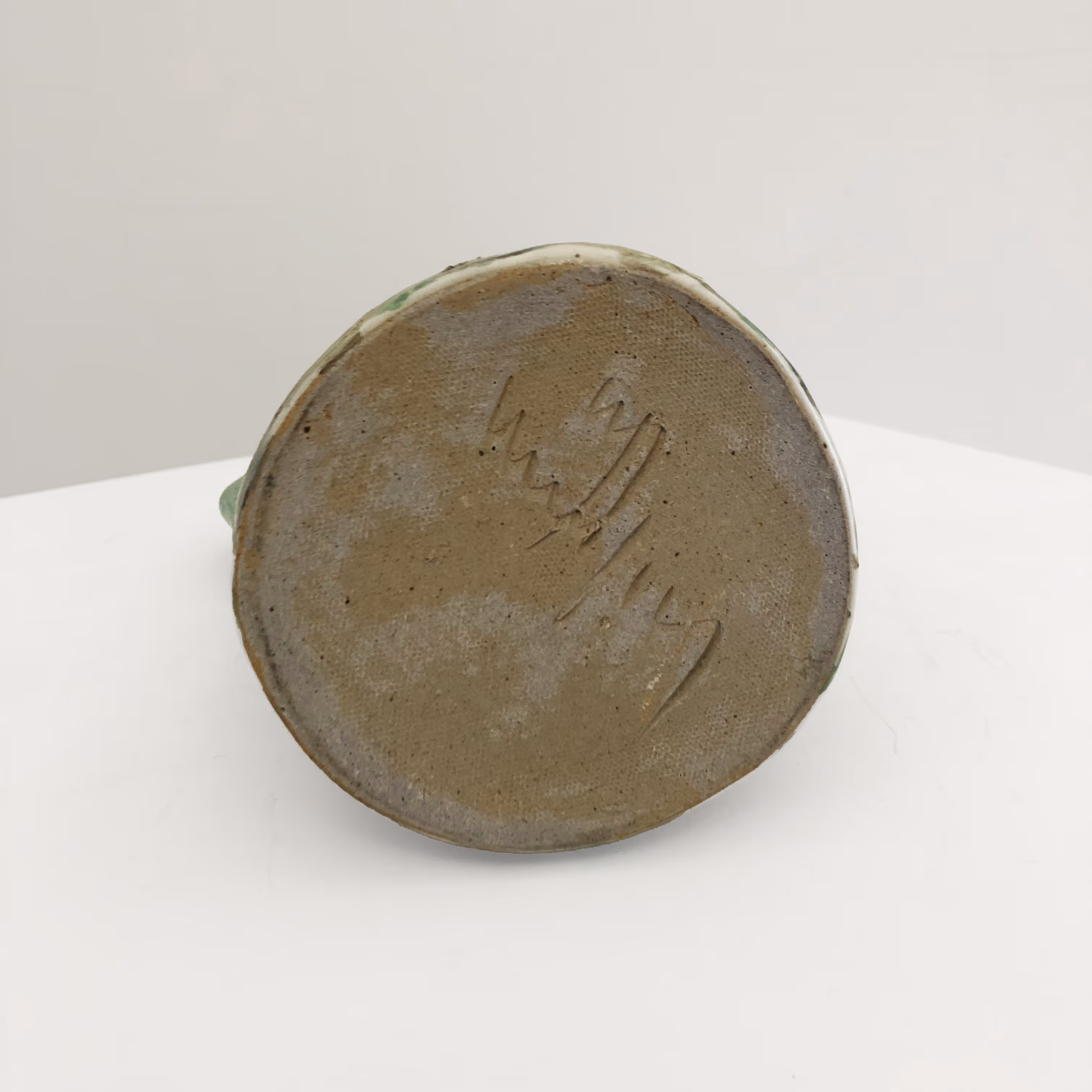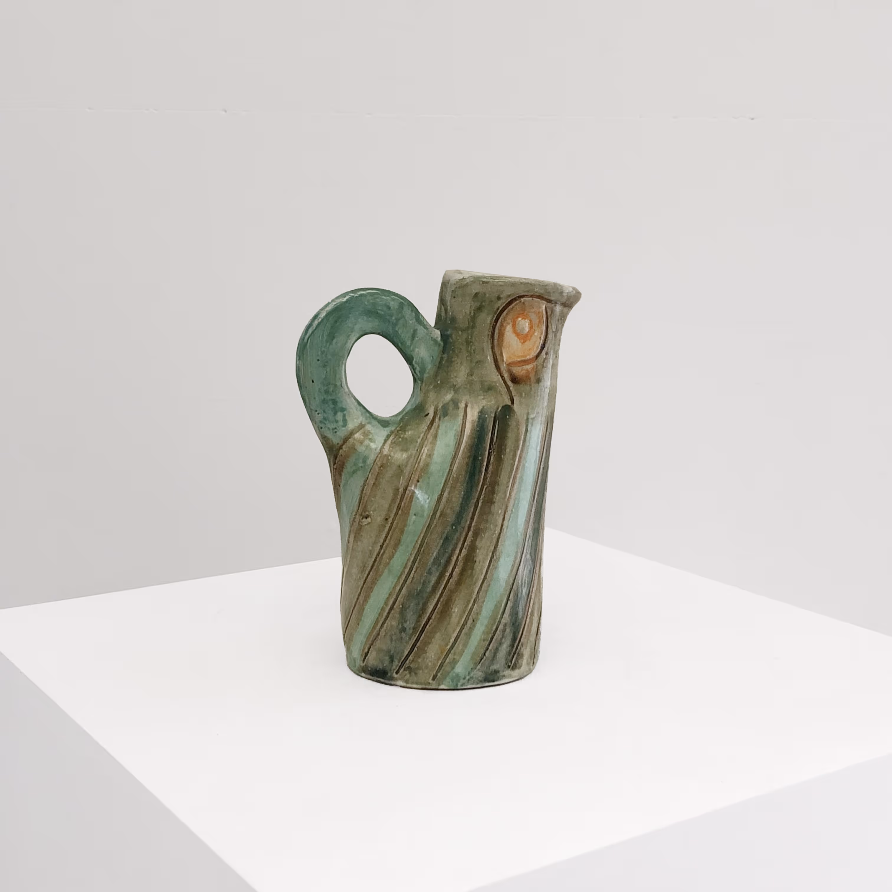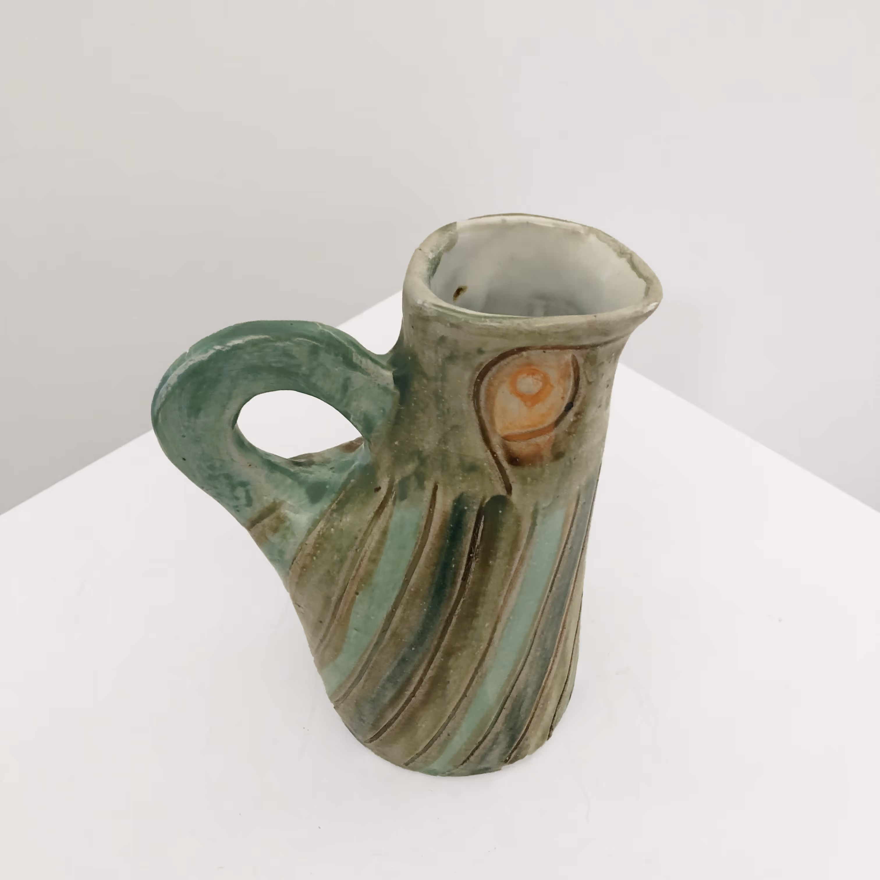 A green and white glazed jug in a stylised bird shape. Indistinctly signed.