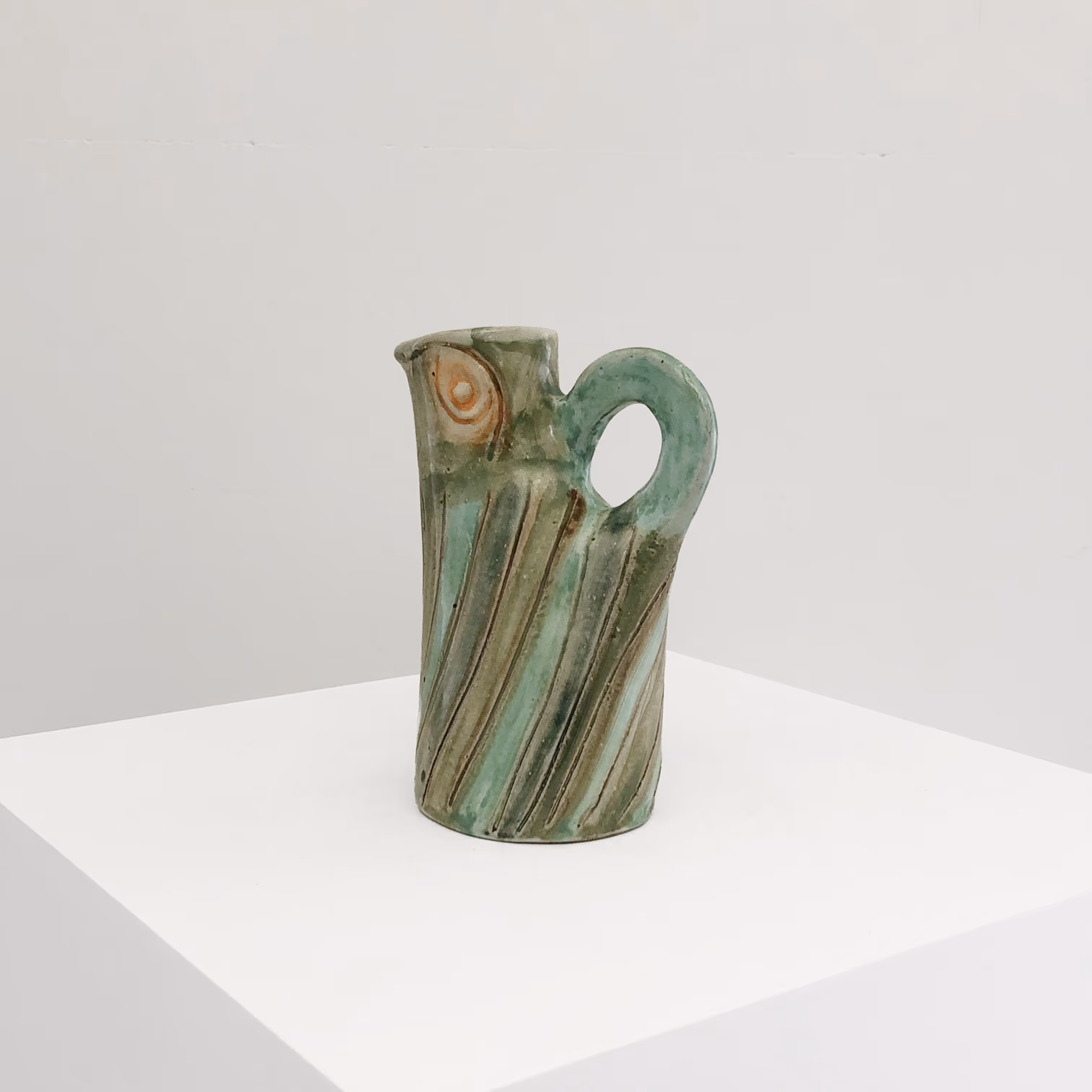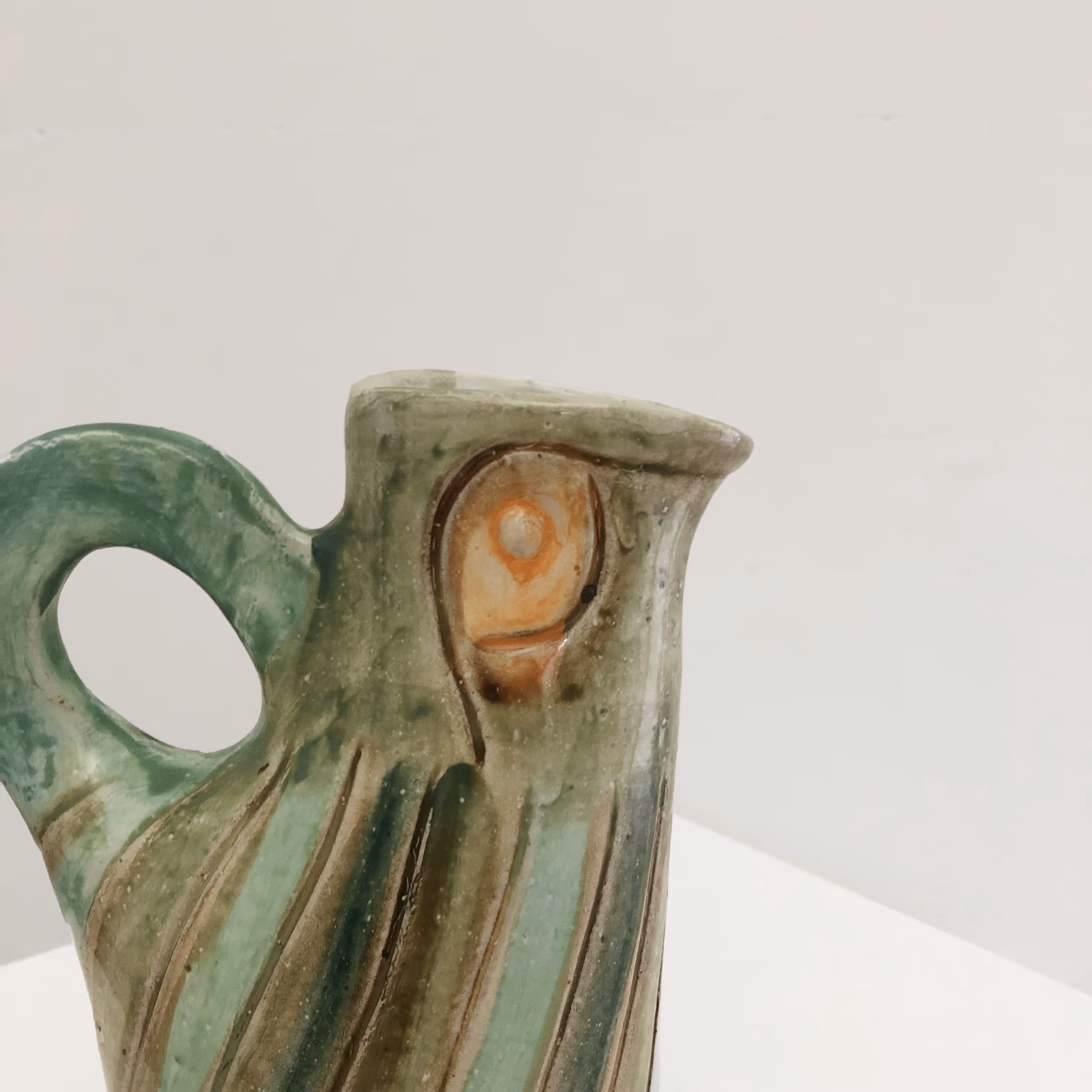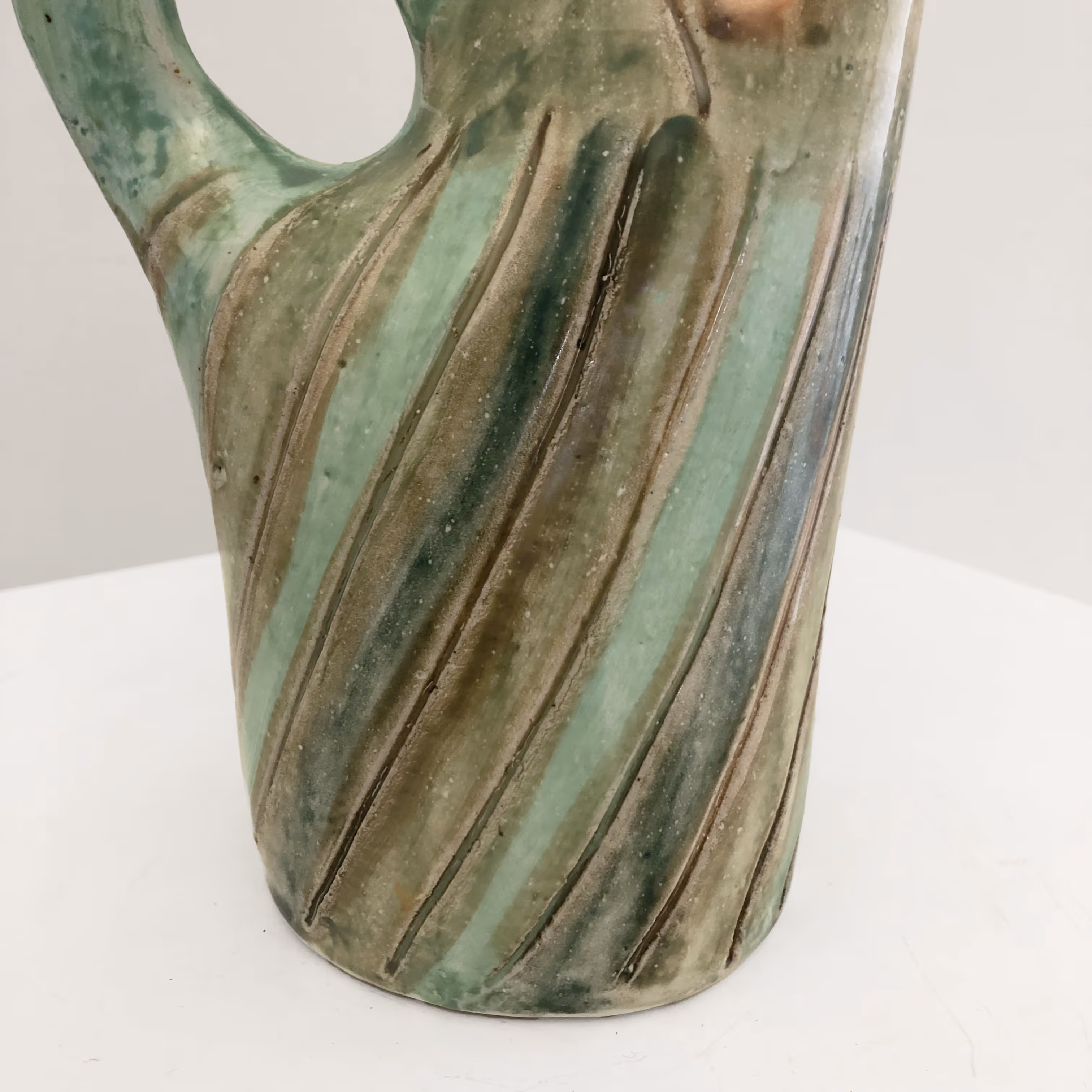 A green and white glazed jug in a stylised bird shape. Indistinctly signed.