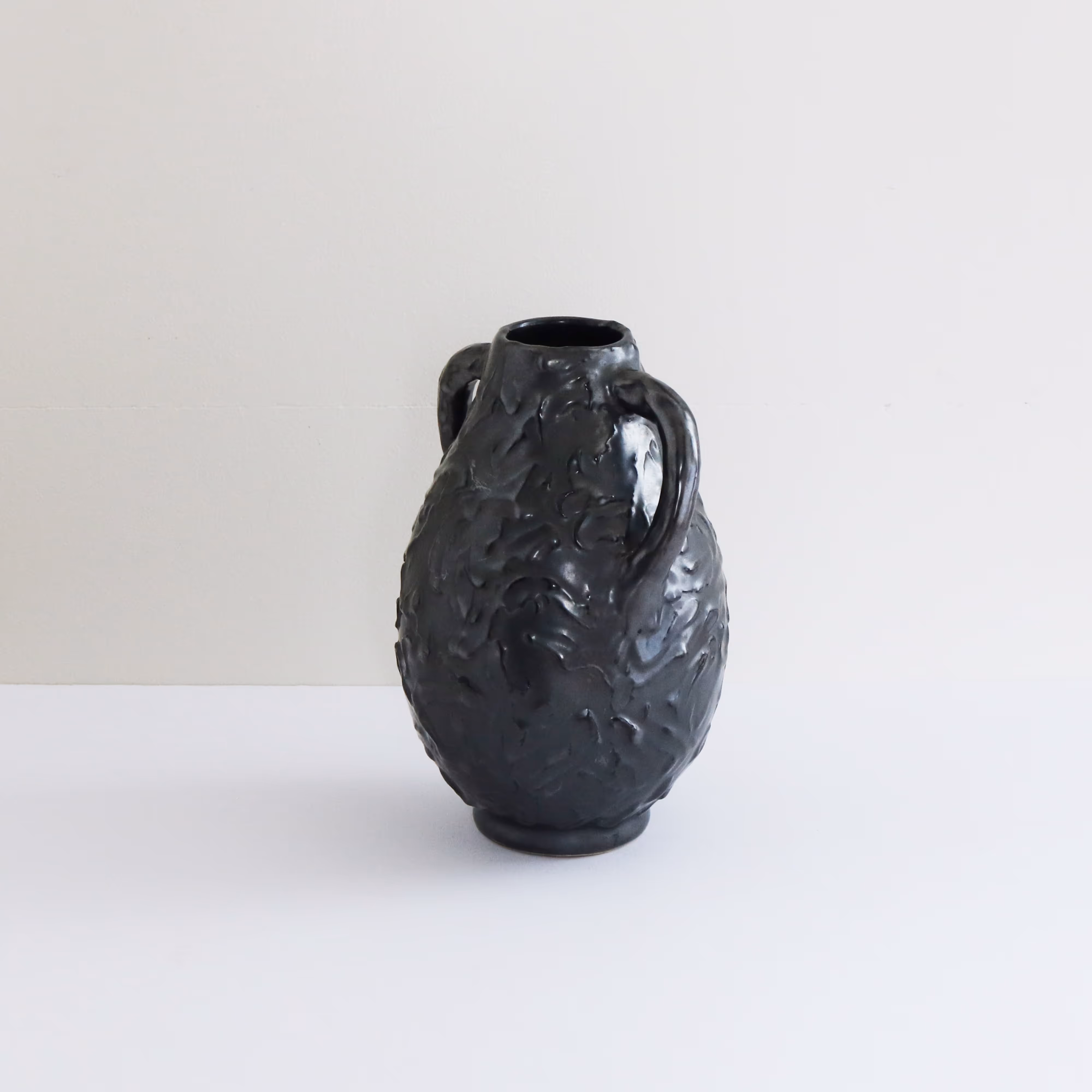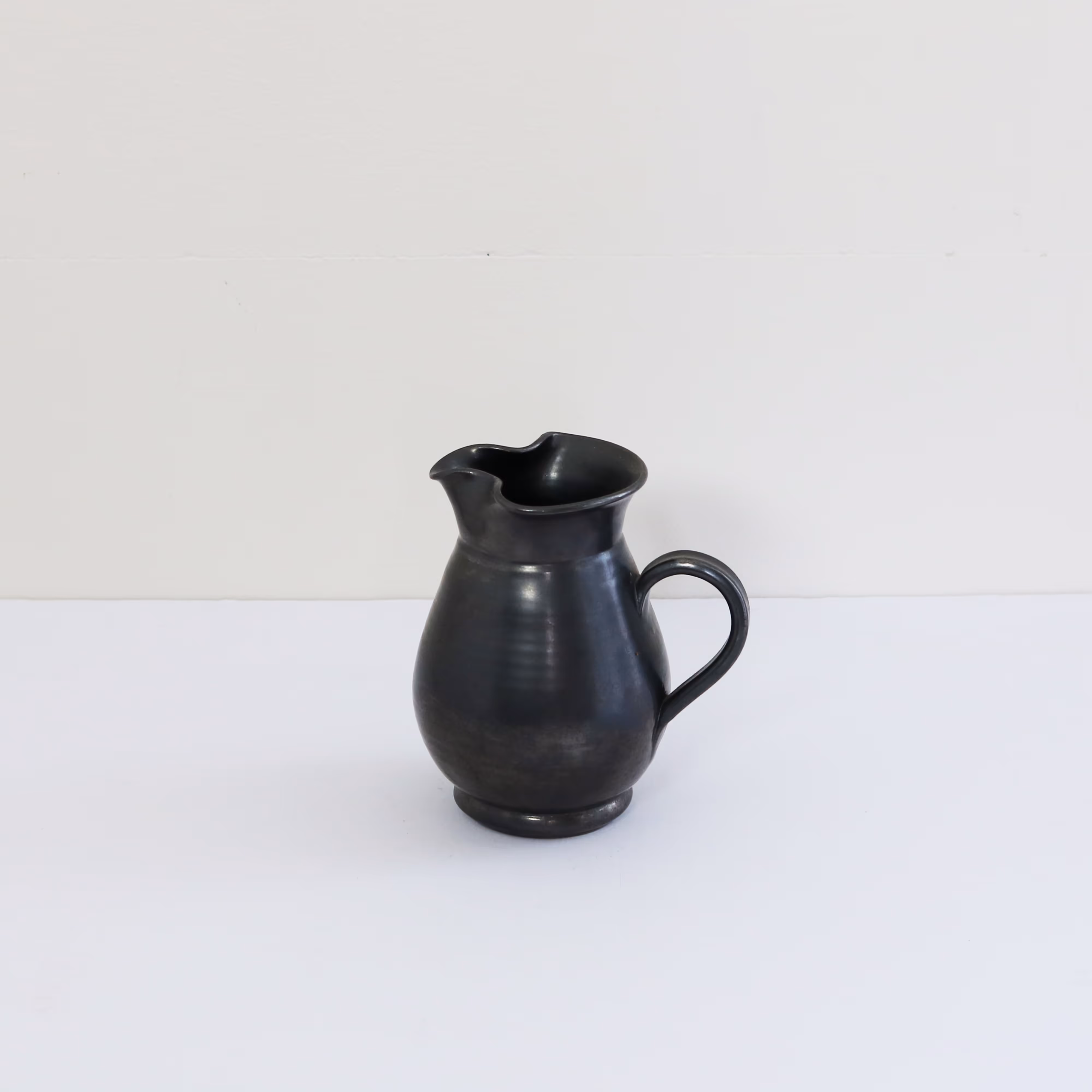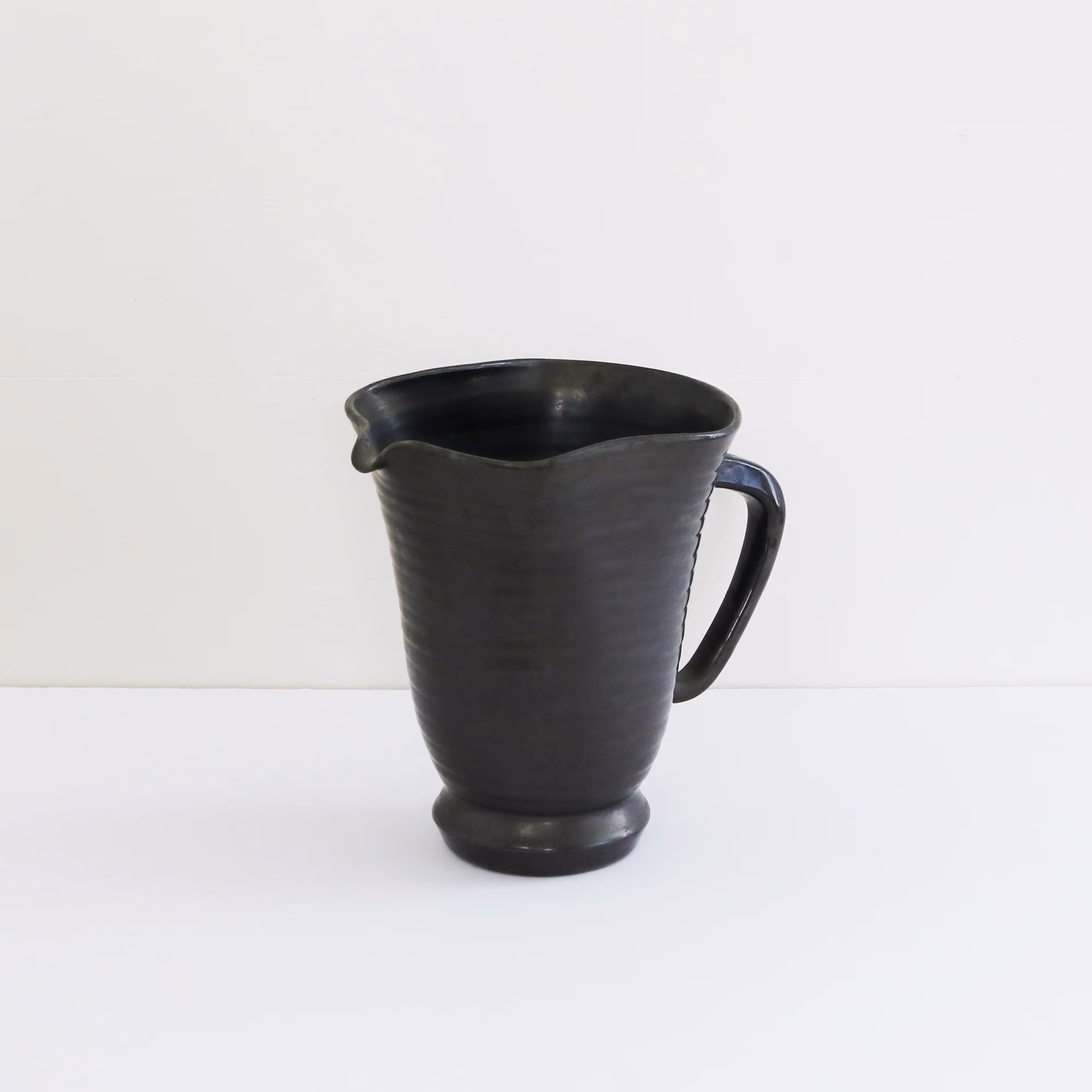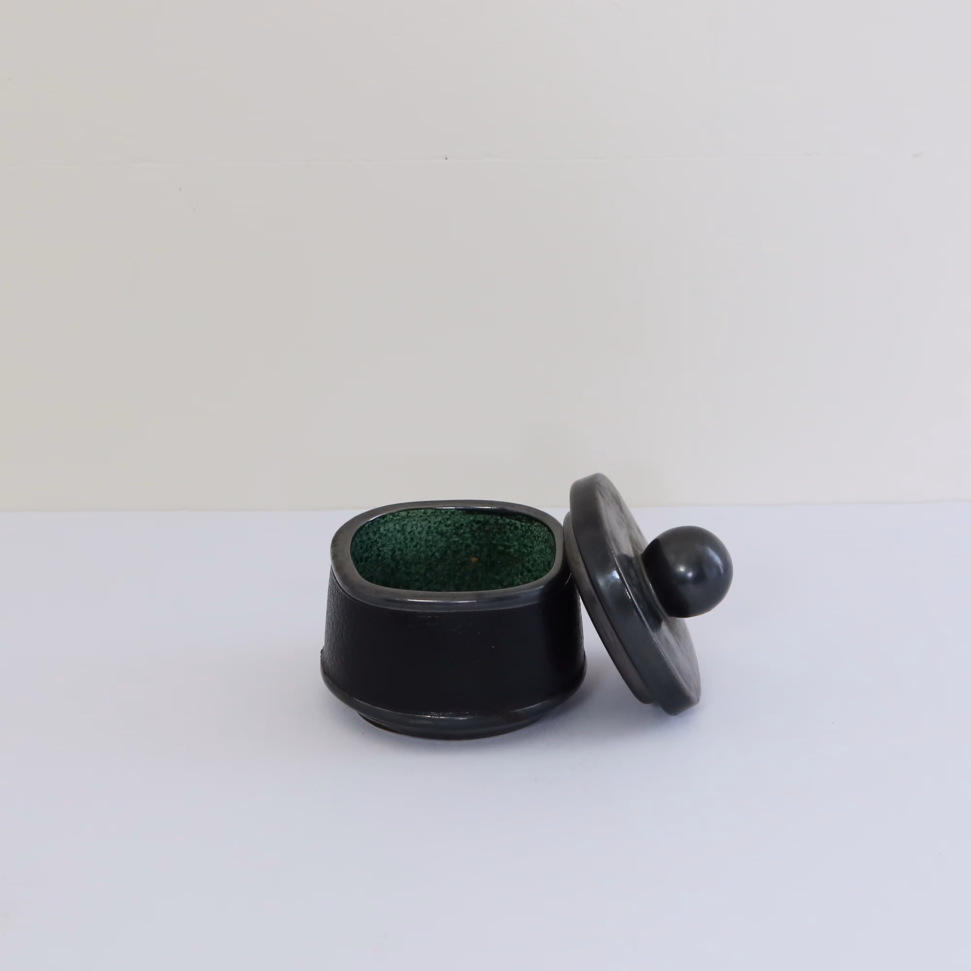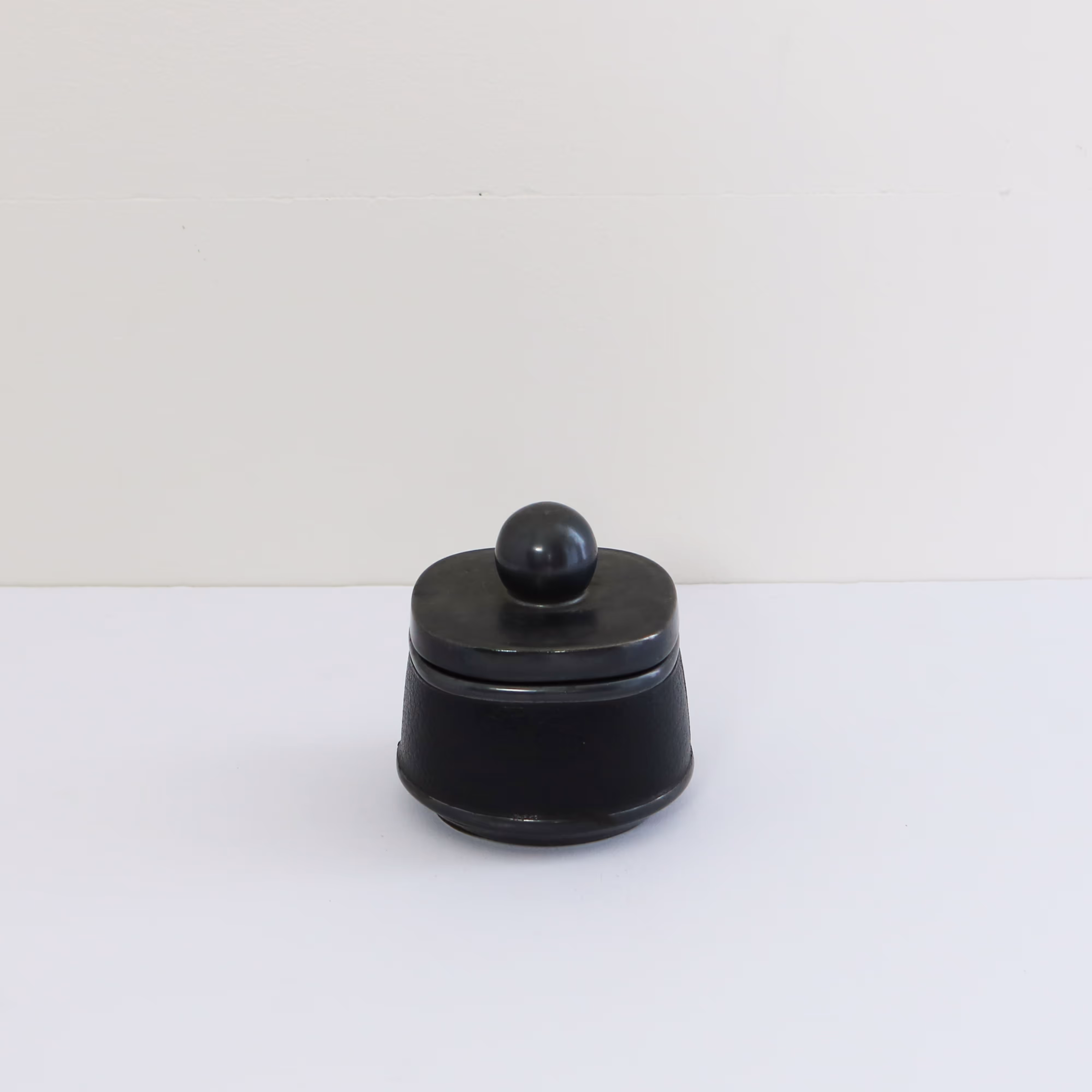 A group of six black pottery vessels, including a textured vase by Jerome Massier, a jug by Accolay and a leather-clad, lidded tobacco jar.