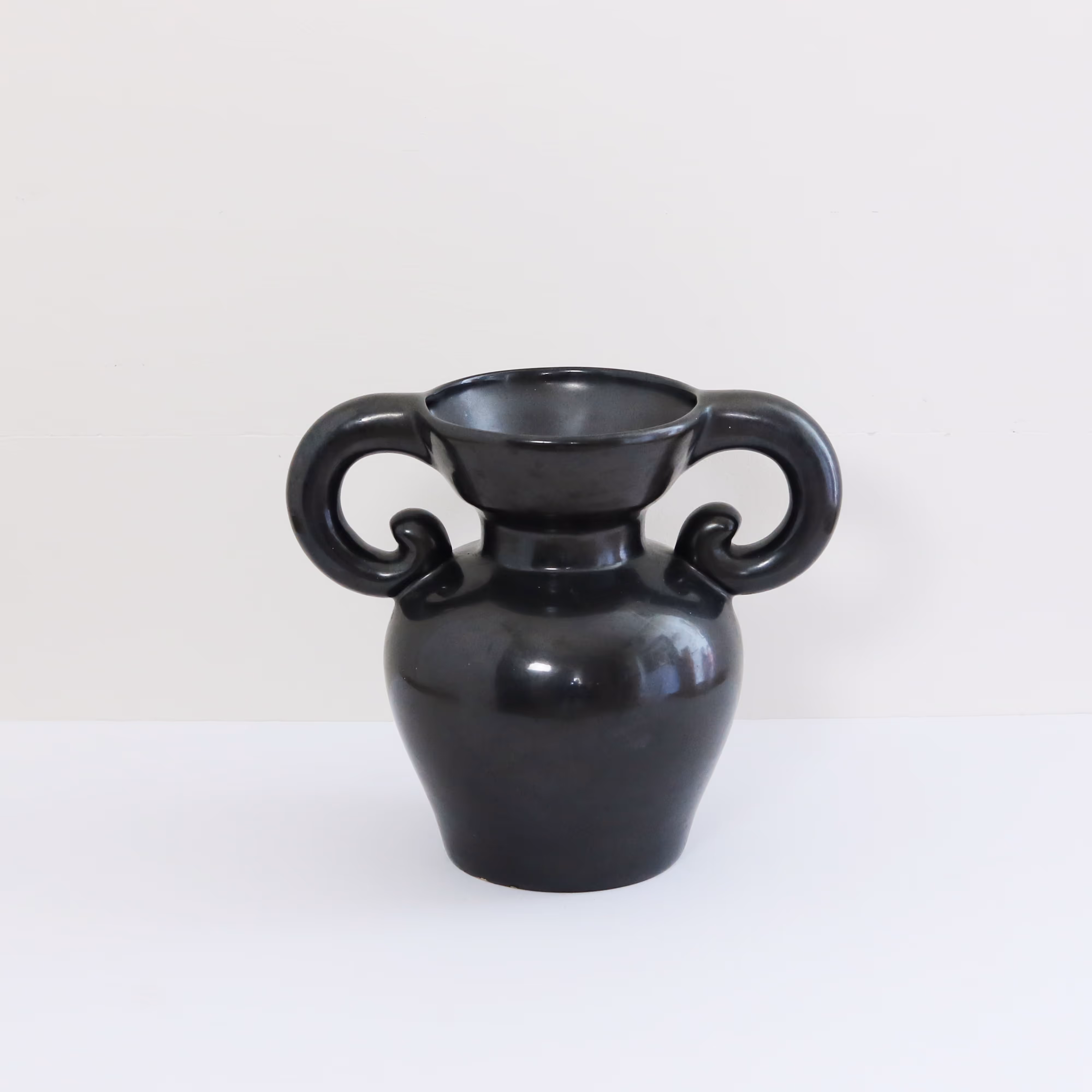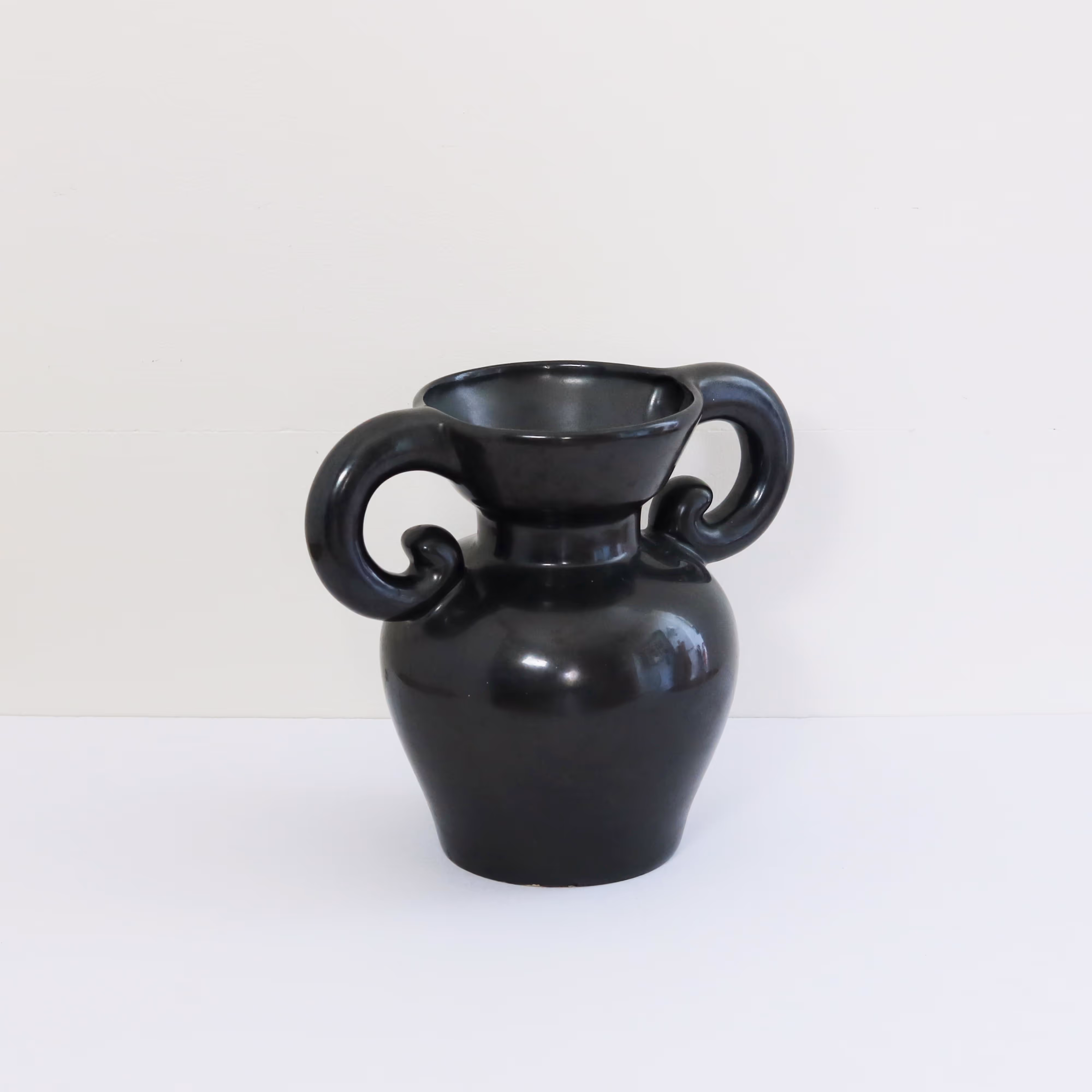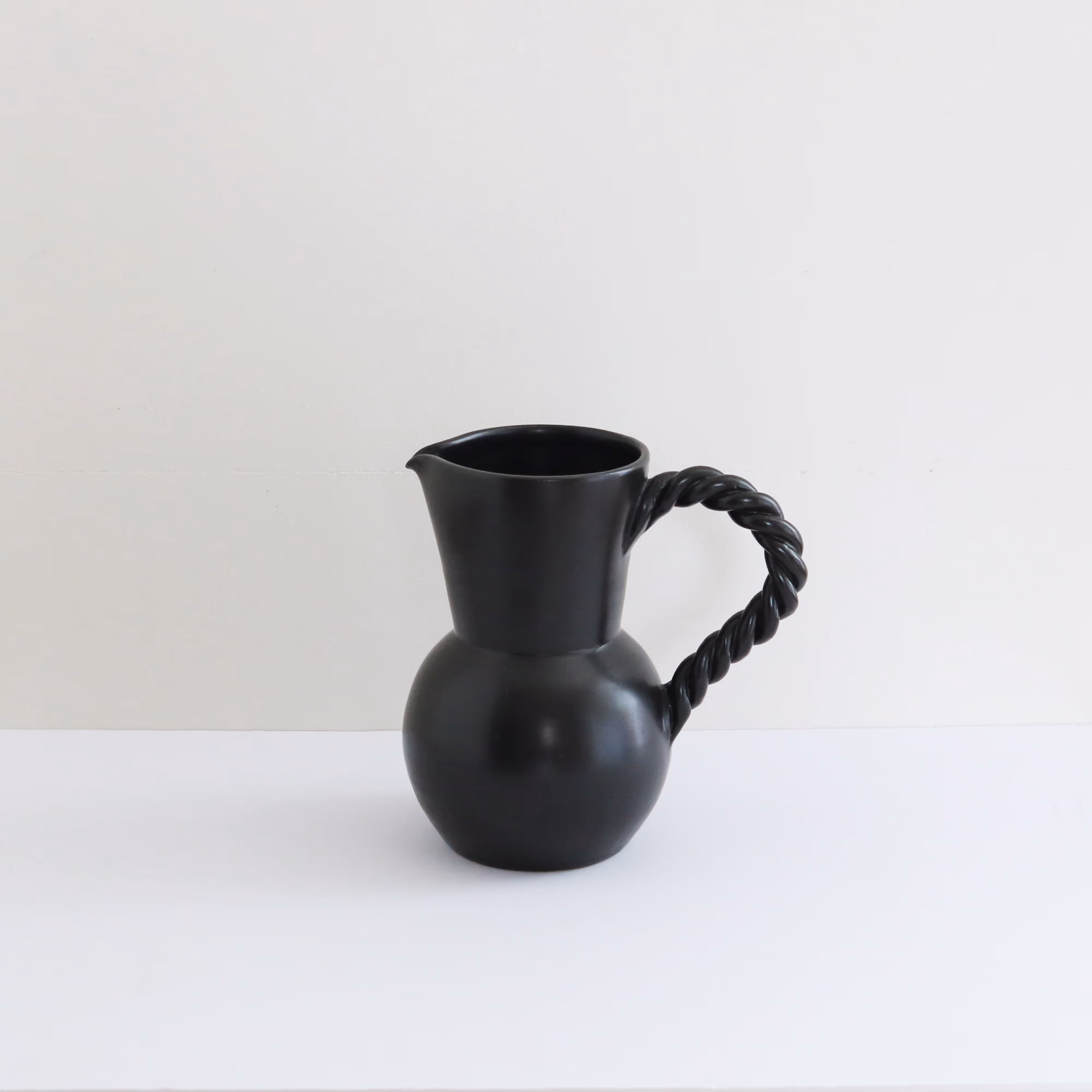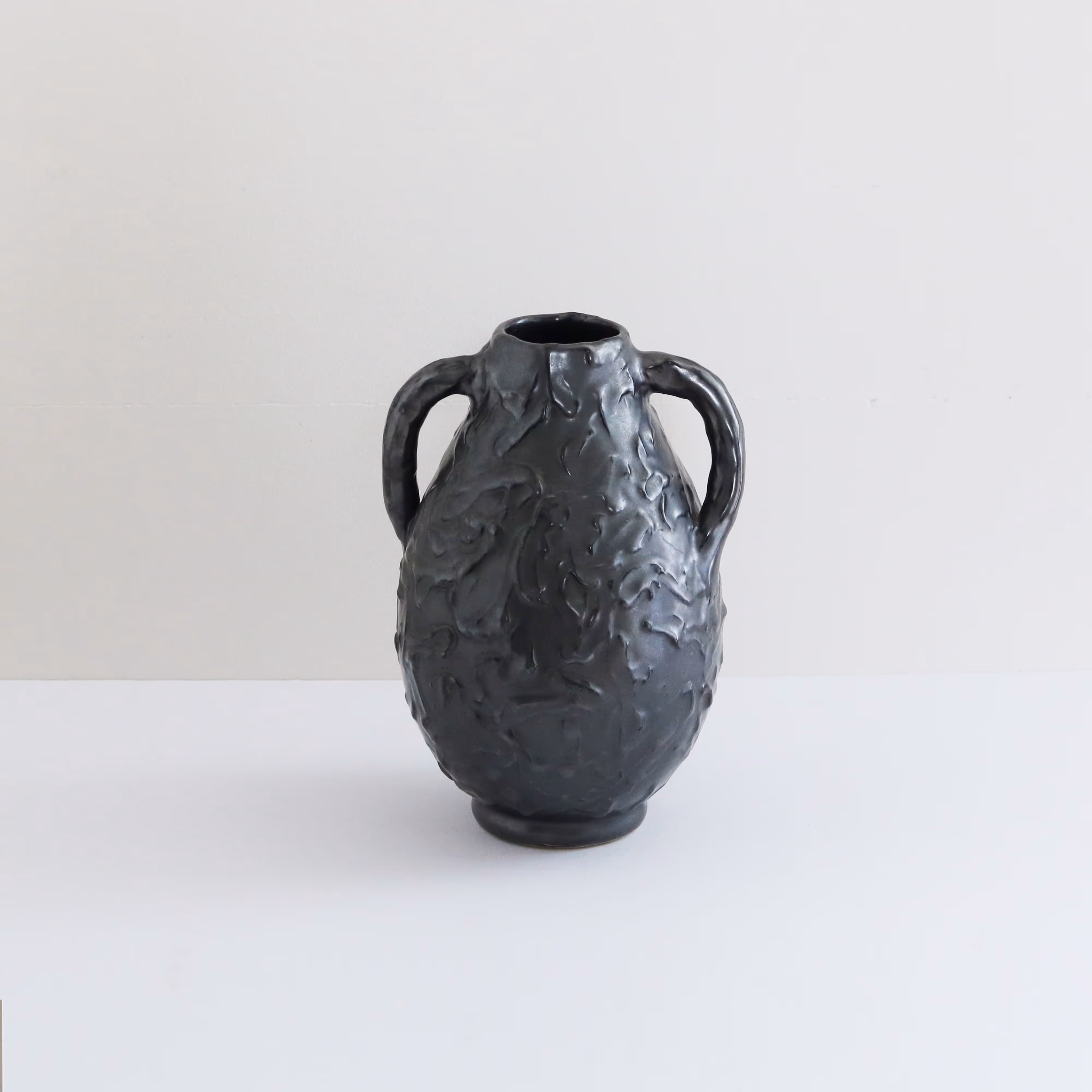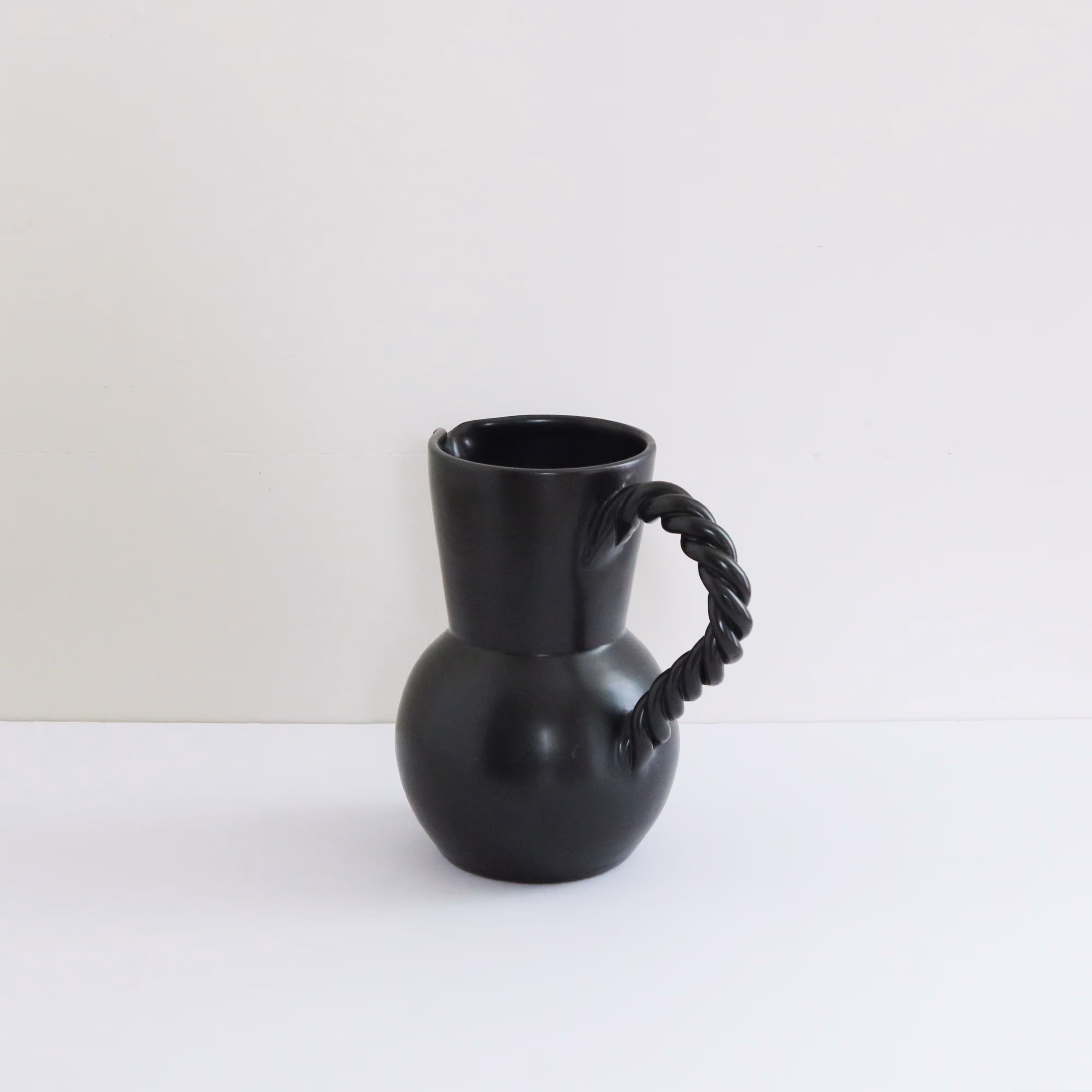 A group of six black pottery vessels, including a textured vase by Jerome Massier, a jug by Accolay and a leather-clad, lidded tobacco jar.
