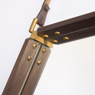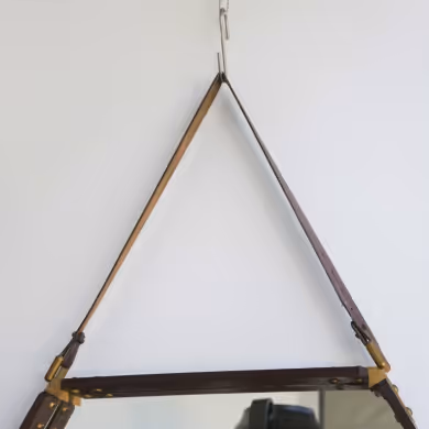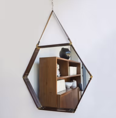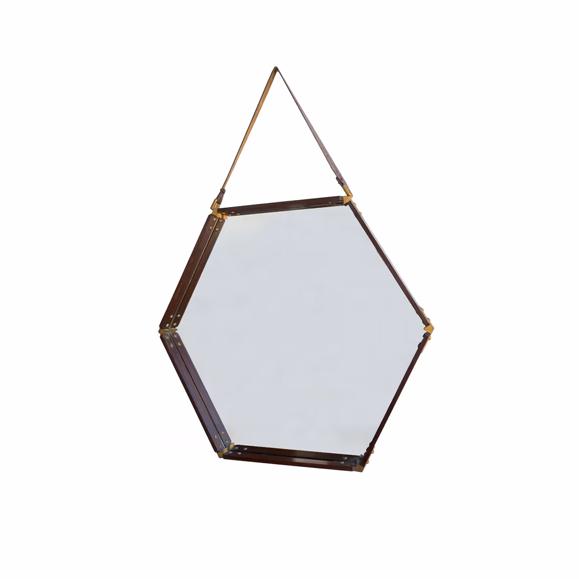 A hexagonal rosewood mirror with stitched faux-leather strap and brass fittings