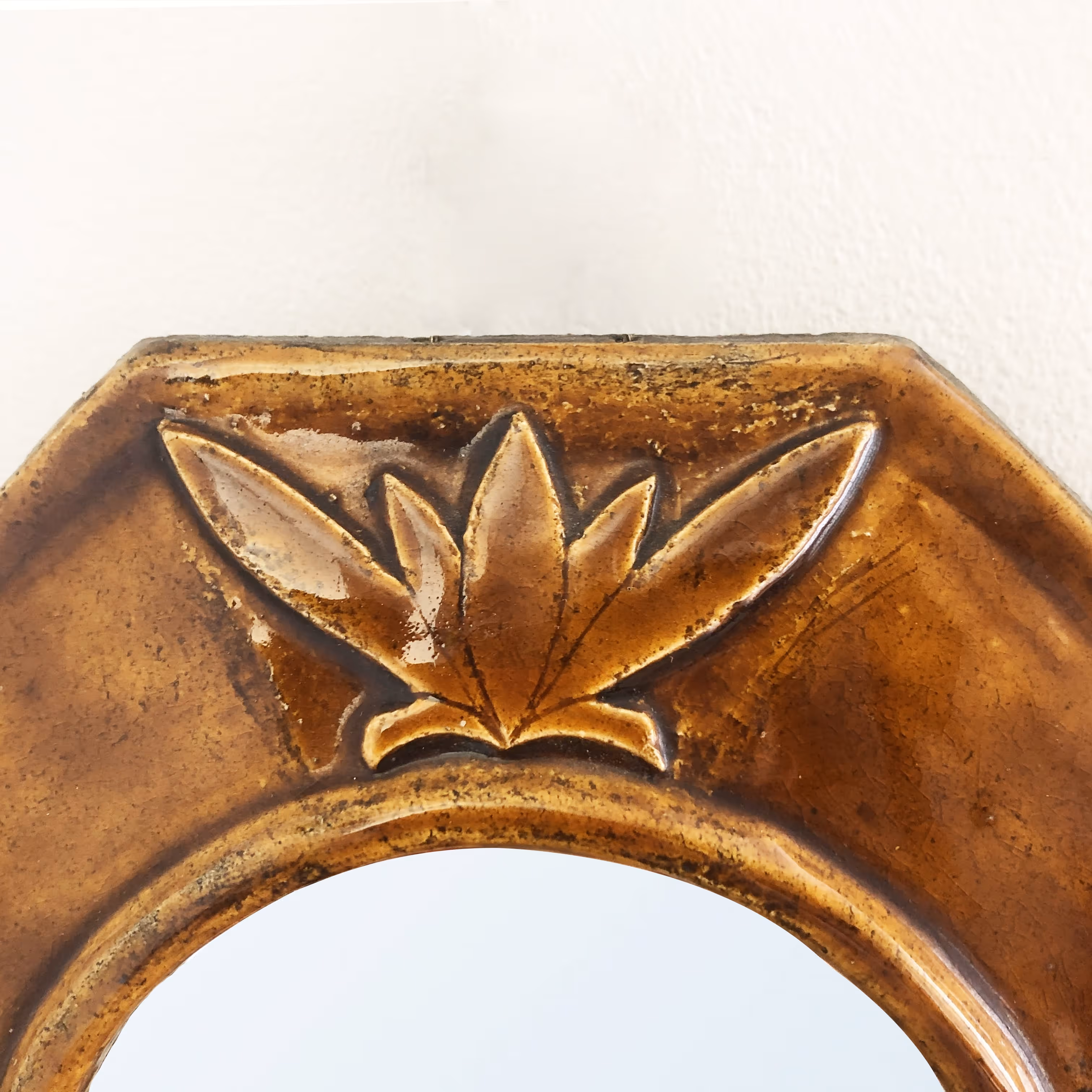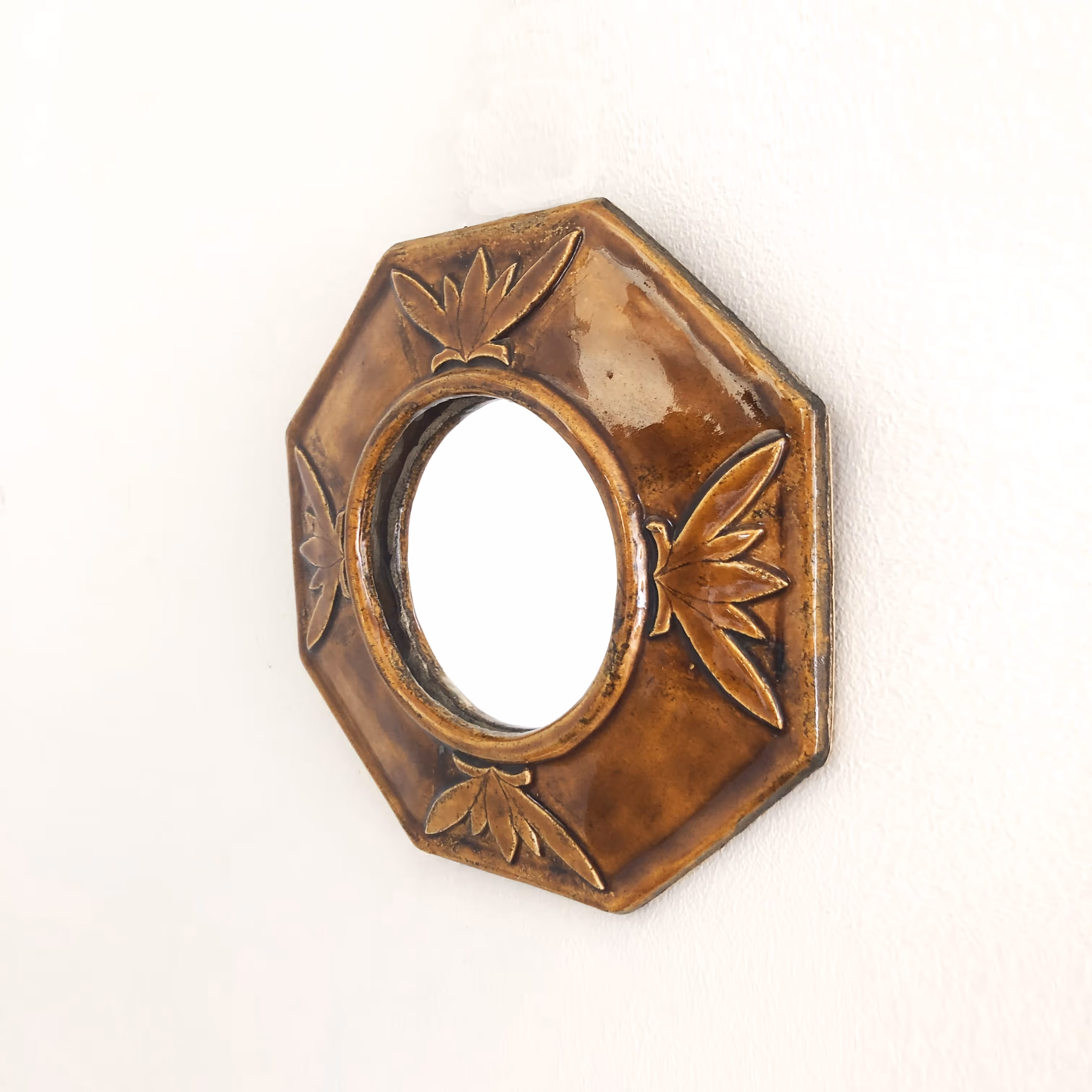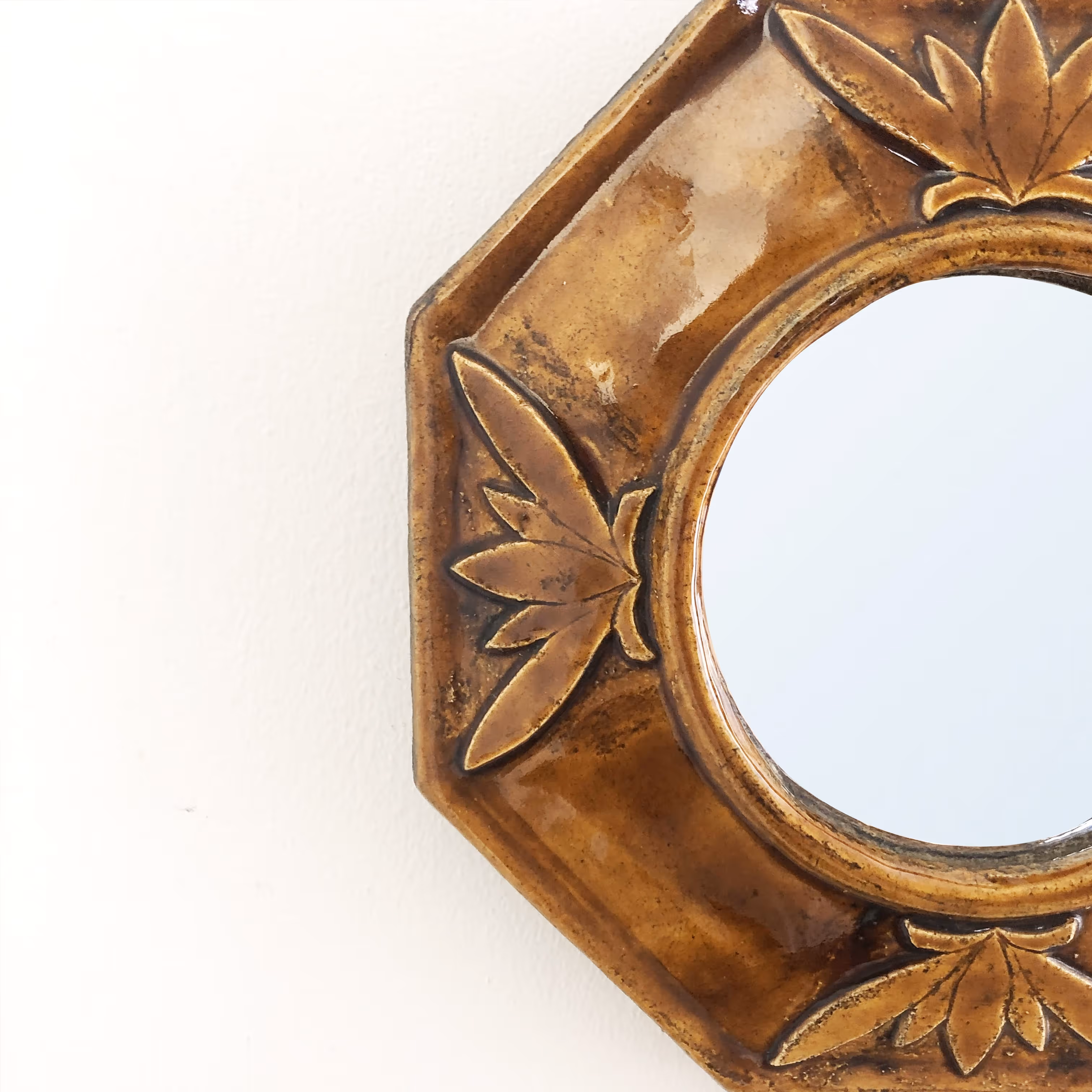 Small hexagnoal pottery mirror with raised leaf decoration. Ocre glaze.