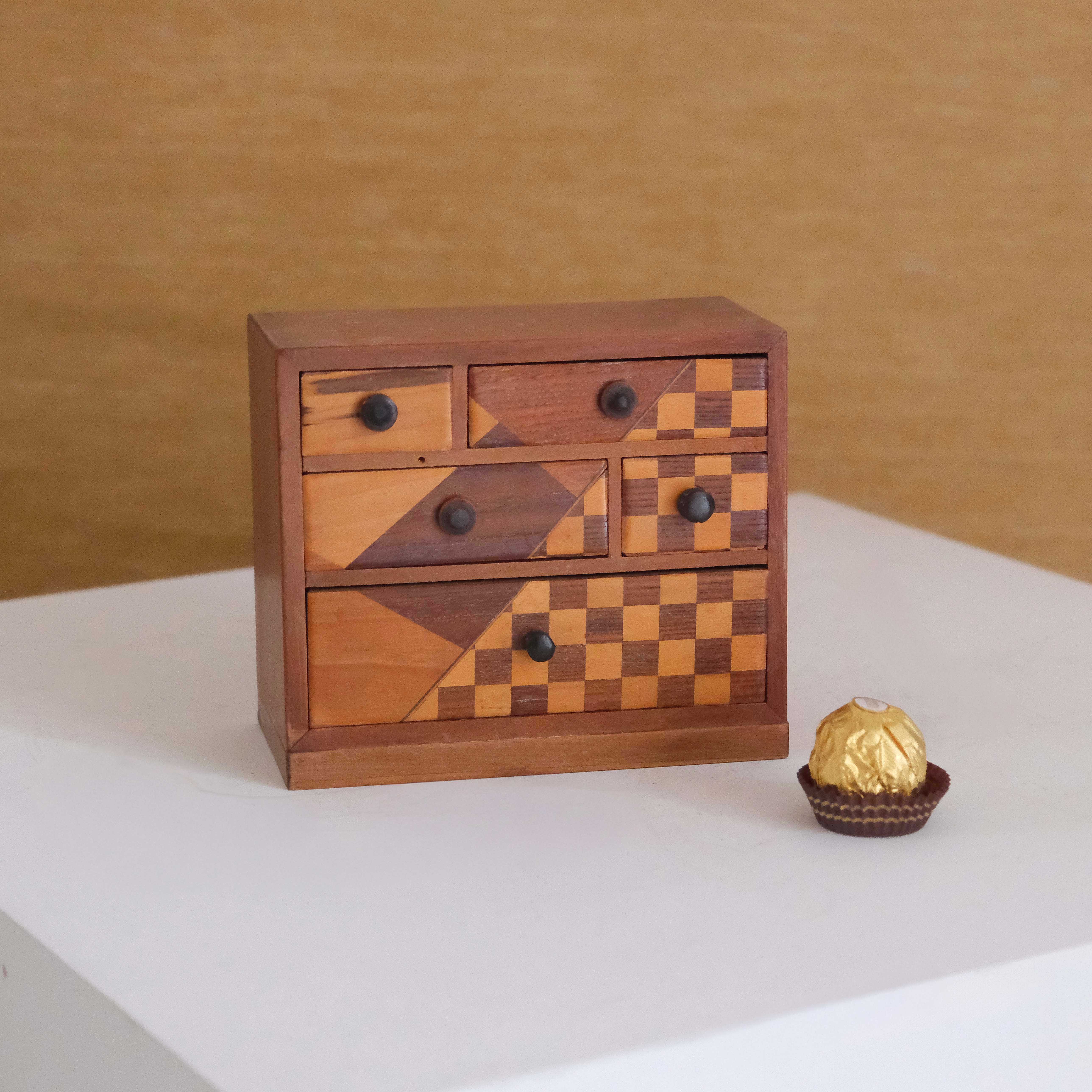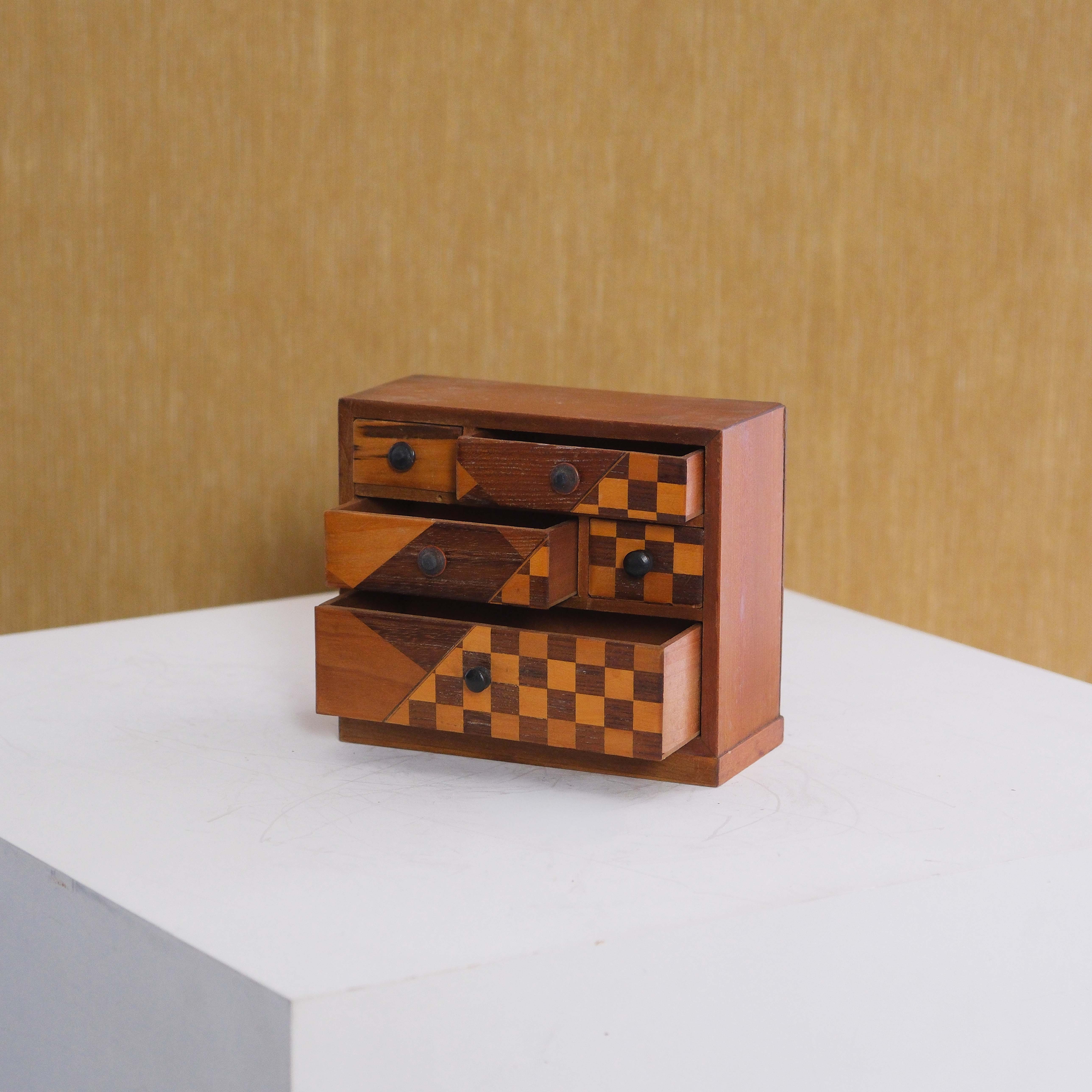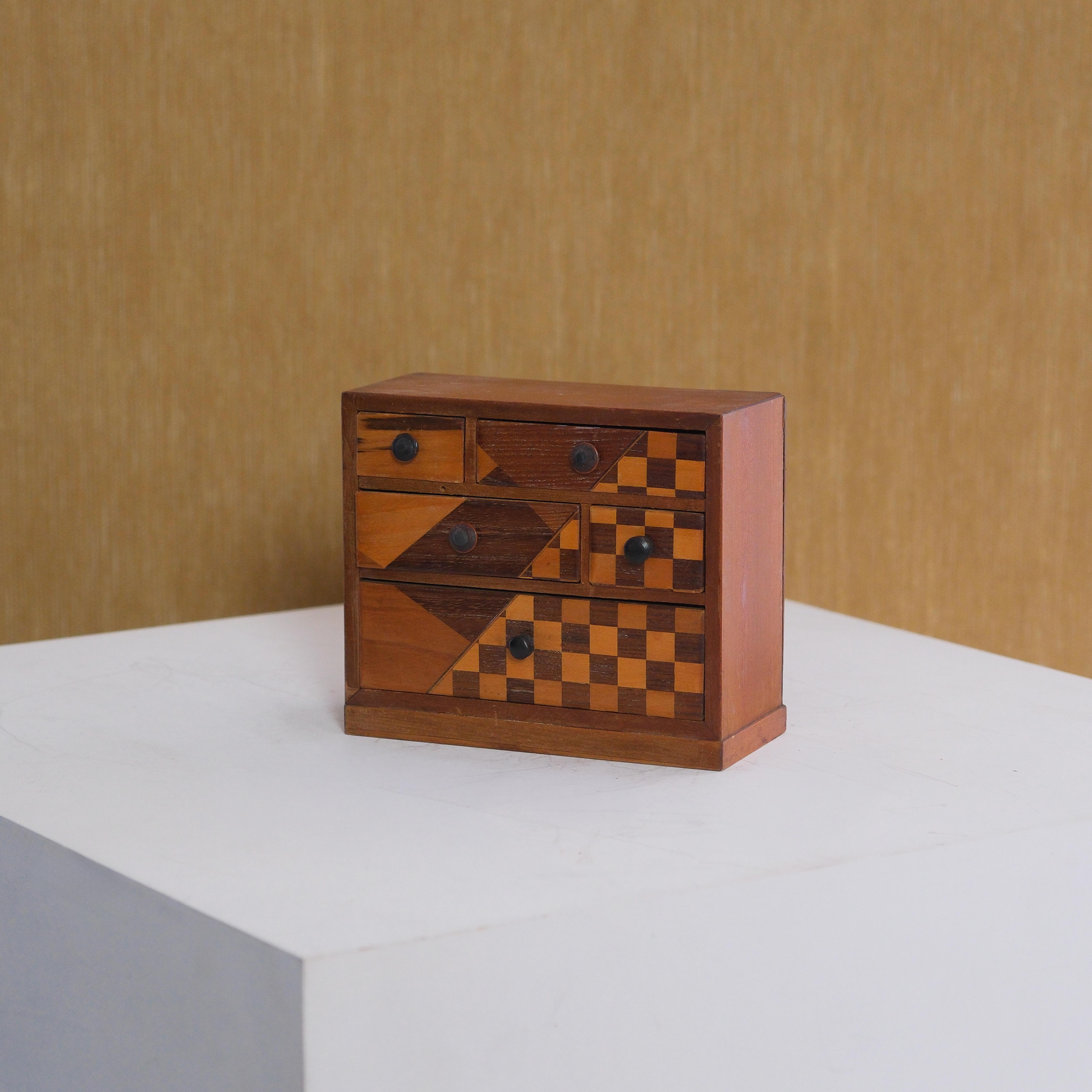 Small trinket chest with five small drawers decorated with geometrical inlays.