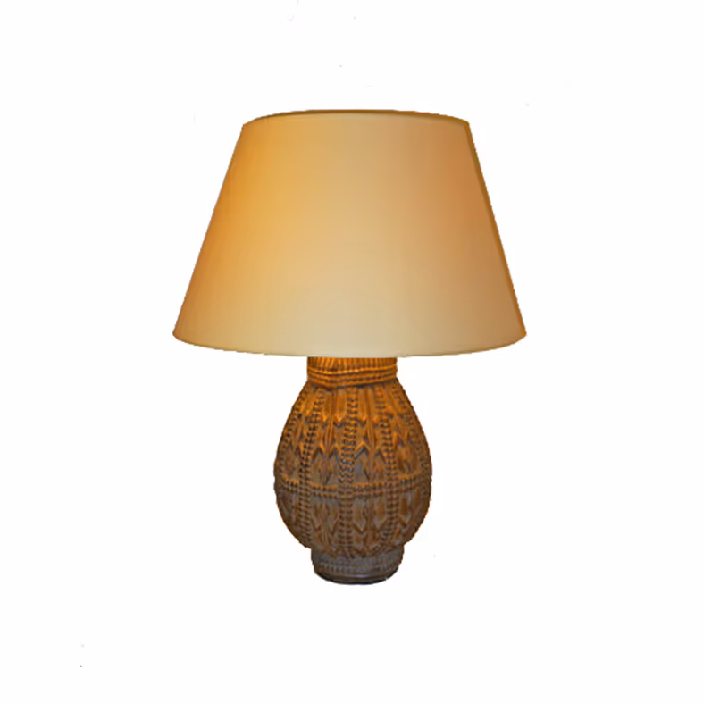 A large table lamp with African carved pot base c.1940 and bespoke shade. Rewired & PAT-certified