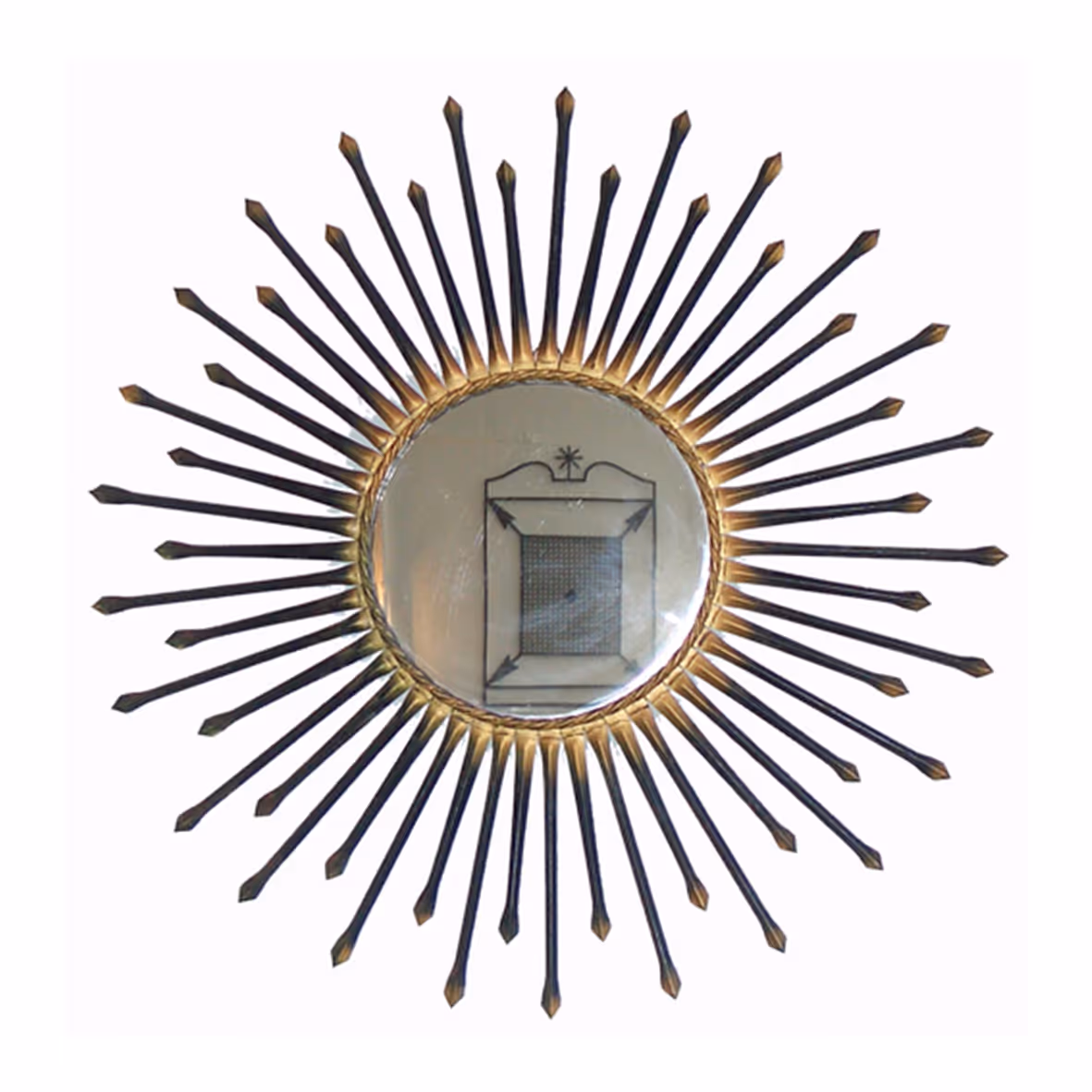 A large black metal sunburst mirror