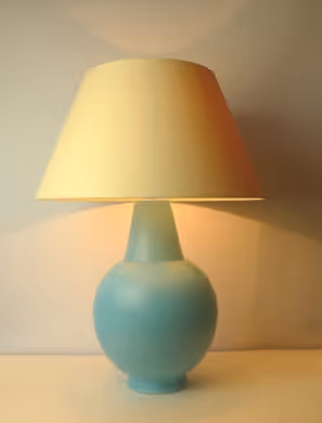 A large blue pottery table lamp with bespoke card shade. Rewired and PAT certified