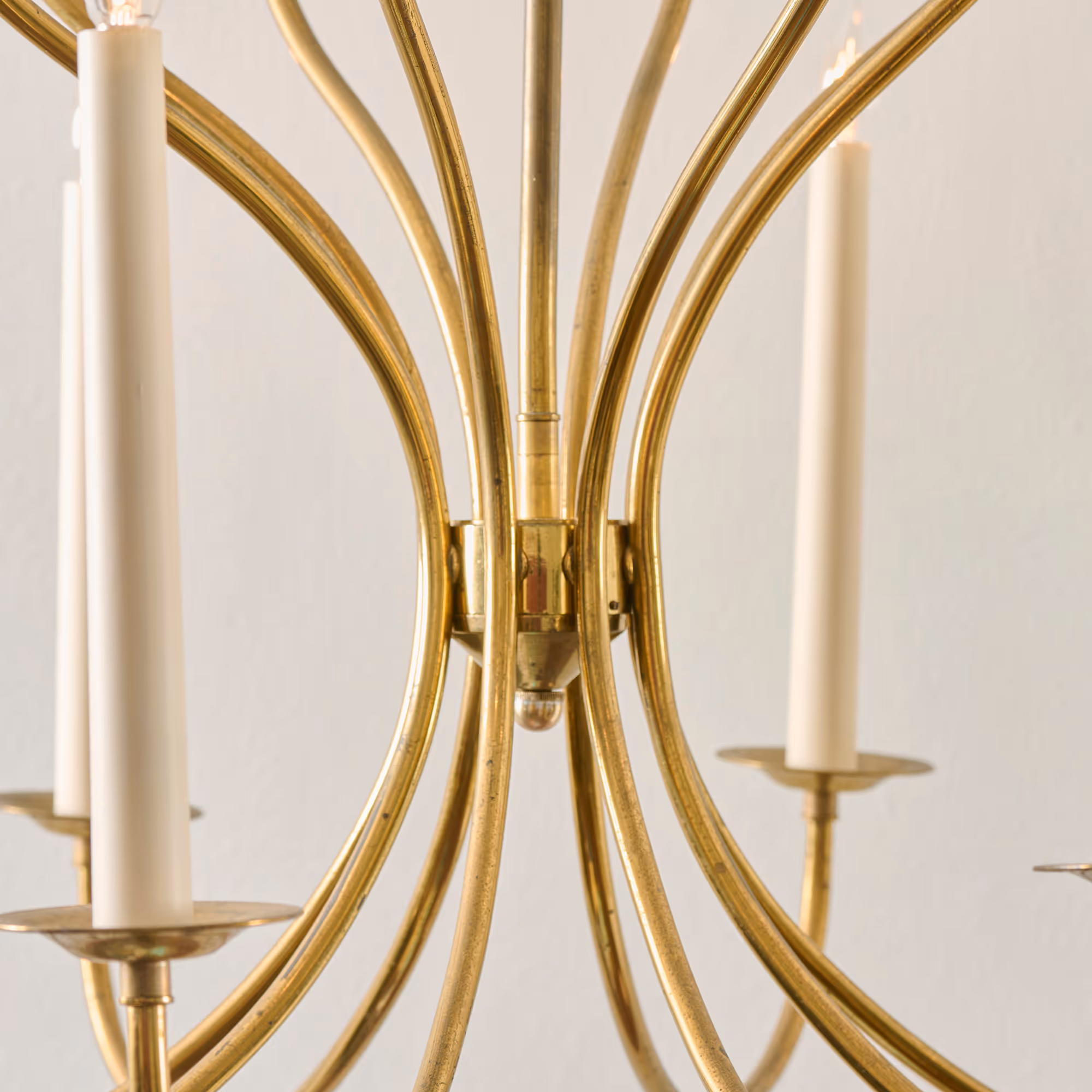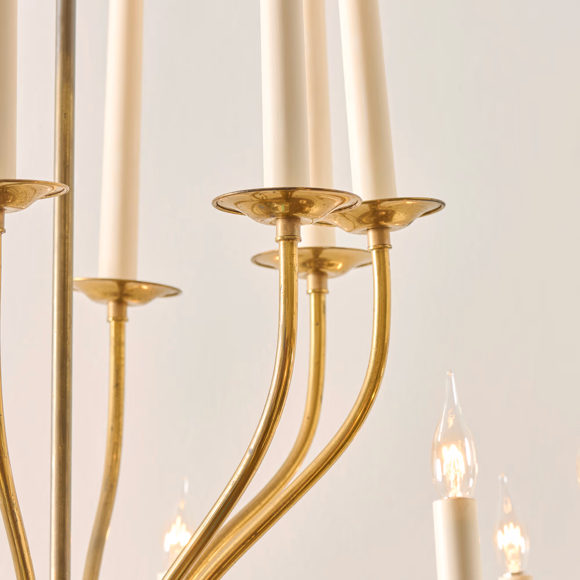 Large, elegant brass chandelier. Eighteen branches and long tapered faux candles.