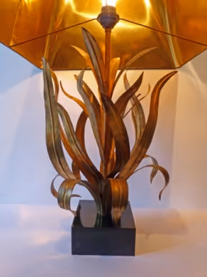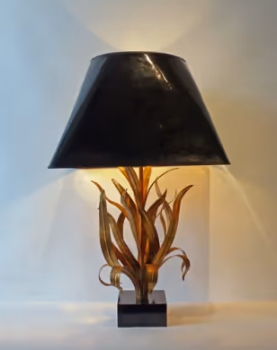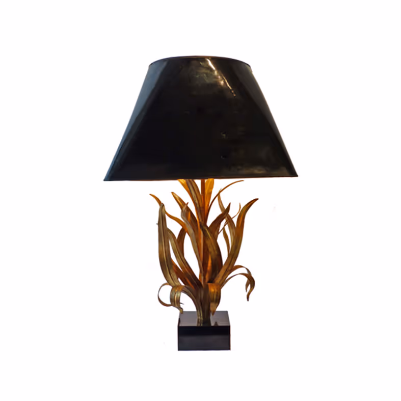 A large gilt iron table lamp in the shape of leaves, on a black lacquer base. Original glossy black shade with the gold interior in good condition but some scuff marks - can be reproduced on request, please ask for a quote. Rewired & PAT-certified