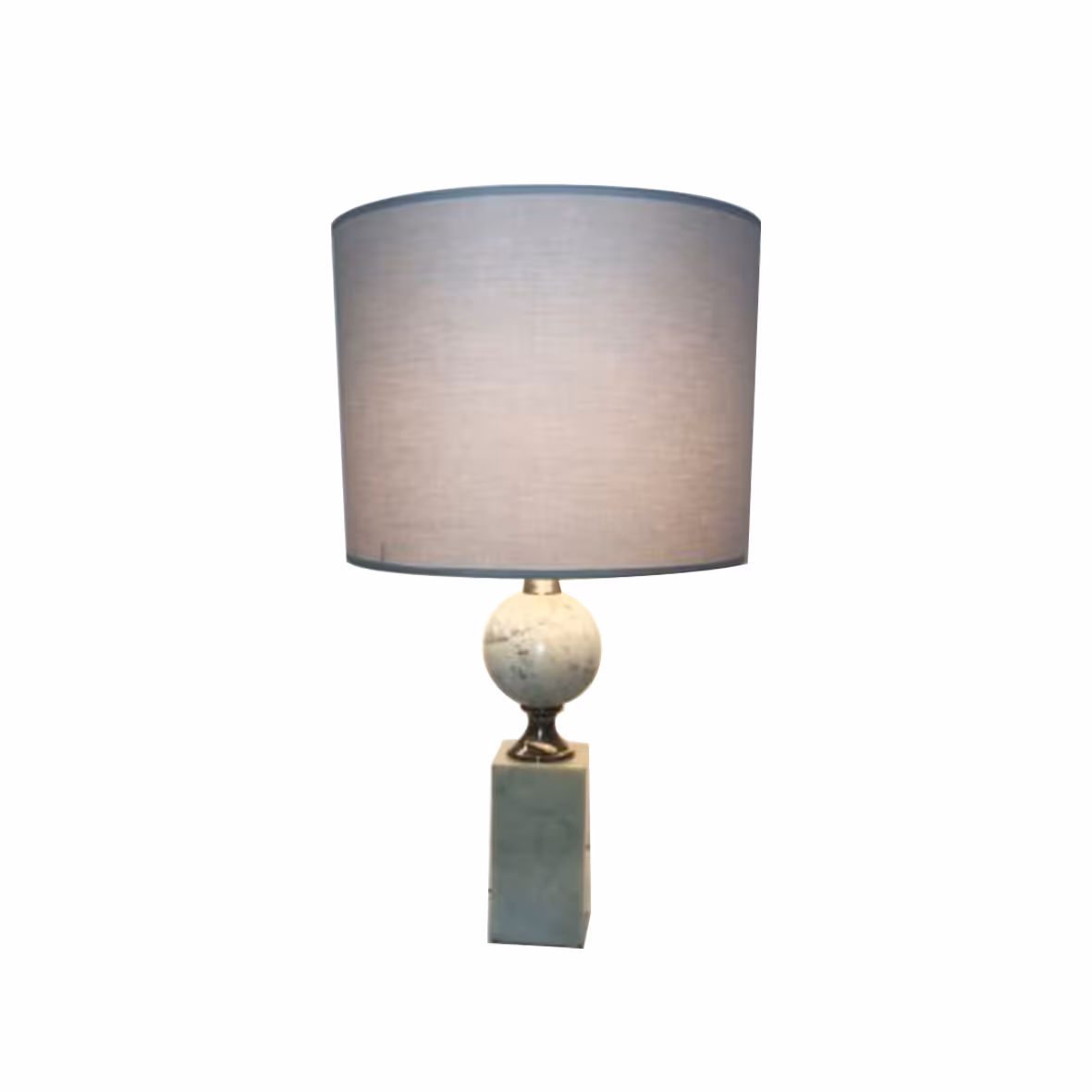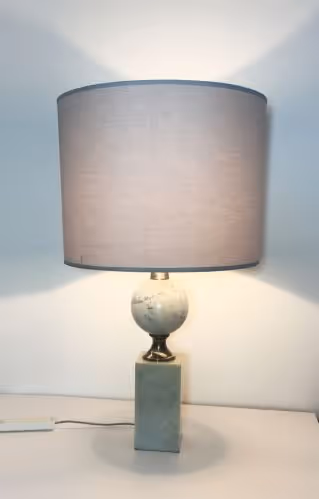A large grey marble table lamp with brushed aluminium detail. By Philippe Barbier. Rewired and PAT-certified, bespoke silk shade.