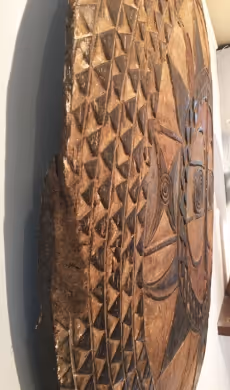 A carved wood shield with sun face design. Vegetable pigment highlights.