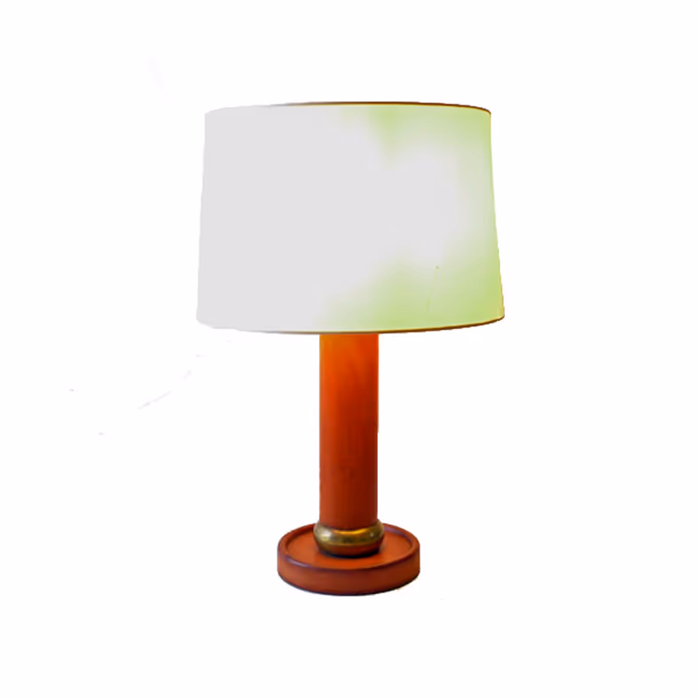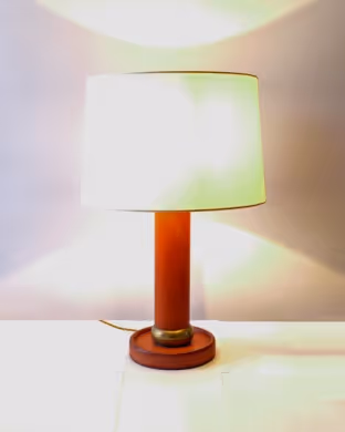A leather and brass table lamp. Pig Skin with a thick brass ring. Rewired & PAT-certified