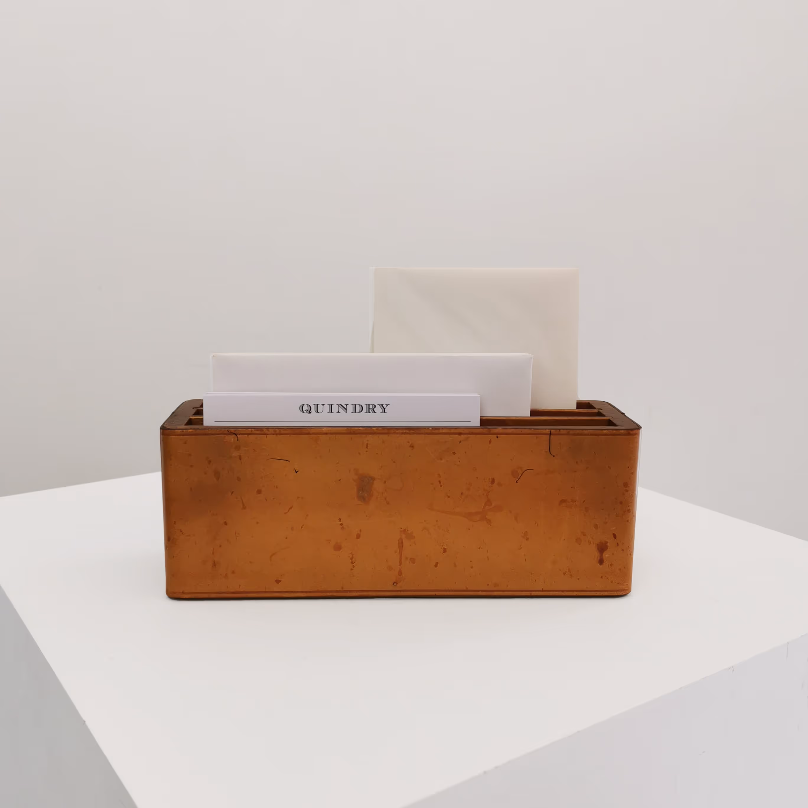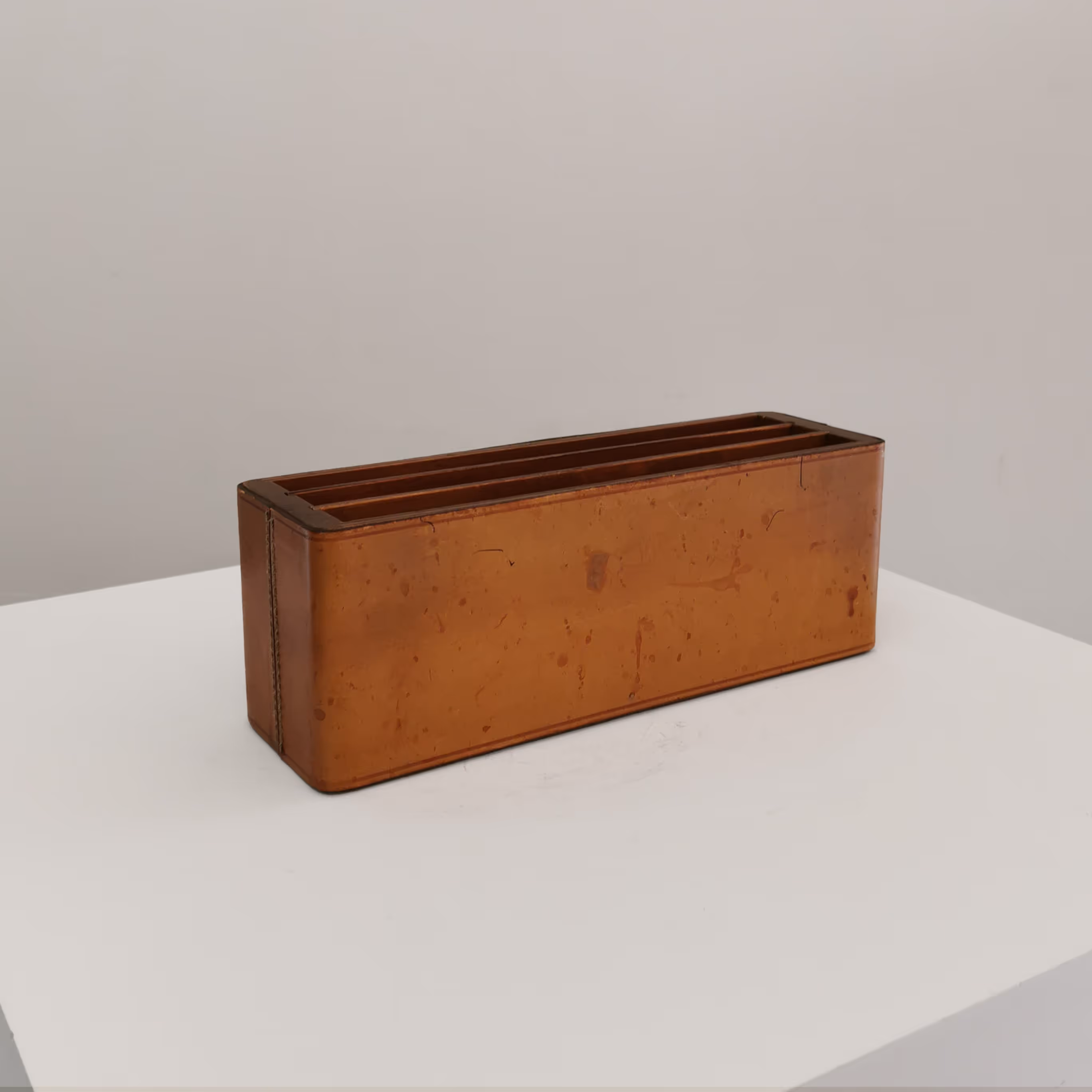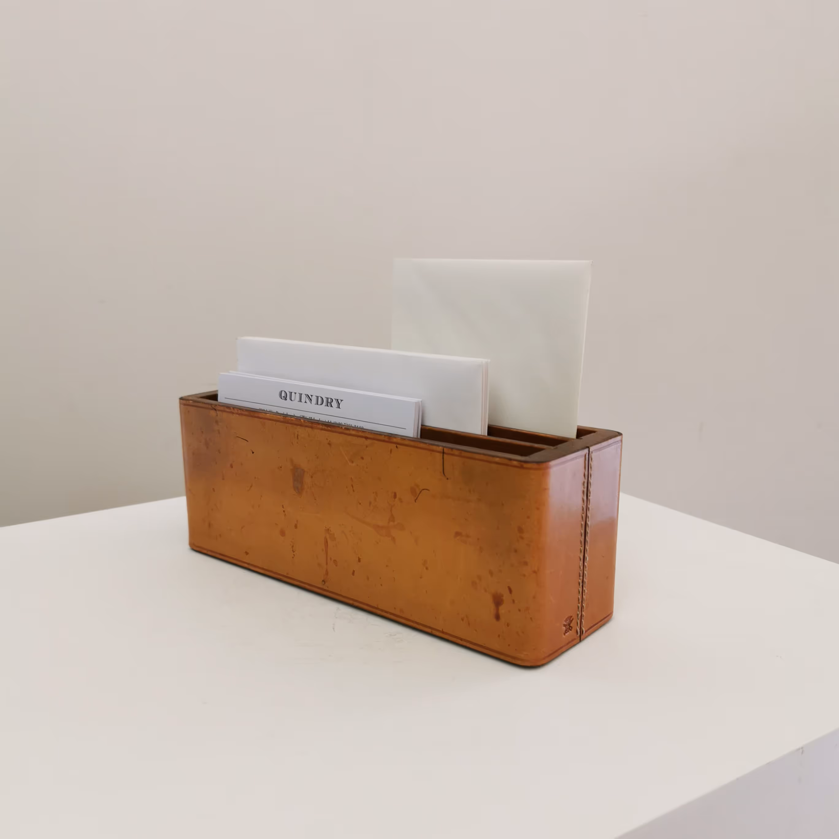 Tan leather desk set comprising of letter rack and pen pot.