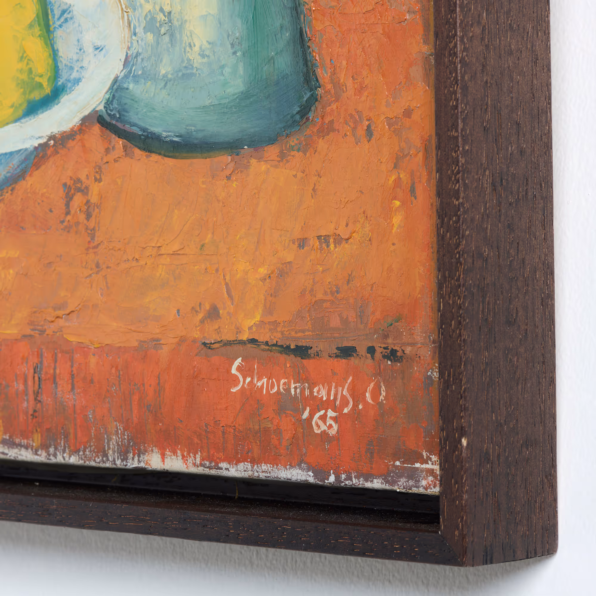Lemon still life, signed & dated 1965. Oil on canvas. Recent tray frame.