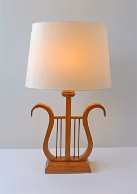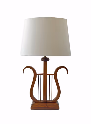 A table light with a wooden base in the shape of a lyra, Rewired & PAT-certified; new silk shade