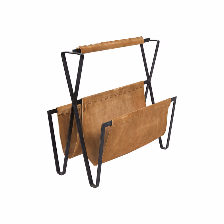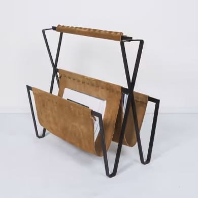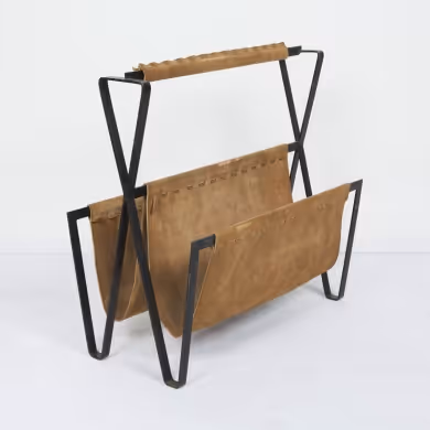 A metal and suede magazine holder