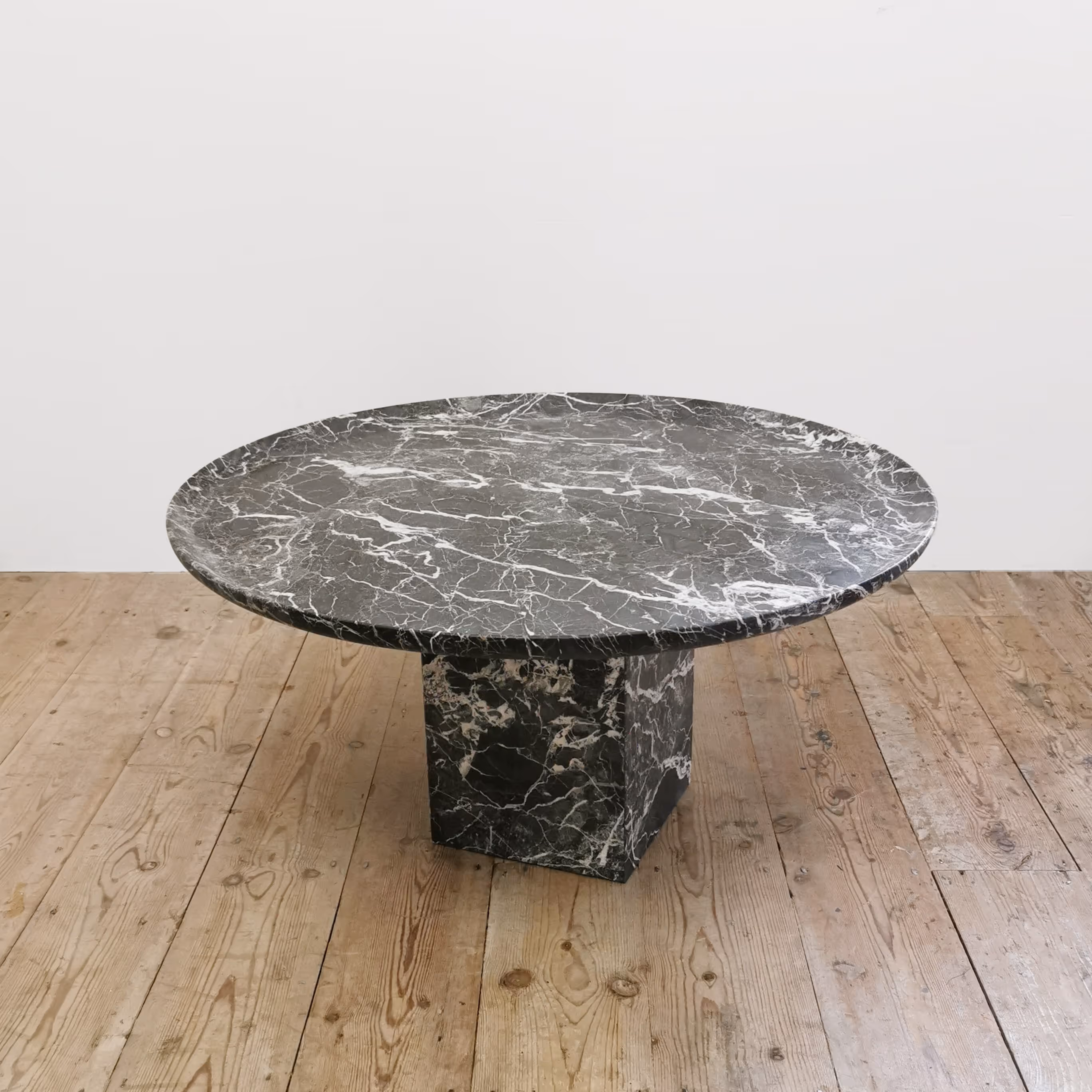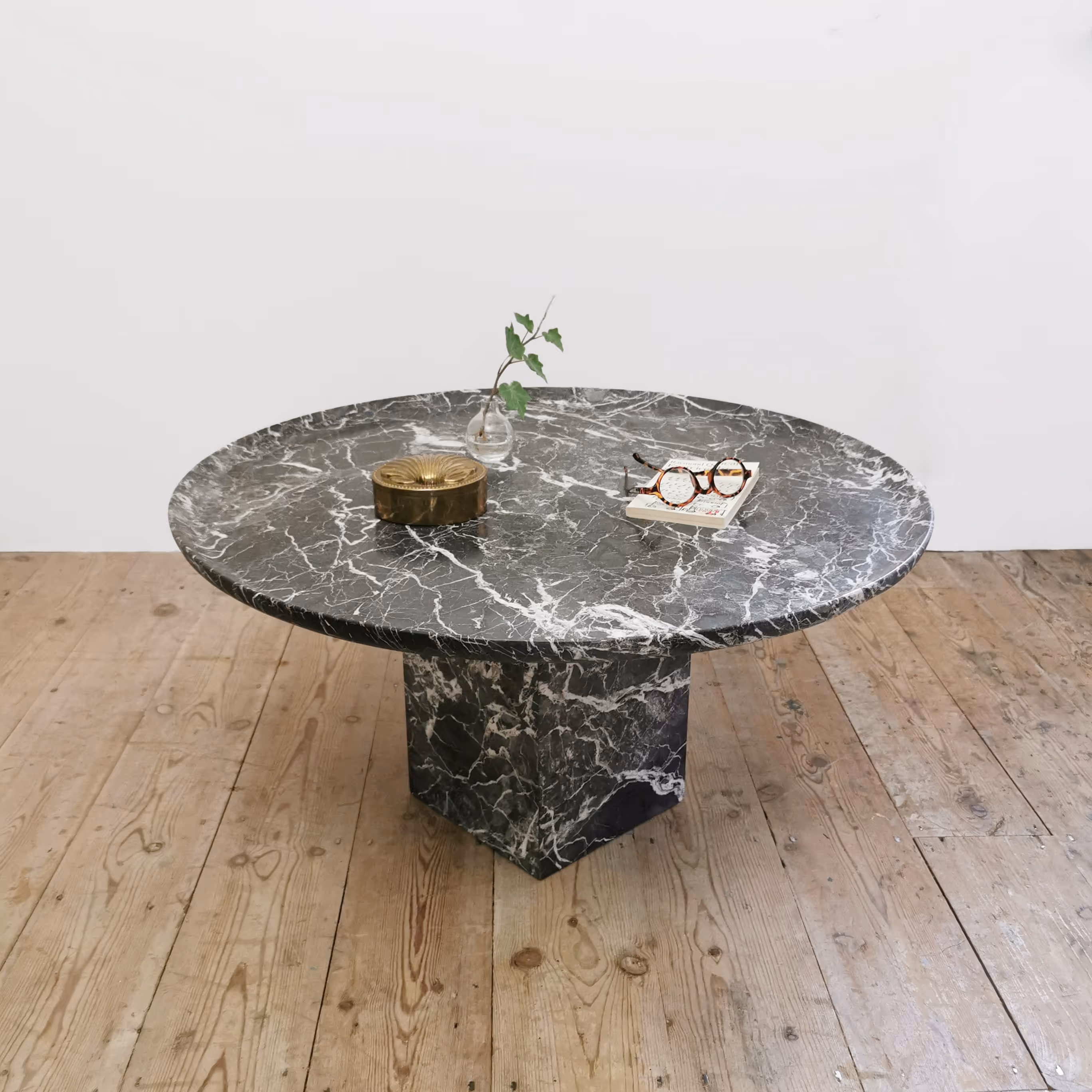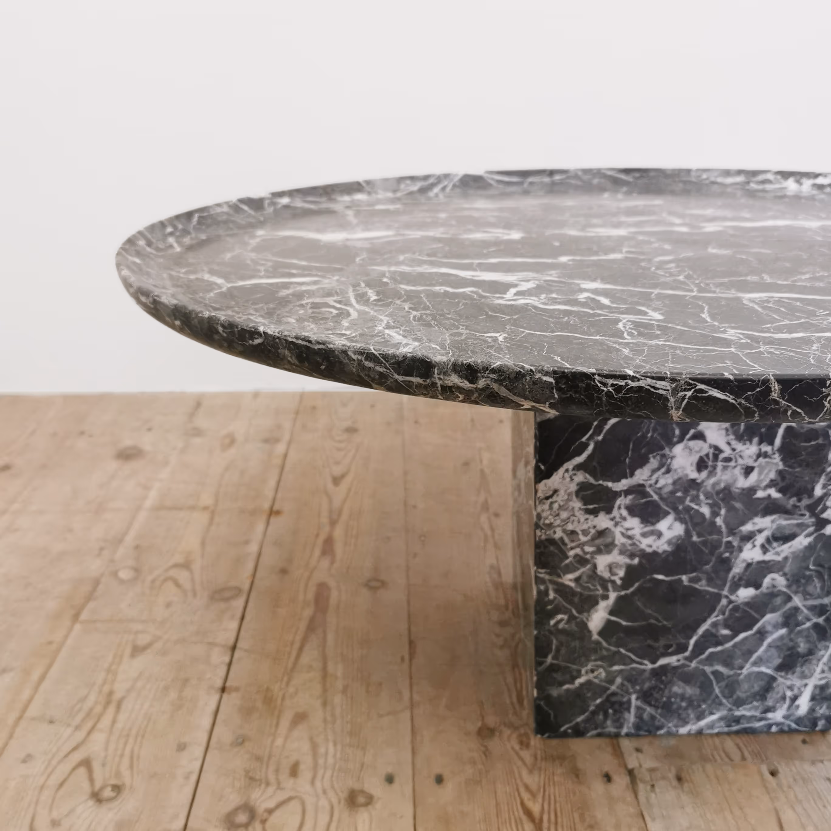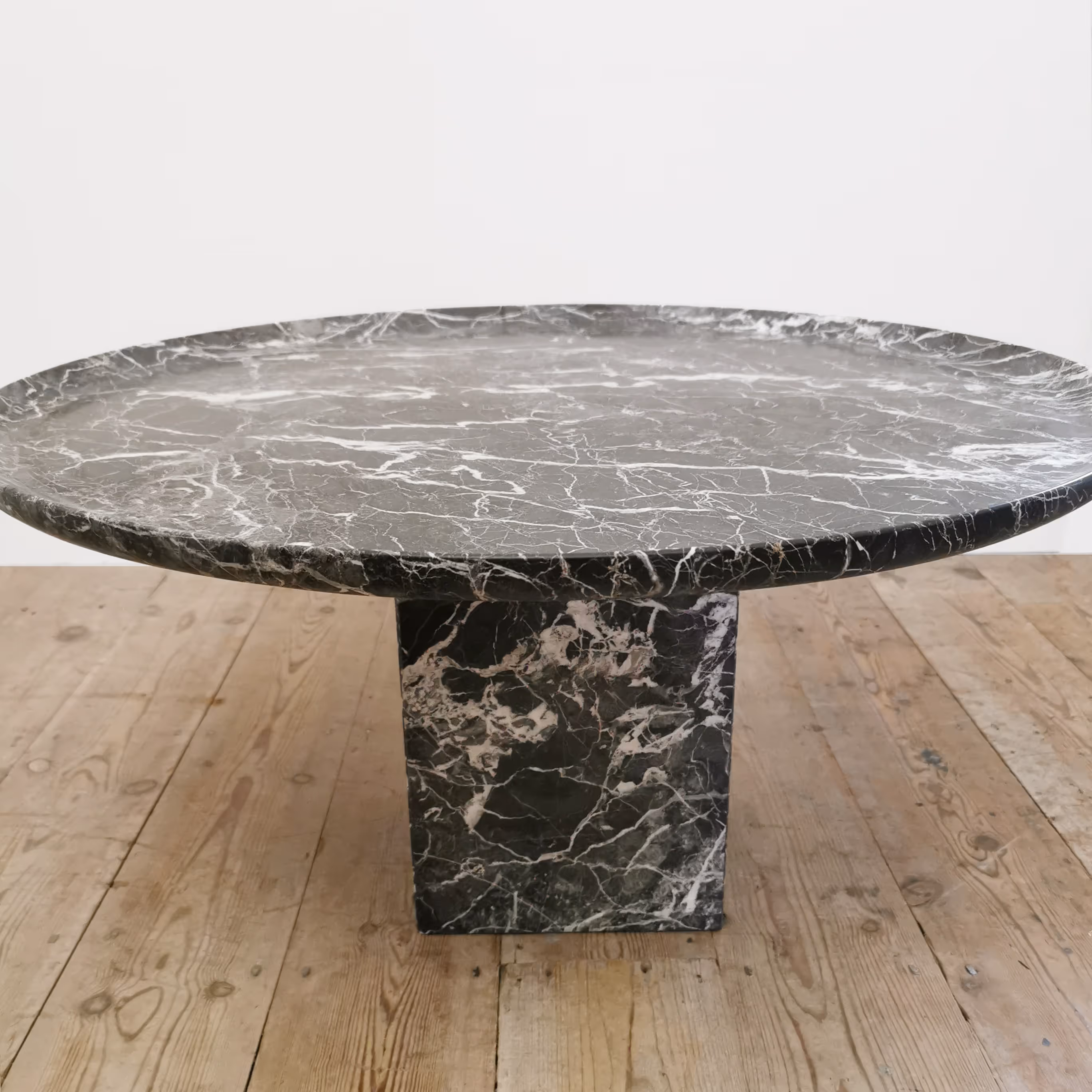 A circular marble coffee table: lipped tray on a square base, honed grigio carnico marble.