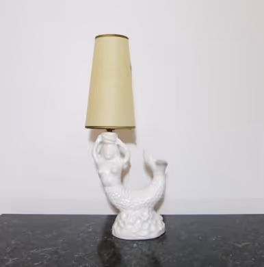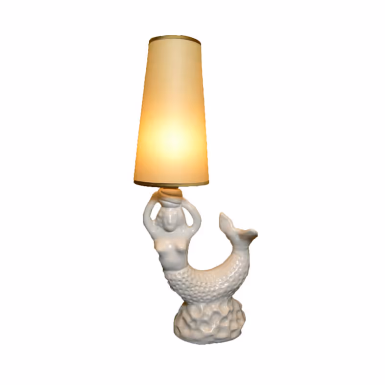 A matt glazed porcelain mermaid lamp. After Georges Jouve. Bespoke card shade. Rewired and PAT-certified