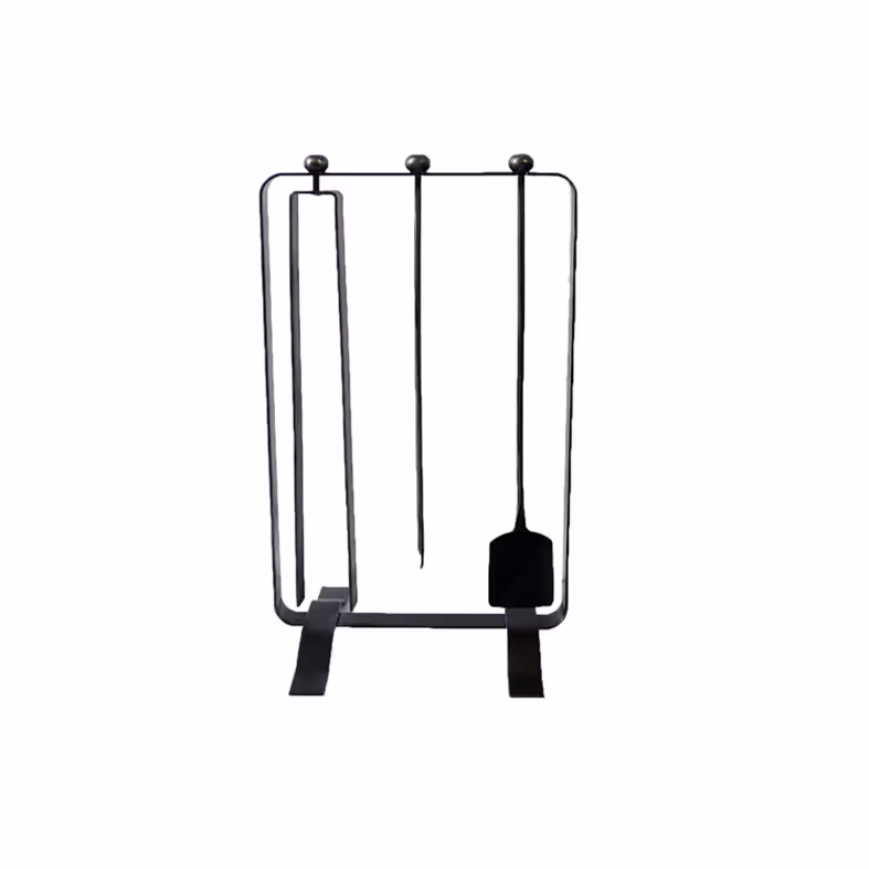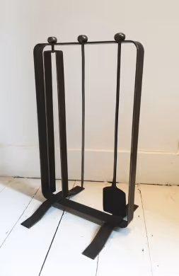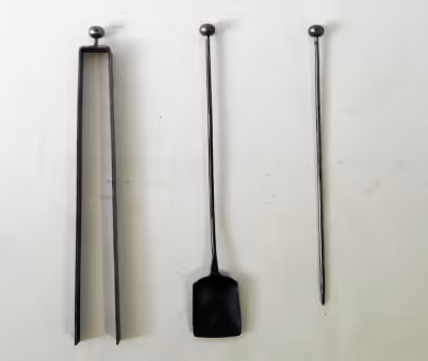 A hand wrought iron set of fire tools comprising of a poker, shovel and tongs