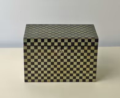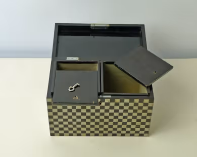 A silver and black chequered tea caddy with two internal compartments. Lockable and with key.
