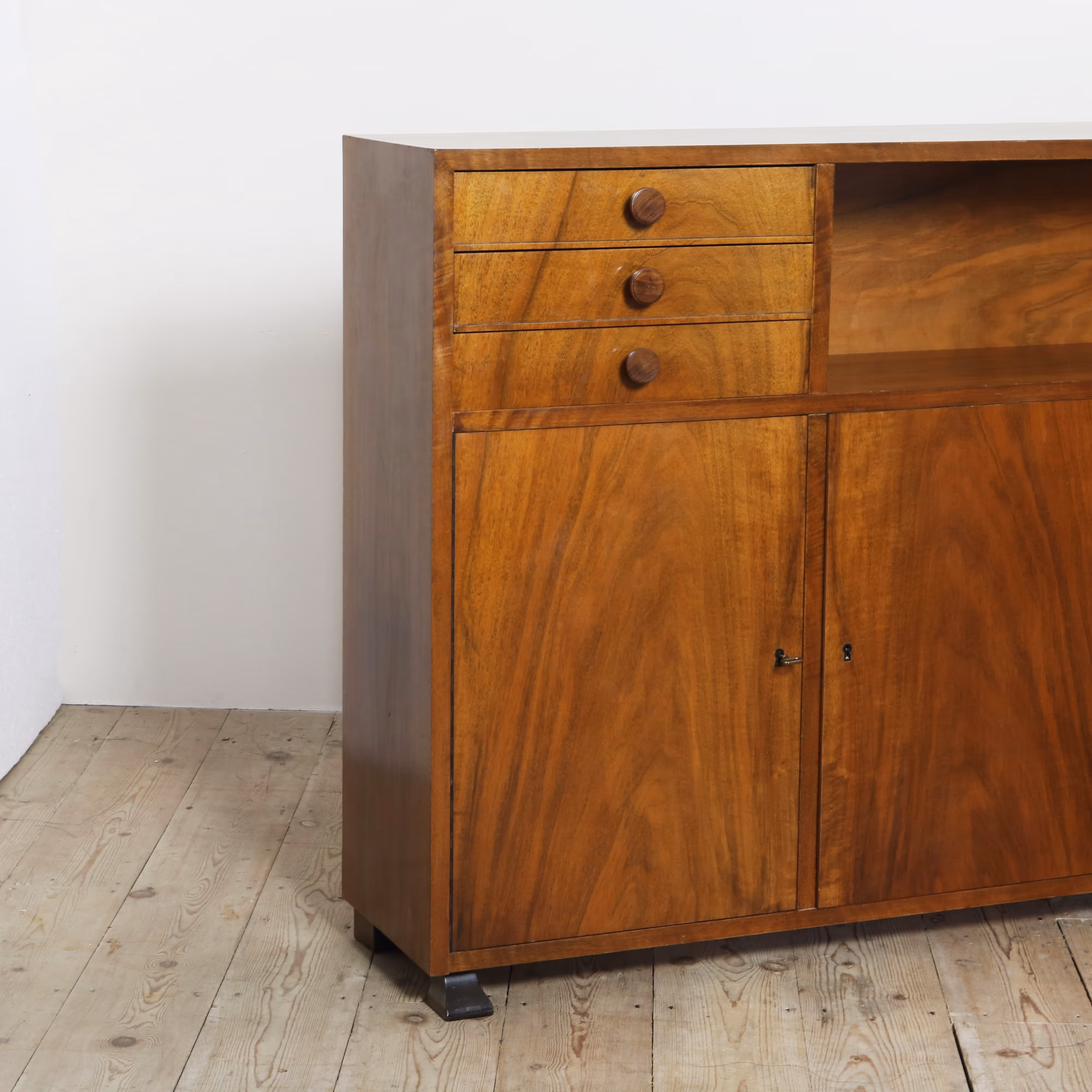 An asymmetrical modernist sideboard / bookcase of useful proportions. Veneered walnut, piano hinges. Elegant feet.