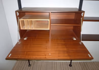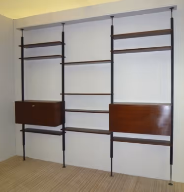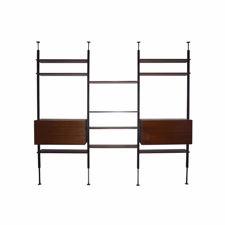 A modular shelving system c. 1960 in the style of George Nelson. Consisting of: - 5x metal uprights in total, adjustable height 265 to 295cm - 12x shelves (rosewood laminate), 96 x 29cm - 2x cabinets (rosewood laminate), W.96 x D.37 x H.43cm The uprights are equipped with a screw system at the top to be secured between floor and ceiling (max height: 295cm). The space between each shelf, and cabinets can be completely adjusted to suit the unit's contents. The cabinets are finished at the back, which means that the unit can be used as a room divider.