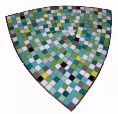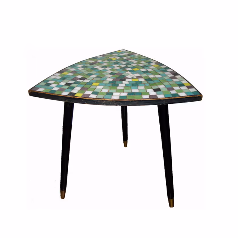 A charming triangle-shaped shaped side table with glass mosaic top and black stiletto legs with gold sabots