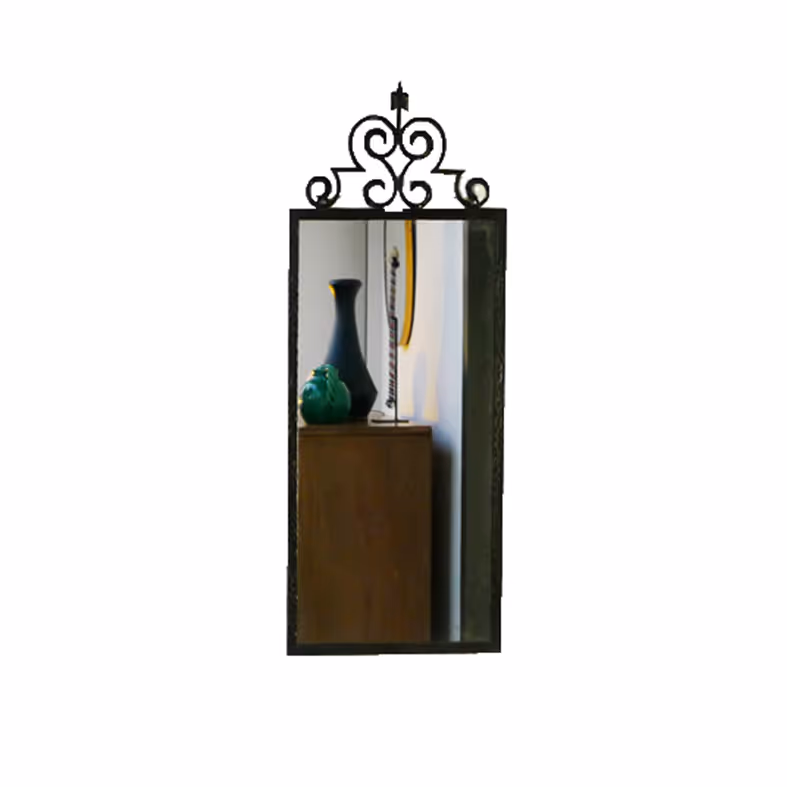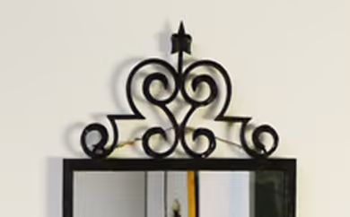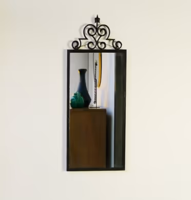 A rectangular black iron mirror with curlicue and ivy detail at top.