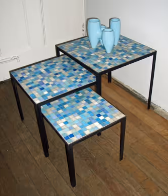 A nest of mosaic-tiled tables with cast iron bases, the glass mosaic tiles a wonderful mix of turquoise, medium blue, grey and white.