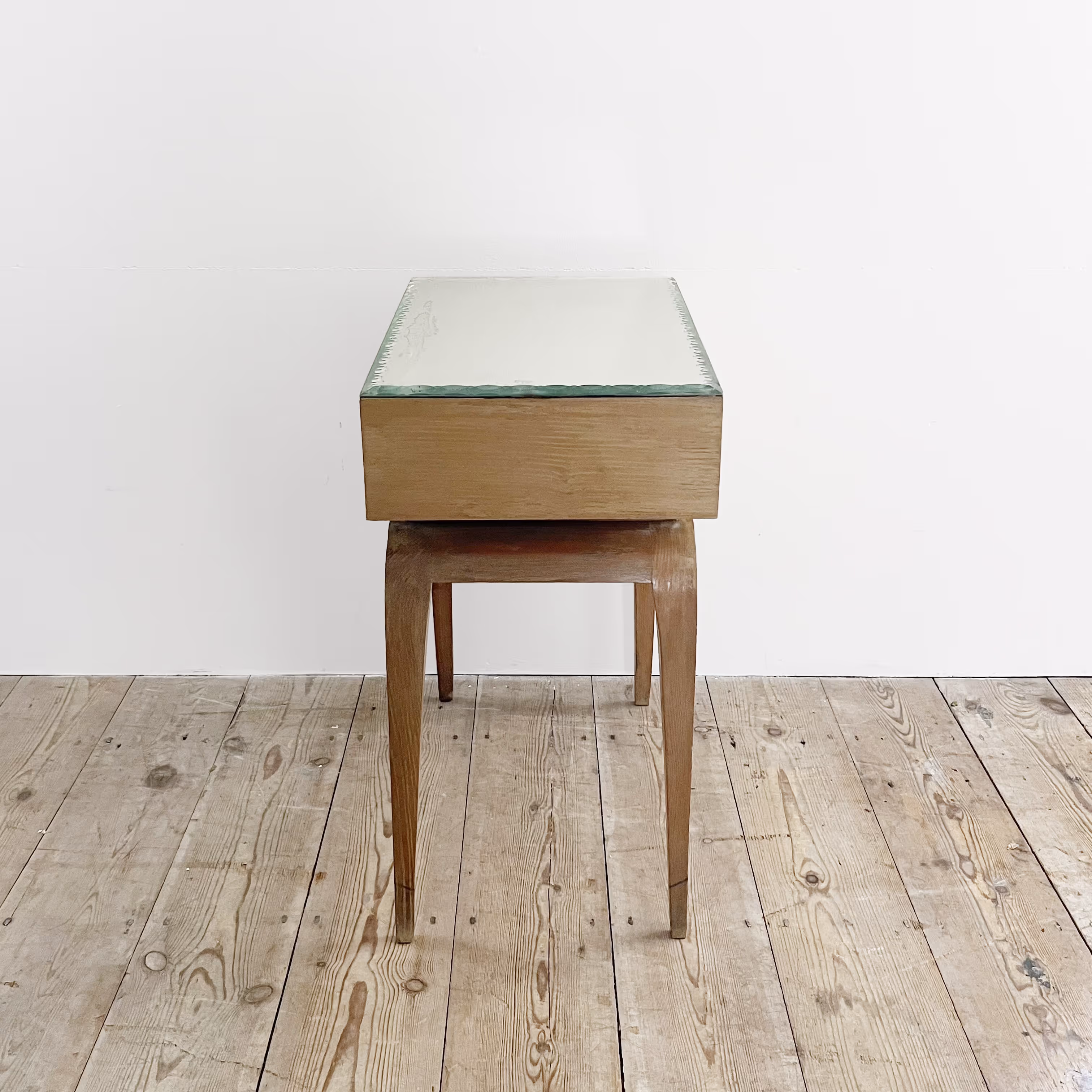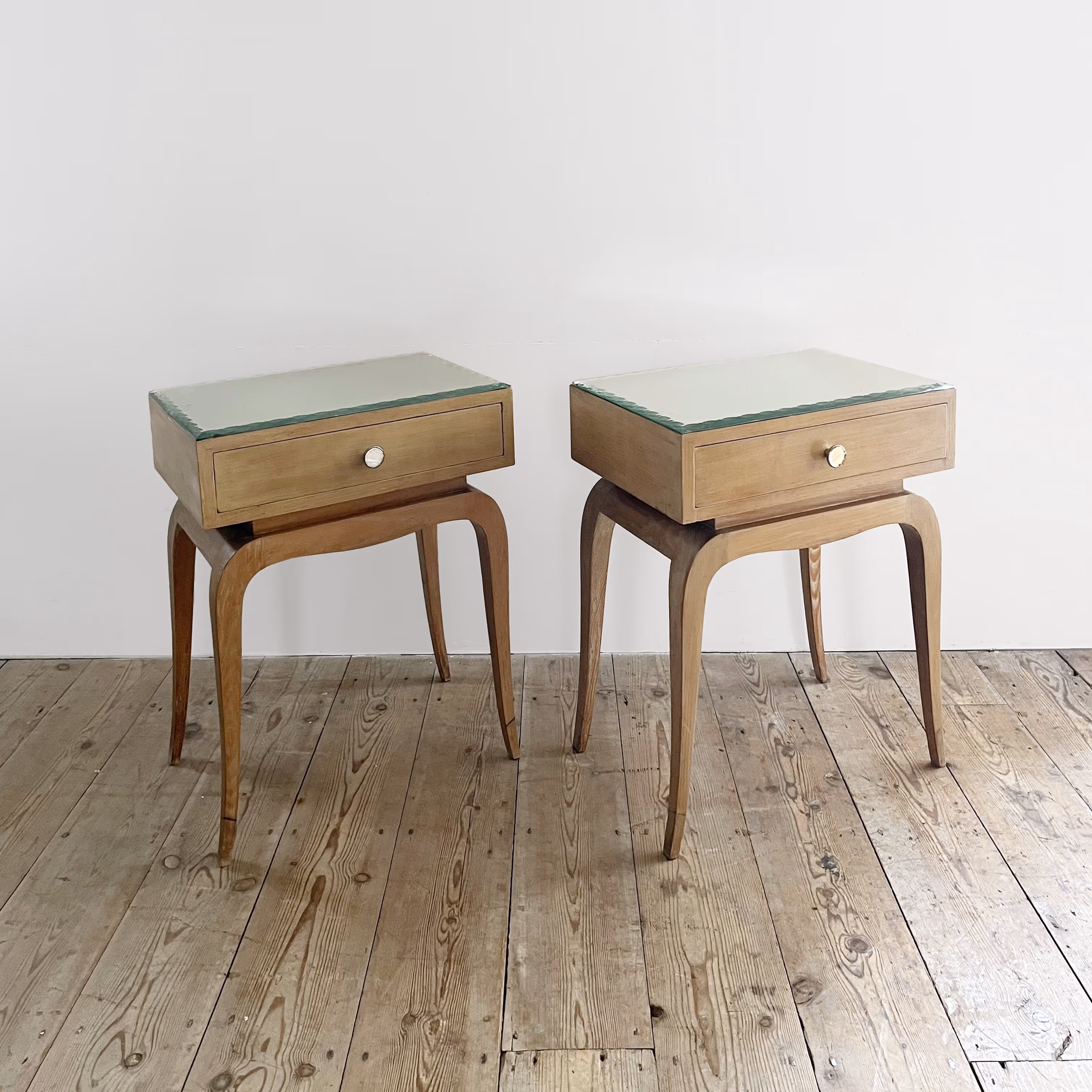 Pair of ash bedside tables. Serpentine legs, original mirror tops (a couple of nibbled corners, see pictures) and mirror pull on the drawer.