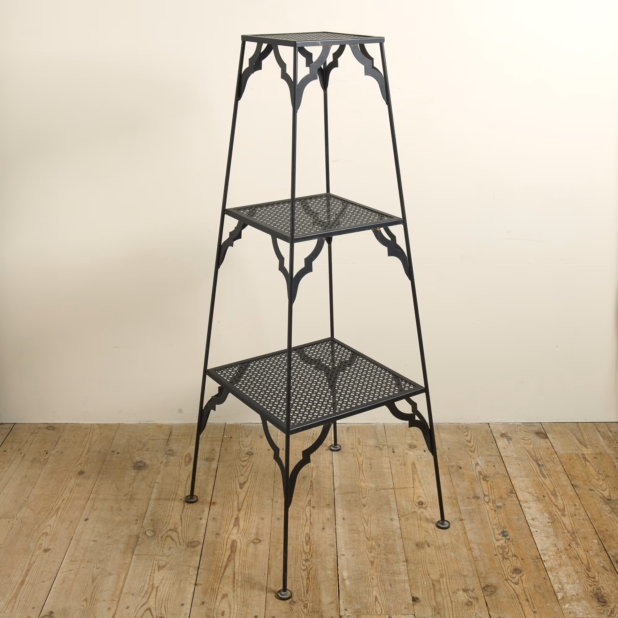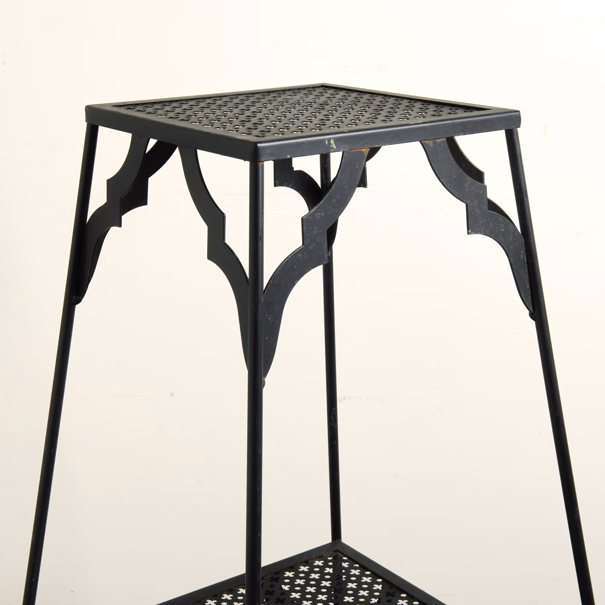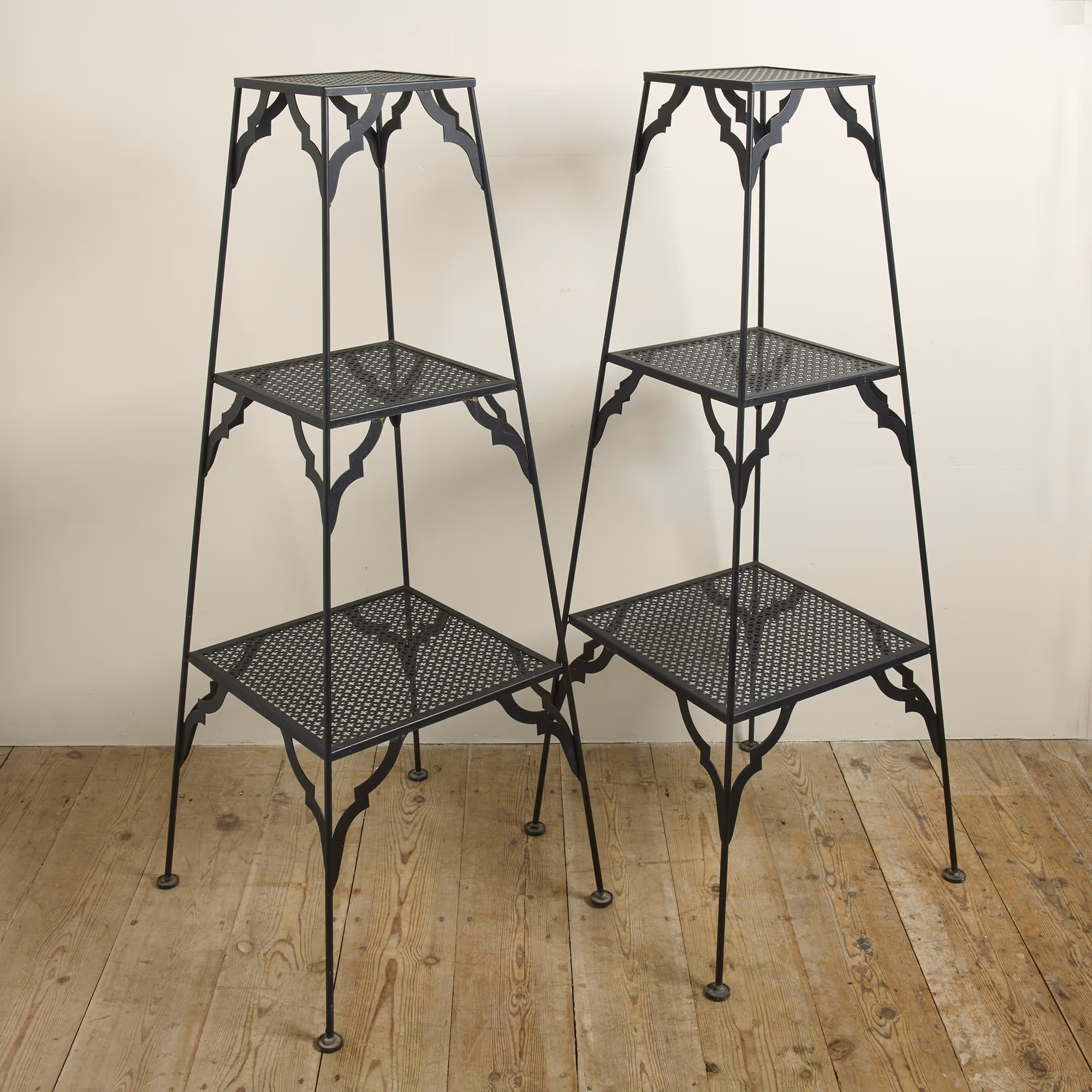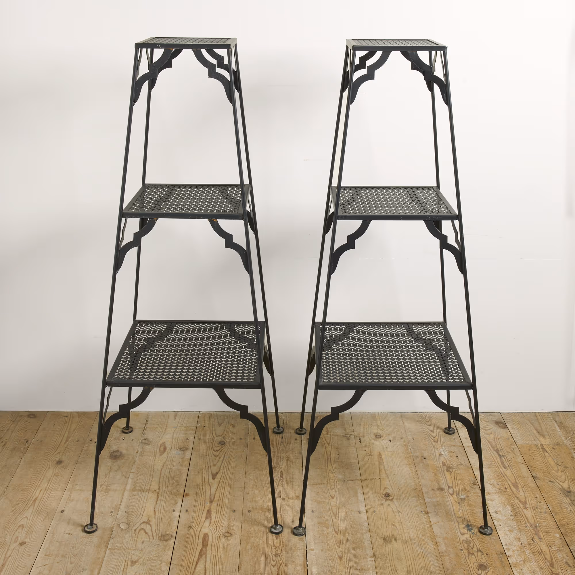 Pair of black, perforated metal shelf stands. Later re-sprayed.