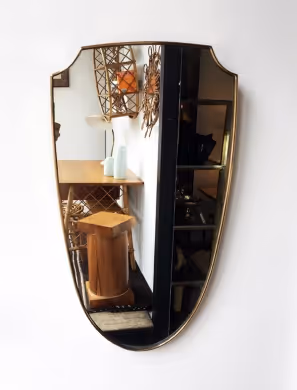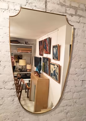 A pair of shield-shaped mirrors in the manner of Gio Ponti. Thin brass frames.