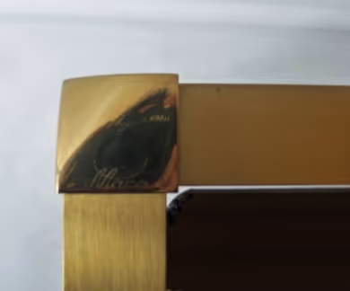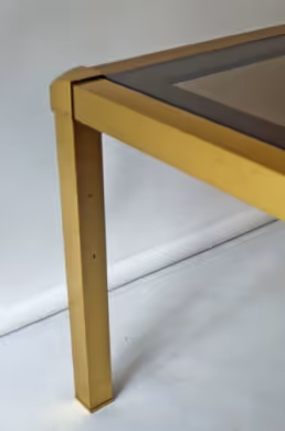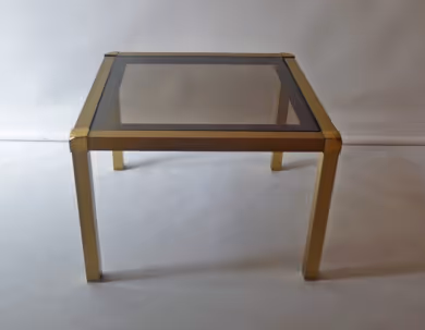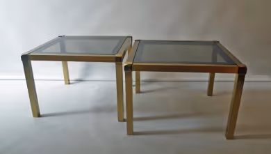 A pair of brushed brass side tables with smoky glass tops. Signed 'MARA' to one corner of each table