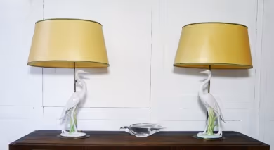 A pair of ceramic crane table lamps with original card shades. Possibly Maison Jansen. Rewired & PAT-certified