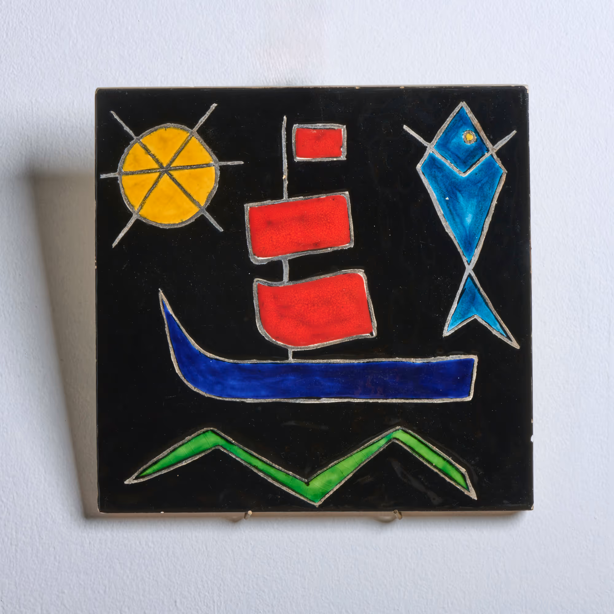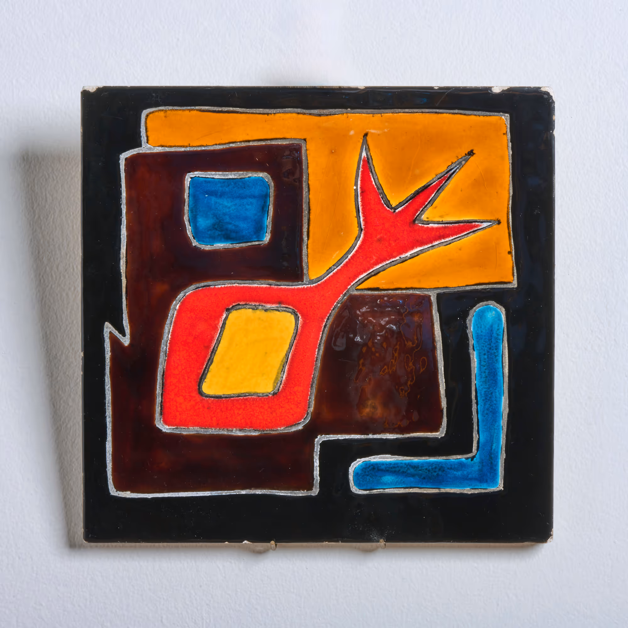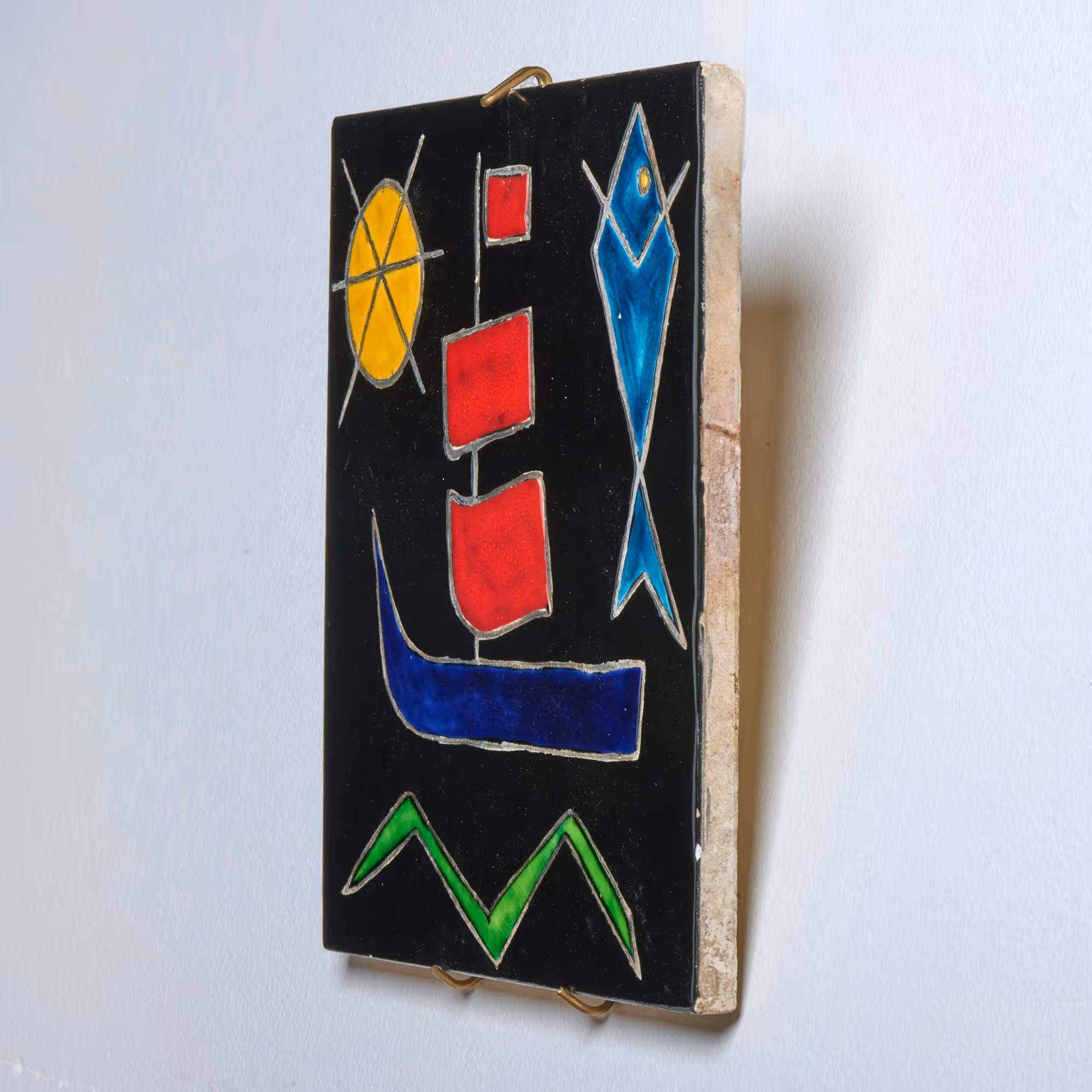 Pair of hand-decorated ceramic tiles with semi-abstract subjects. Unsigned.