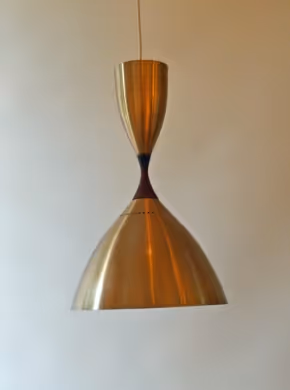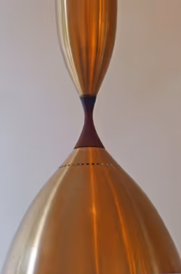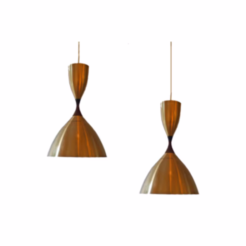 A pair of brushed copper pendant lights with teak inserts. Price includes rewiring and PAT-certification