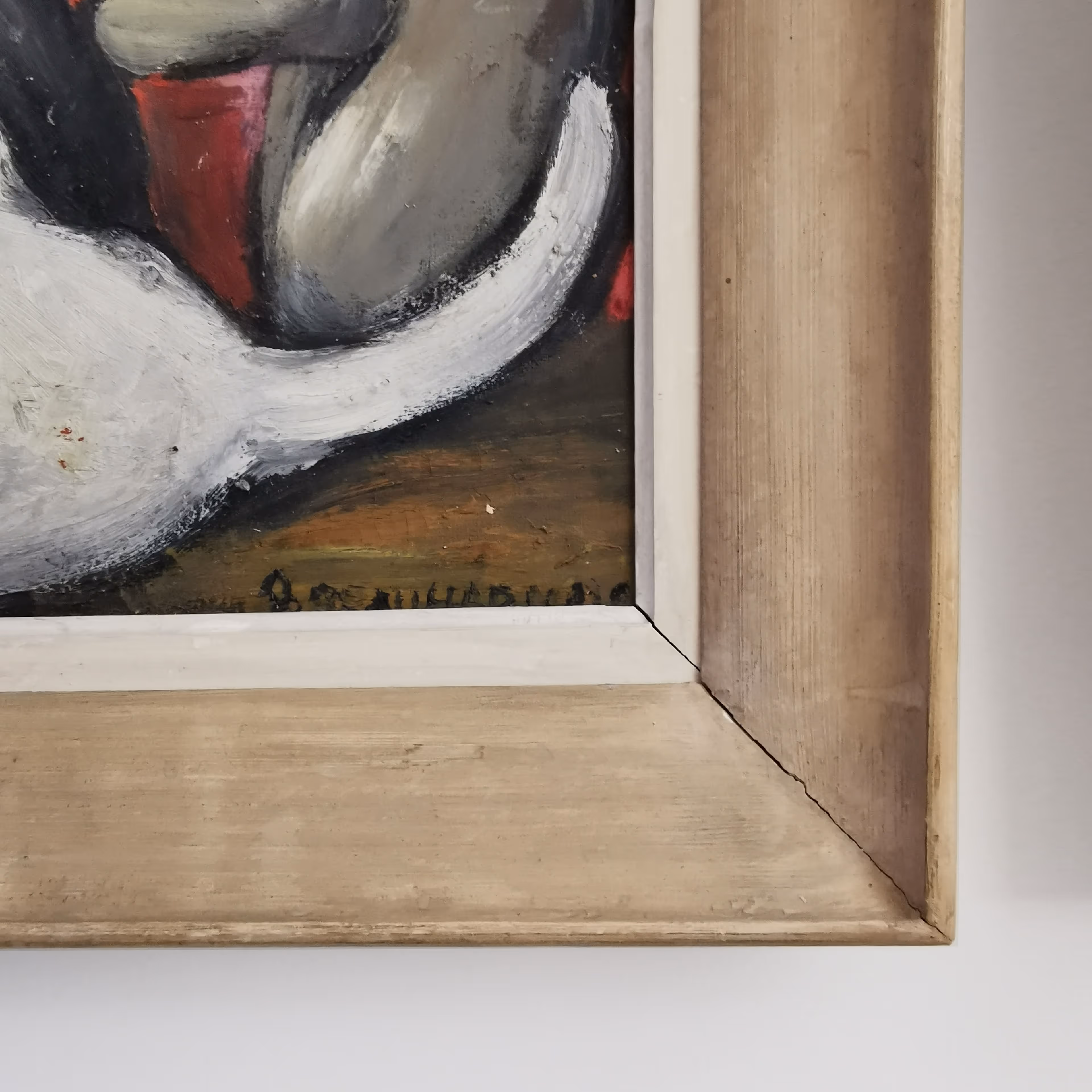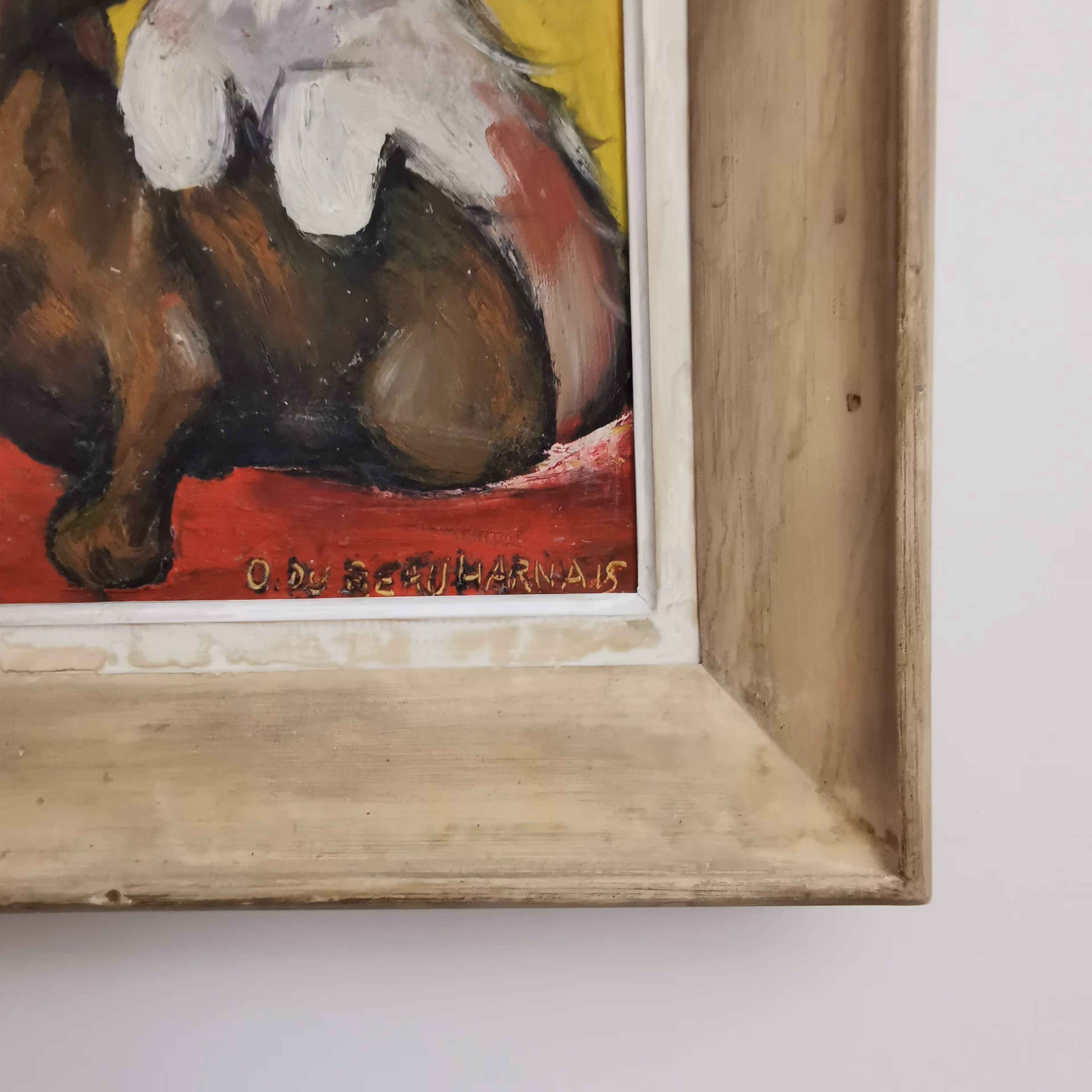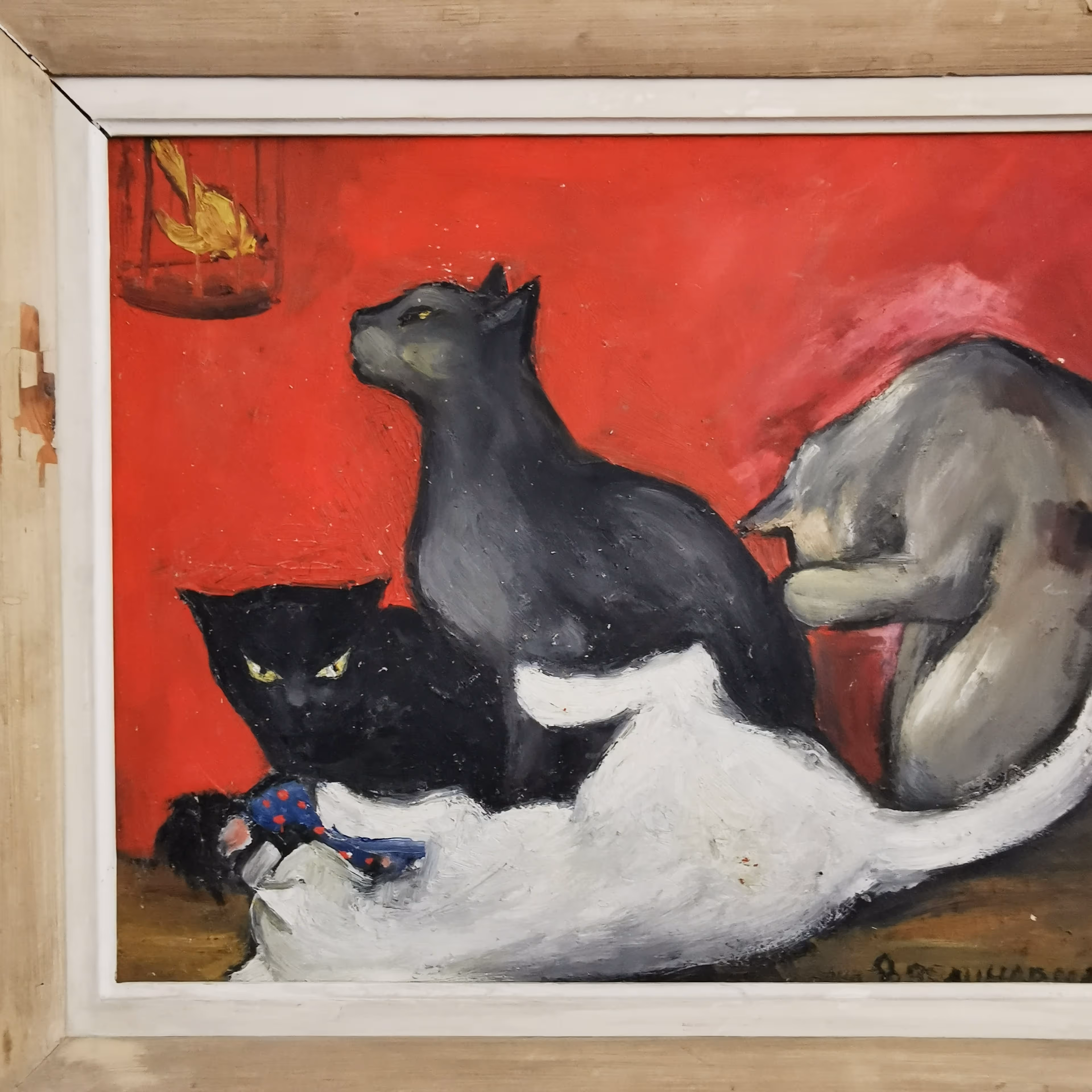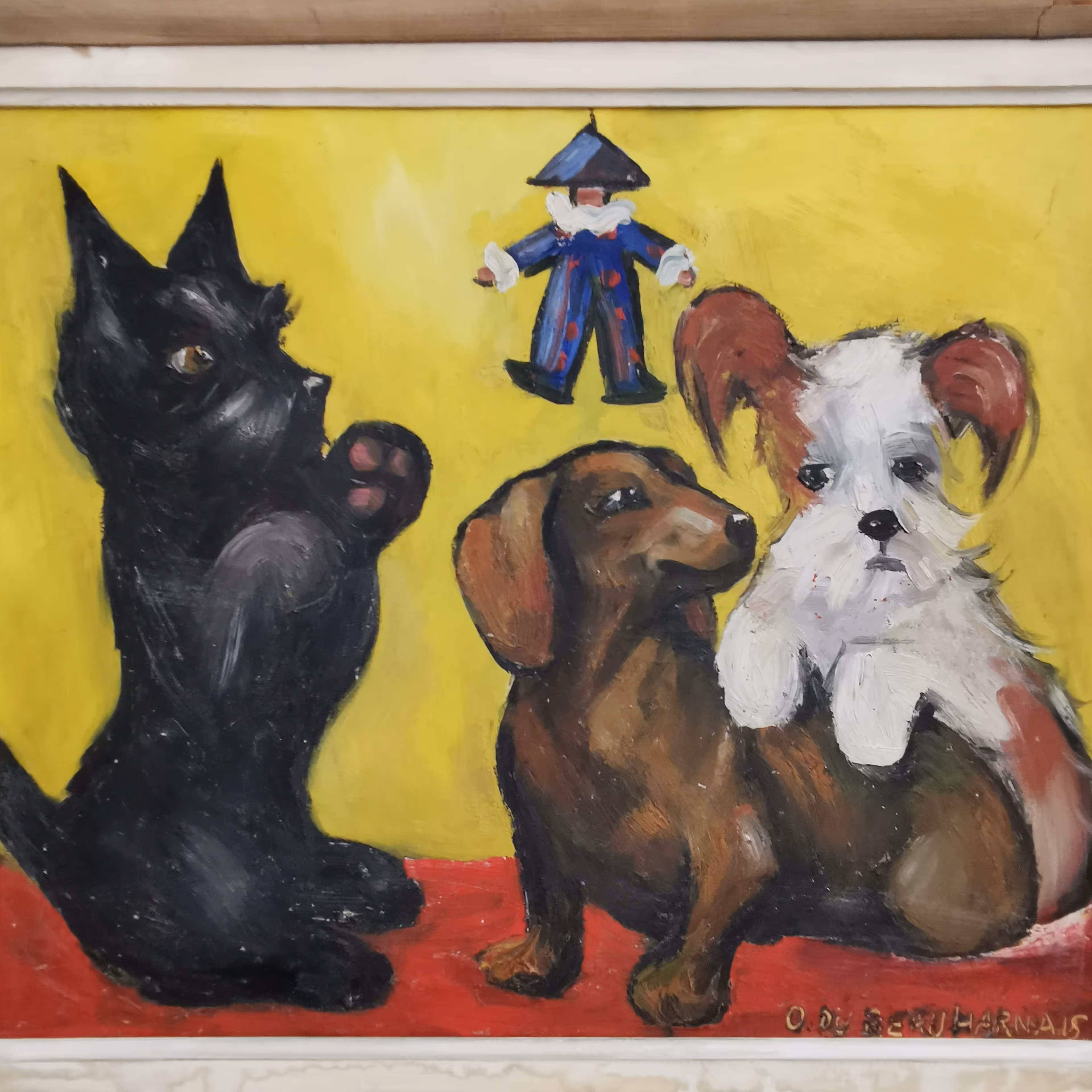 Pair of dogs and cats paintings. Oil on canvas, original frames. Very well executed by an assured hand, these paintings capture the animal's expressions wonderfully. One painting depicting dogs, the other one cats, both having in common the same harlequin puppet.