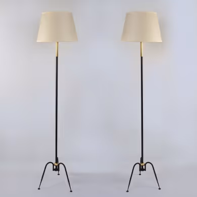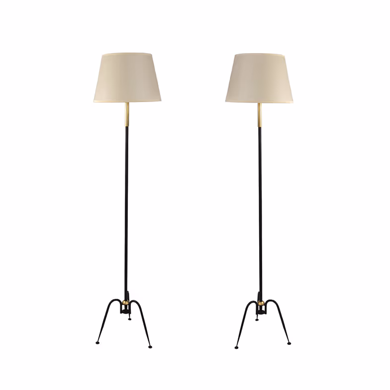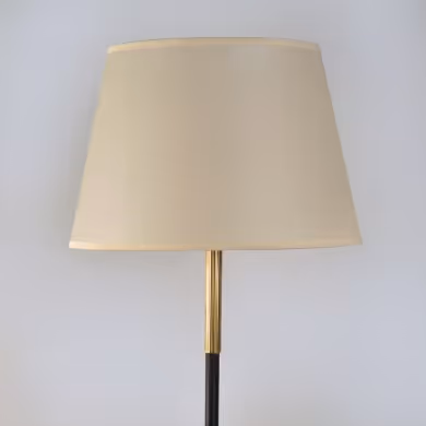 An elegant pair of black and brass floor lamps with fluted detailing and bespoke shades. Rewired & PAT-certified