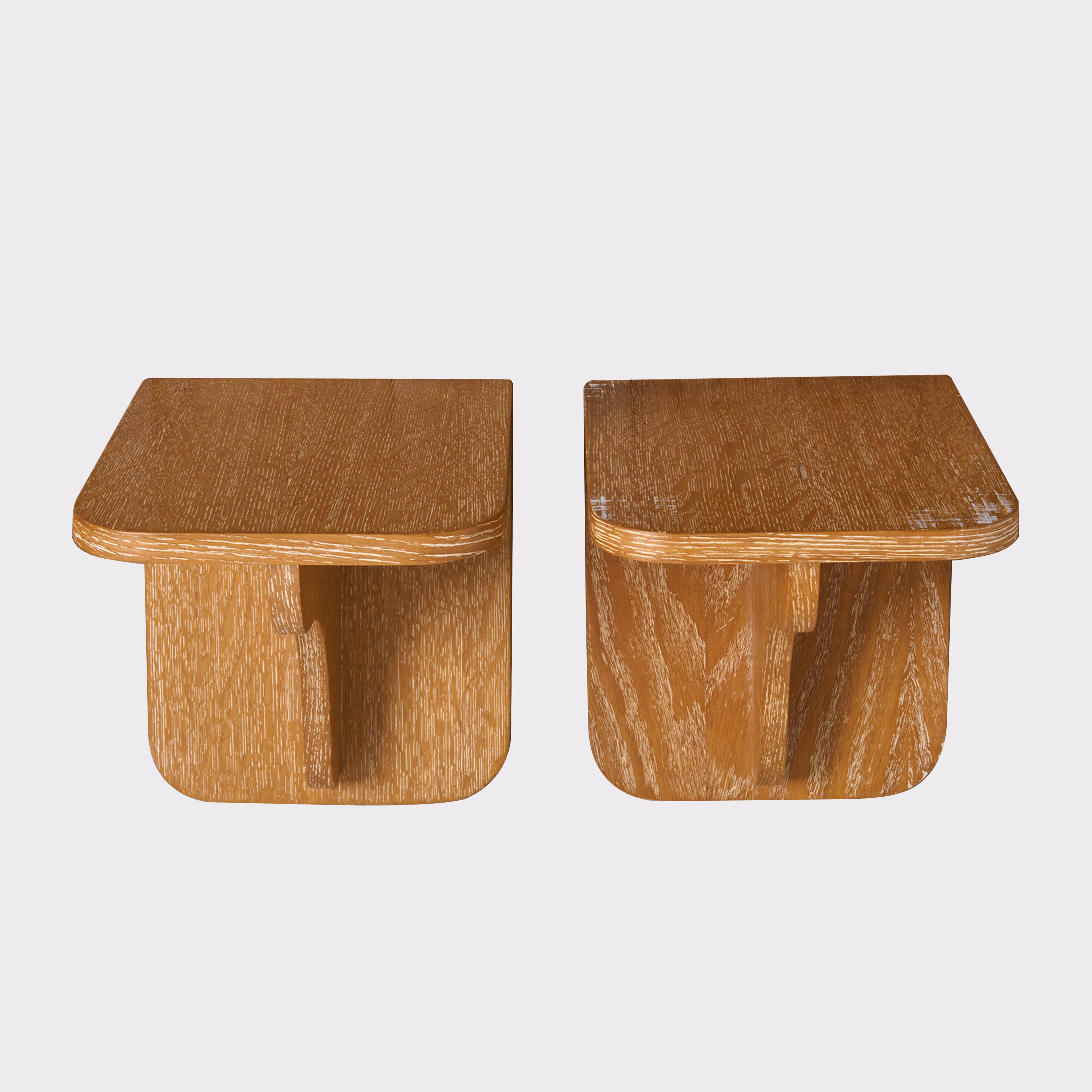 Pair of flying bedside shelves in solid limed oak. Great wall-attached solution for a smaller bedroom.
